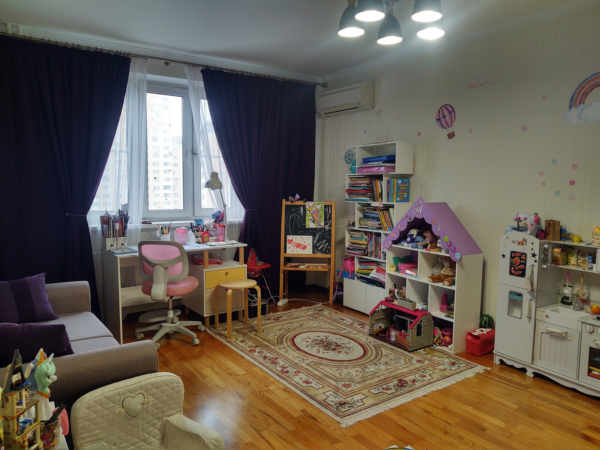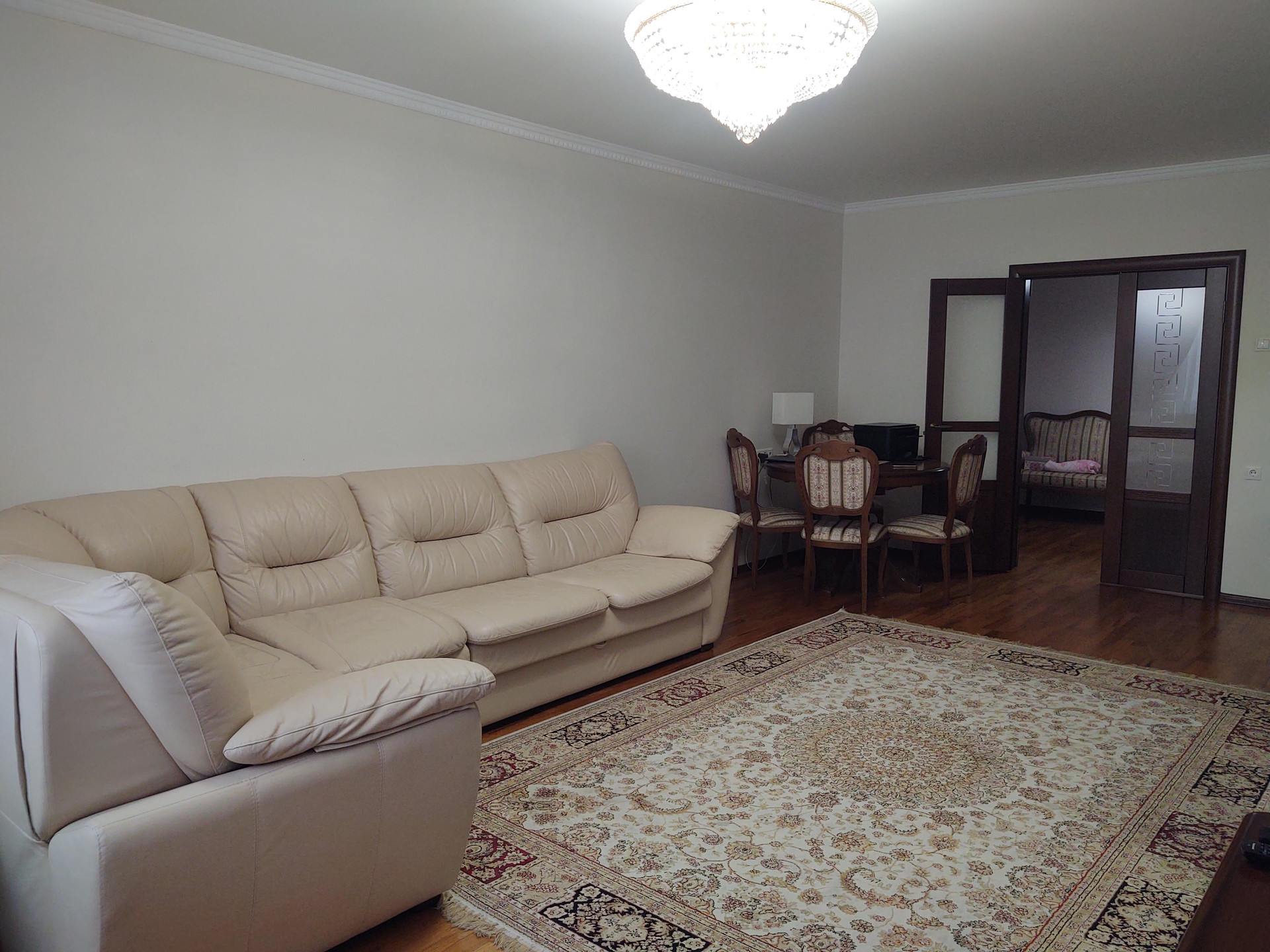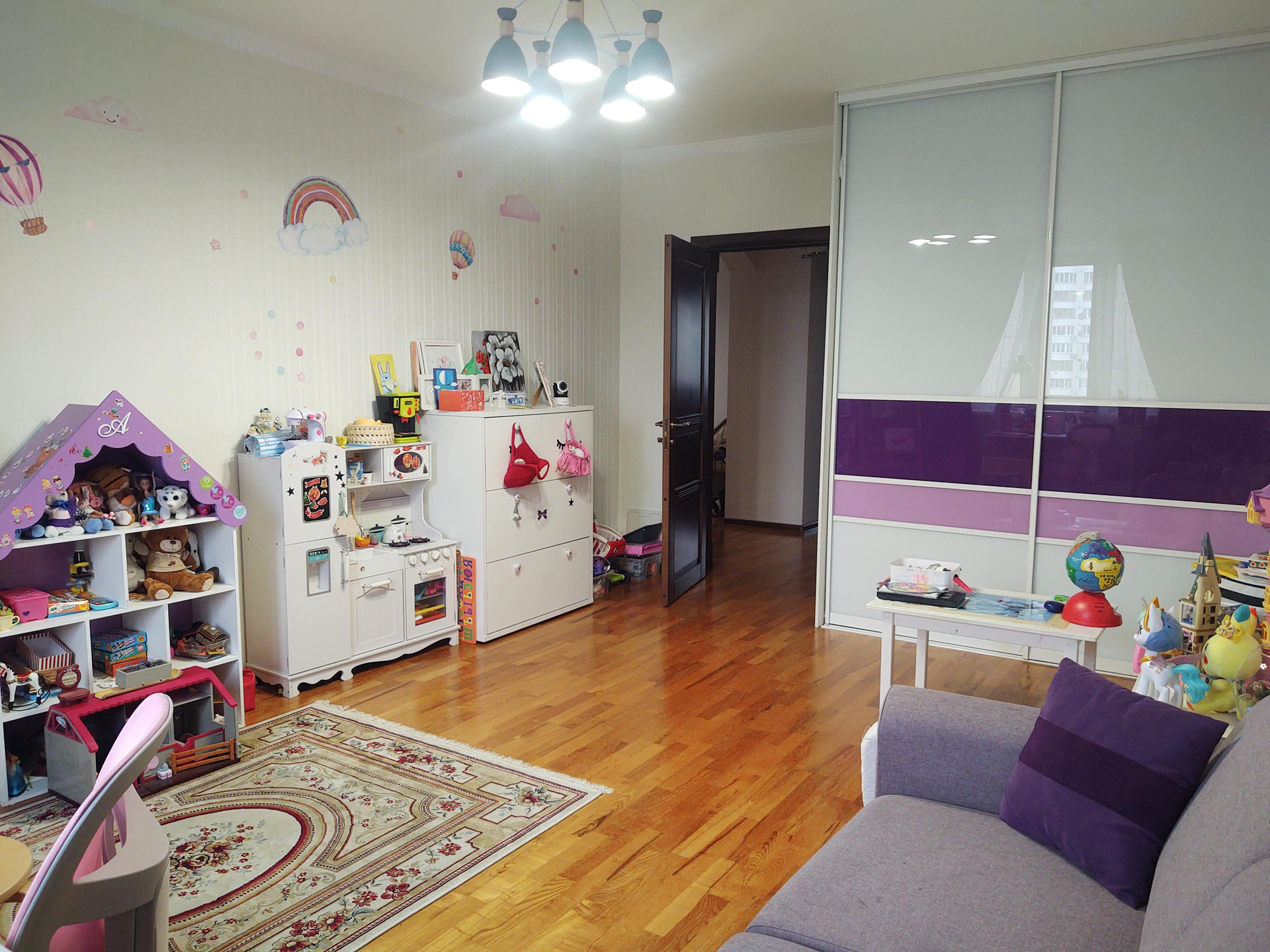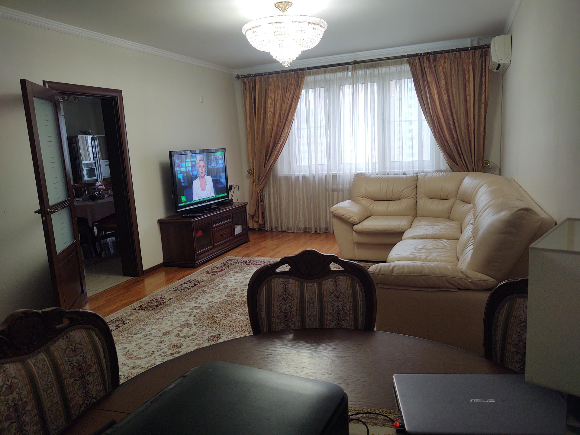 Продается красивая трехкомнатная квартира, общая площадь 130 кв метров, 14 этаж 25 этажного панельного дома, серия П44-ТМ-25.  Просторная кухня 21 кв метр, жилая 65 кв метров, 2 санузла, кладовка-постирочная. Есть застекленный балкон. Выполнен качественный ремонт с использованием дорогих материалов (обои, паркетная доска, плитка). Теплый пол на балконе, кондиционеры в каждой комнате и на кухне.