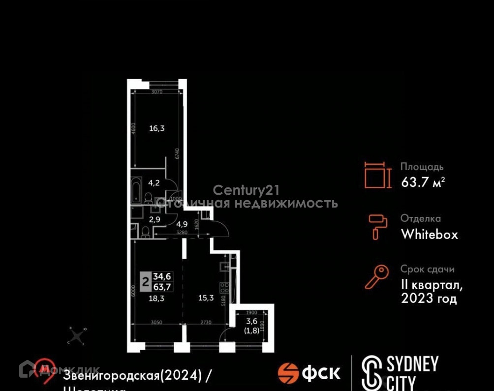2-комнатная квартира, 63 м2, этаж 5 / 23, на продажу в Москве, Шелепихинская набережная, 40к2