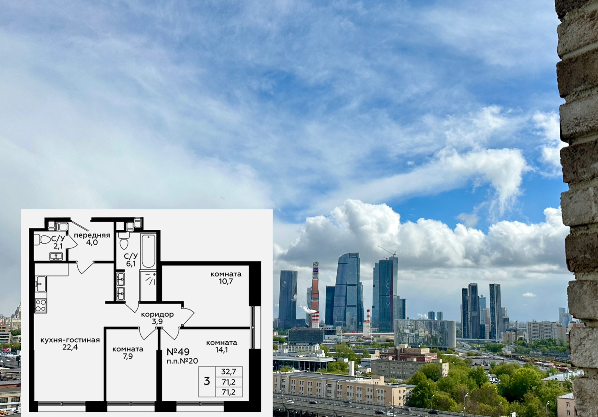 Видовой апартамент 71 метр с 4 панорамными окнами и открытыми видами на Москва-Сити и город!