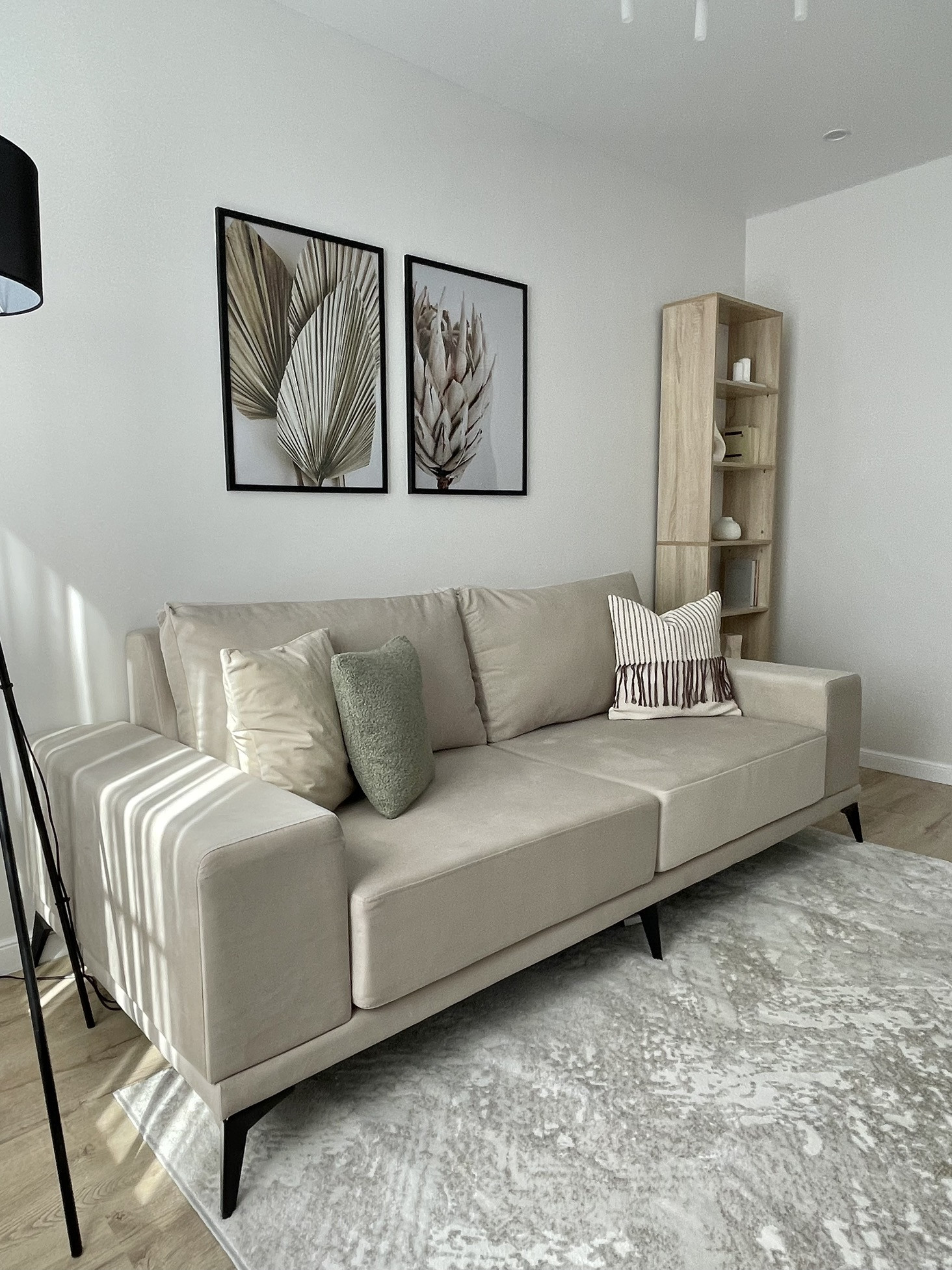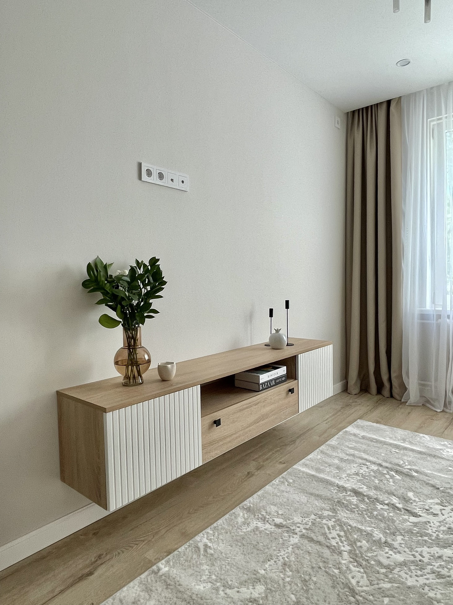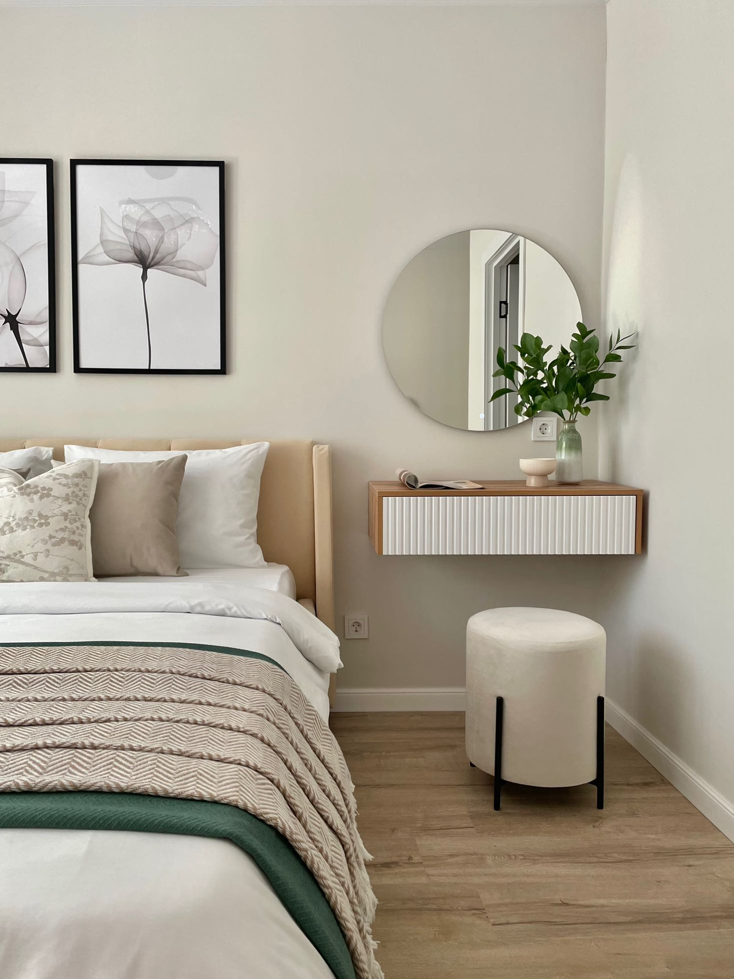 Интерьер квартиры в светлых бежевых пастельных оттенках с зелеными деталями создает ощущение природы, уюта и расслабления. Современные дизайнерские решения и продуманная до мелочей планировка создают комфортное для жизни пространство.