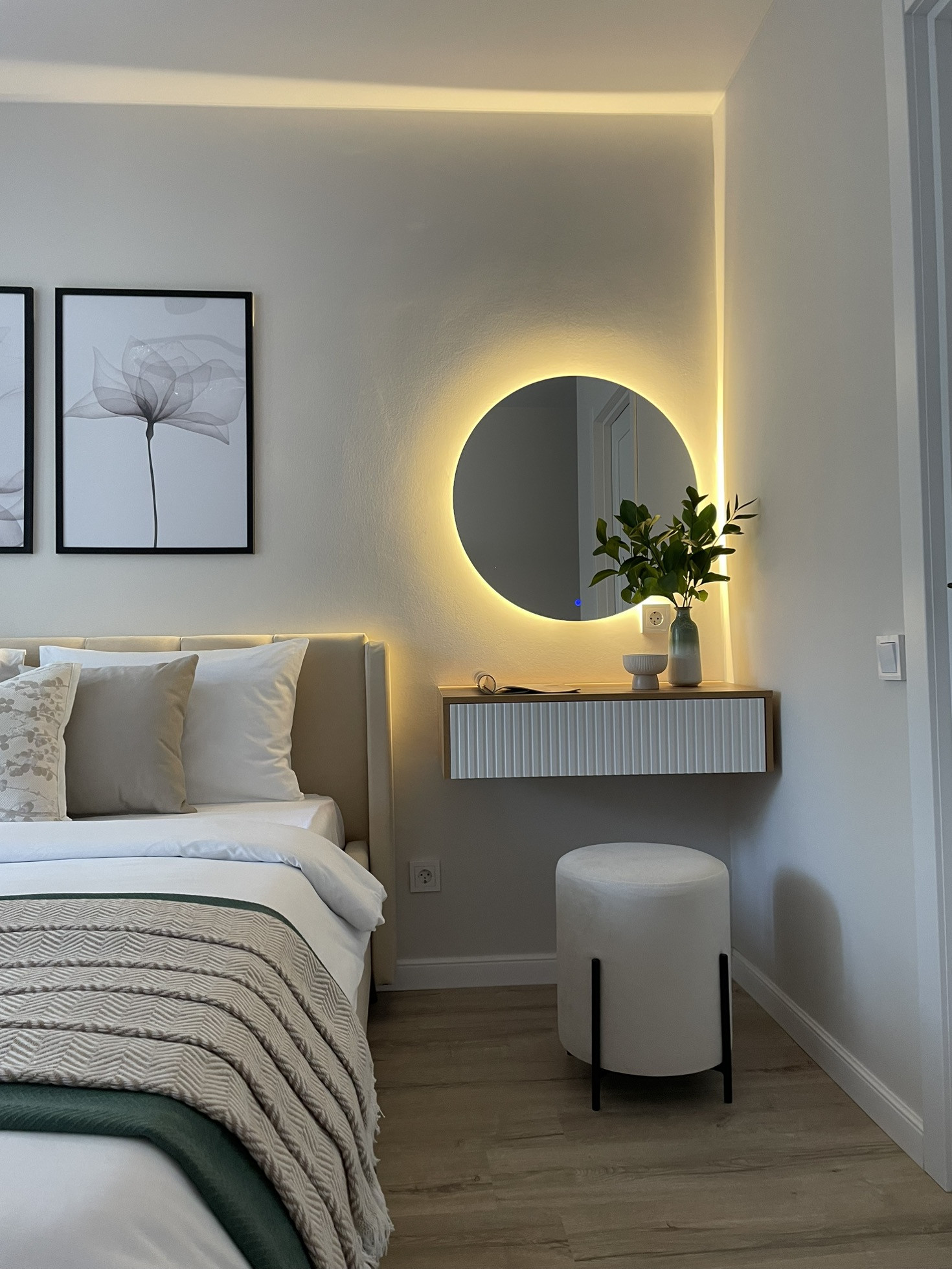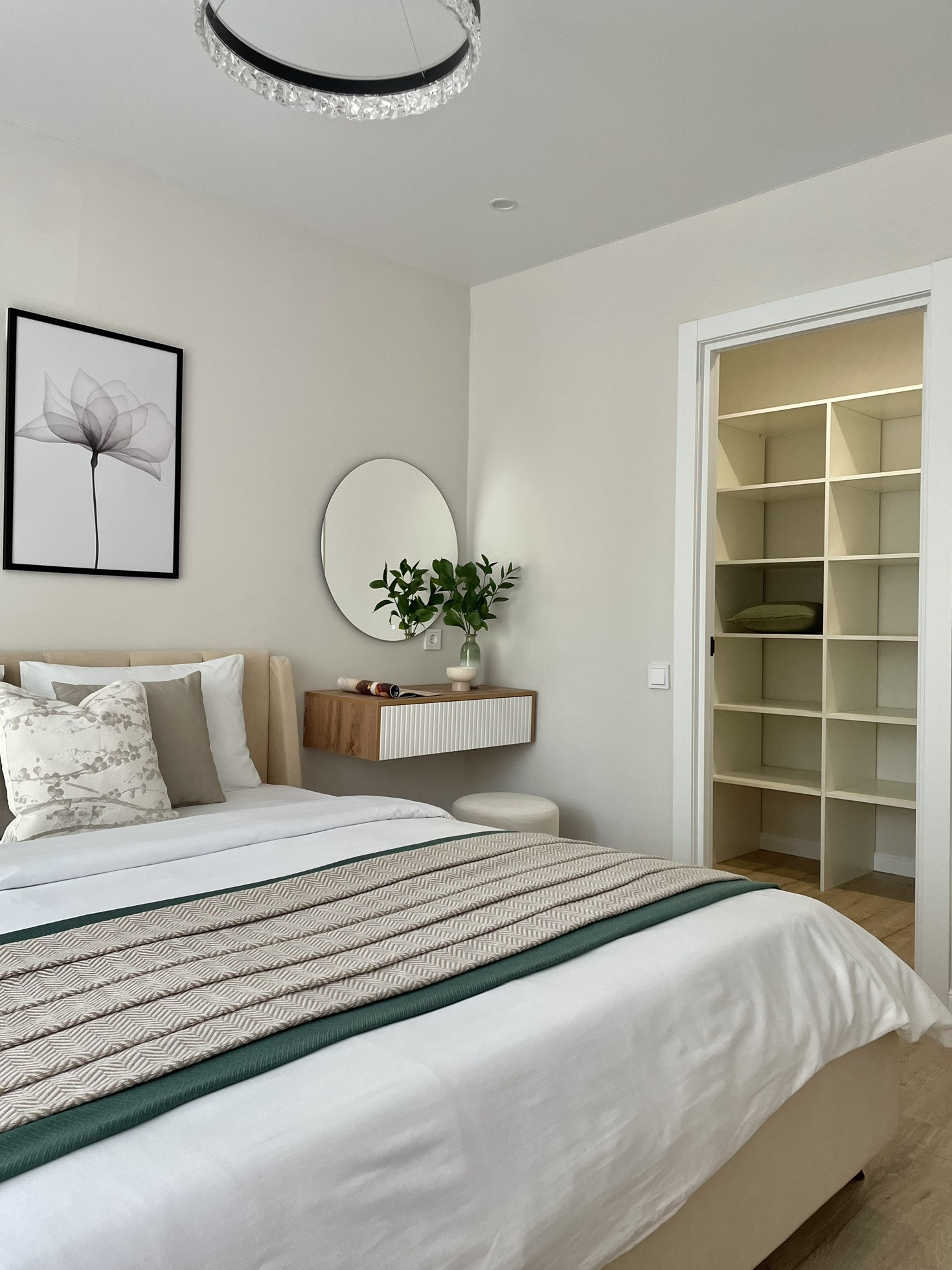 В спальне расположена современная двуспальная кровать с мягким изголовьем и подъемным механизмом, позволяющим использовать пространство под ней в качестве дополнительного места хранения. Просторная гардеробная оборудована полками, рейлами и зеркалом, и позволяет с удобством разместить одежду и обувь, чемоданы, пылесос и гладильную доску.