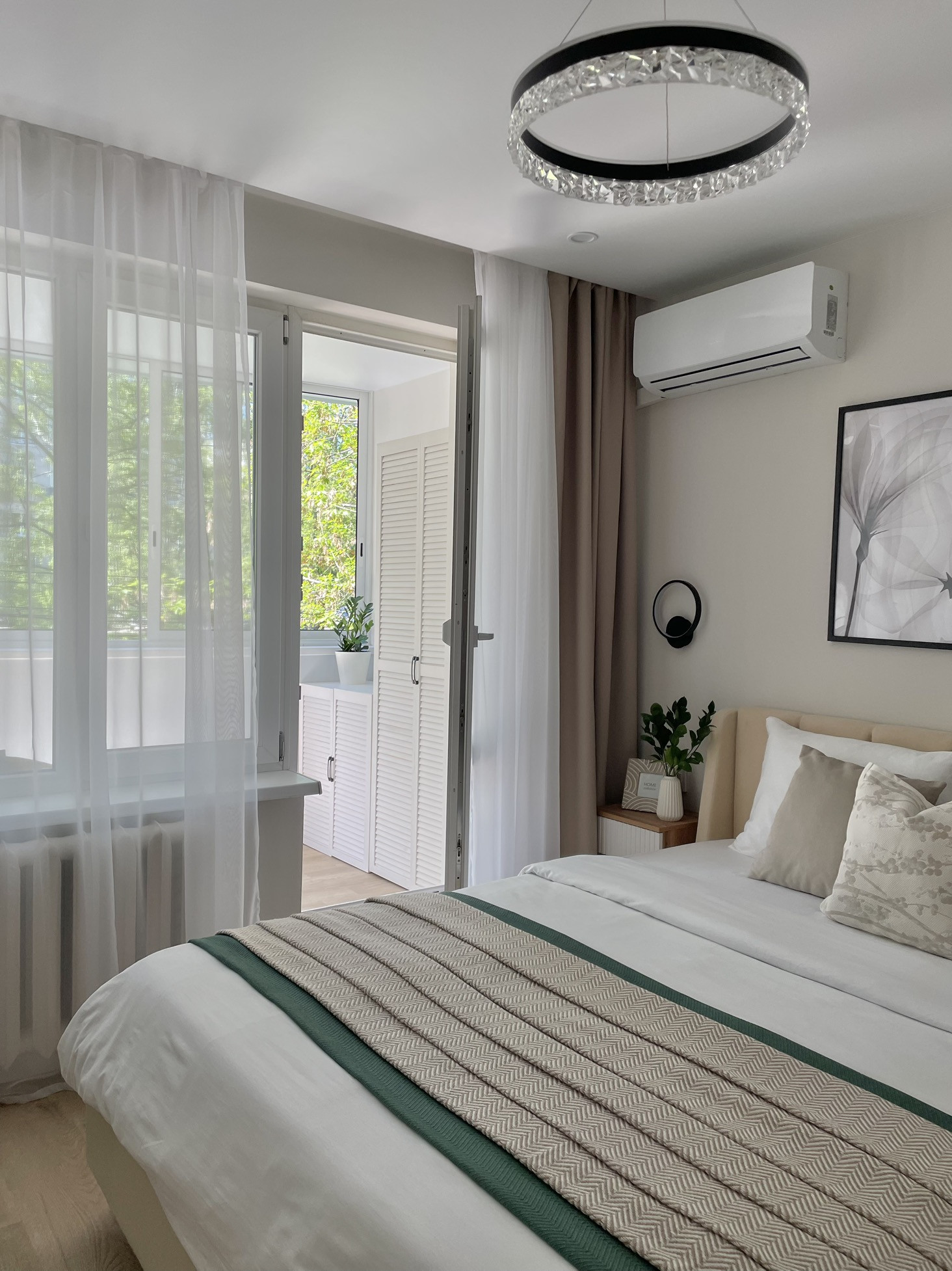 Выделенная спальня с собственной оборудованной гардеробной и кондиционером , и выходом на светлый большой балкон, где можно проводить время наслаждаясь закатами или выпить чашку кофе утром перед работой.
