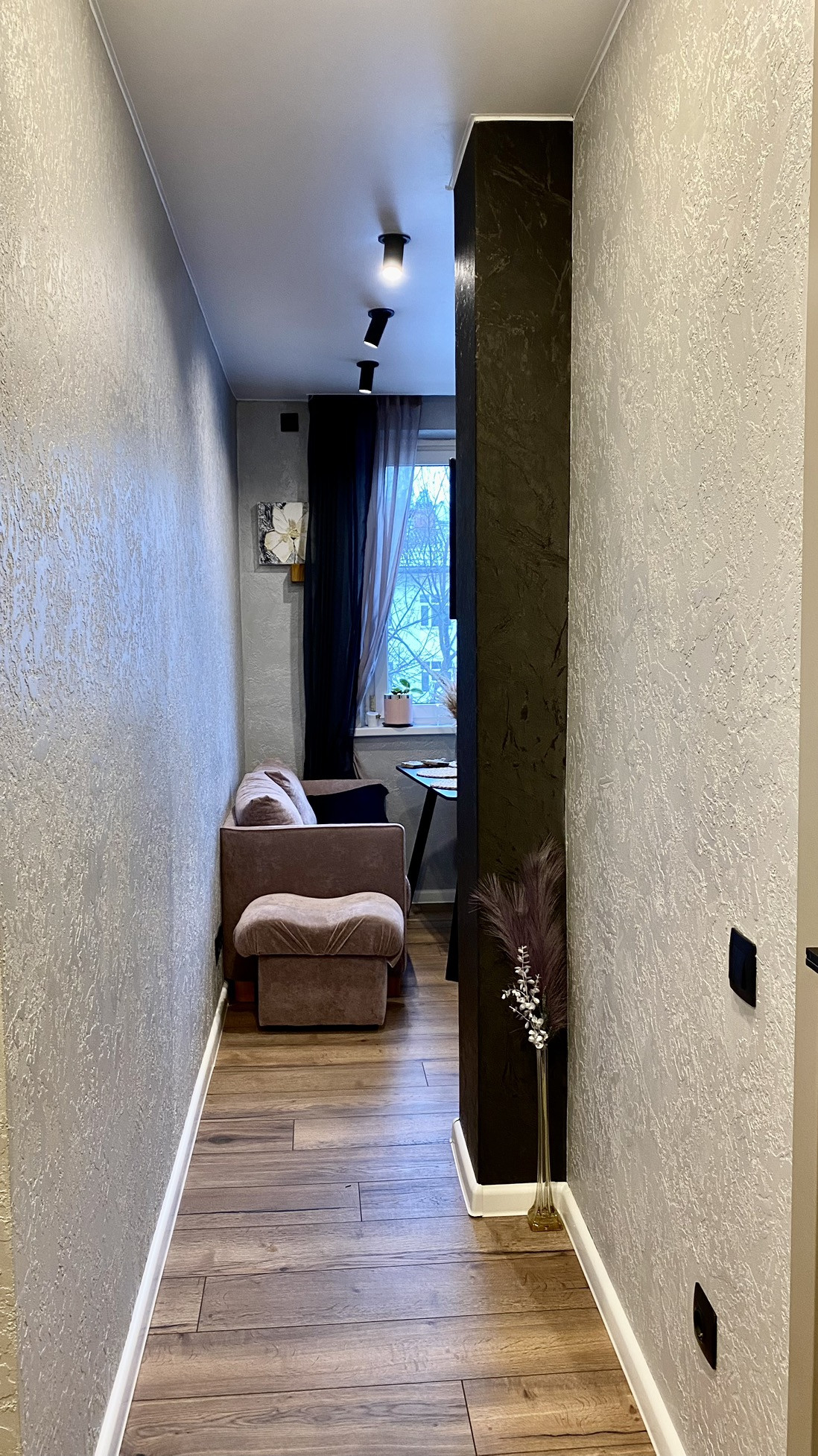Стены отделаны декоративной штукатуркой, обоев нет.