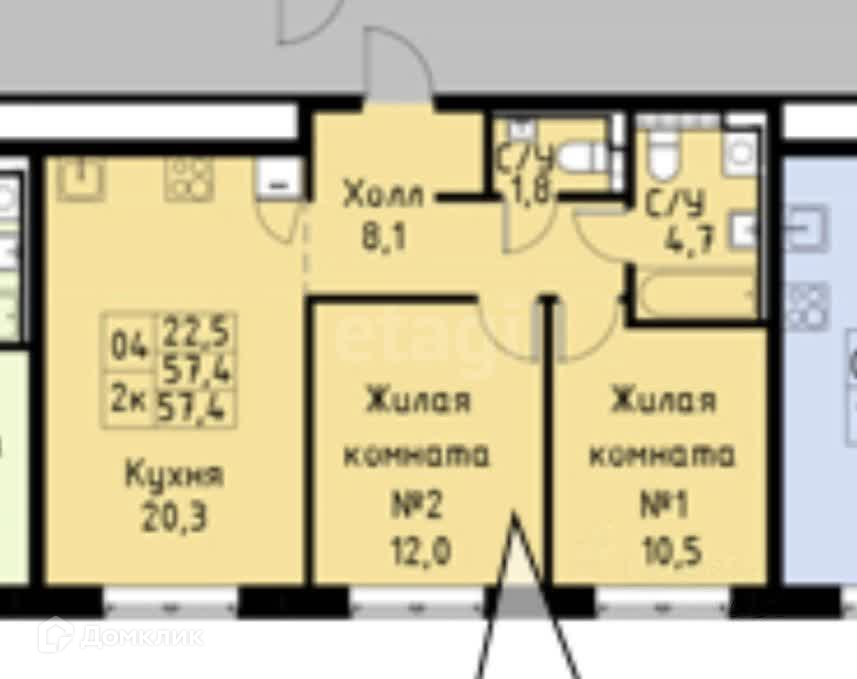 Общая площадь 57.4 м2