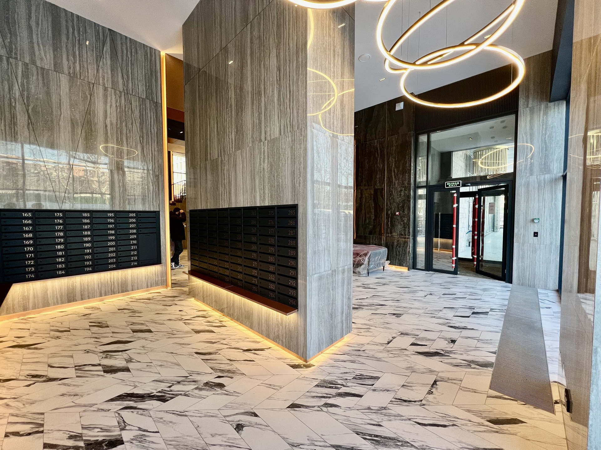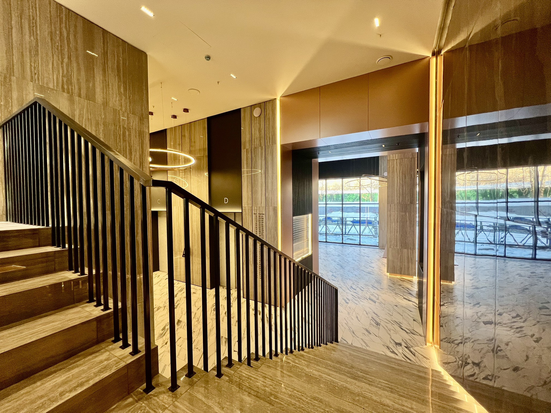 На первом этаже  двухуровневое лобби с лаунж-зоной, дизайнерской мебелью и стойкой ресепшн. В каждом подъезде постаматы и колясочные. Для жителей предусмотрен подземный паркинг с системой для мойки колес. Интерьеры общественных зон разработаны в архитектурным бюро HAAST.