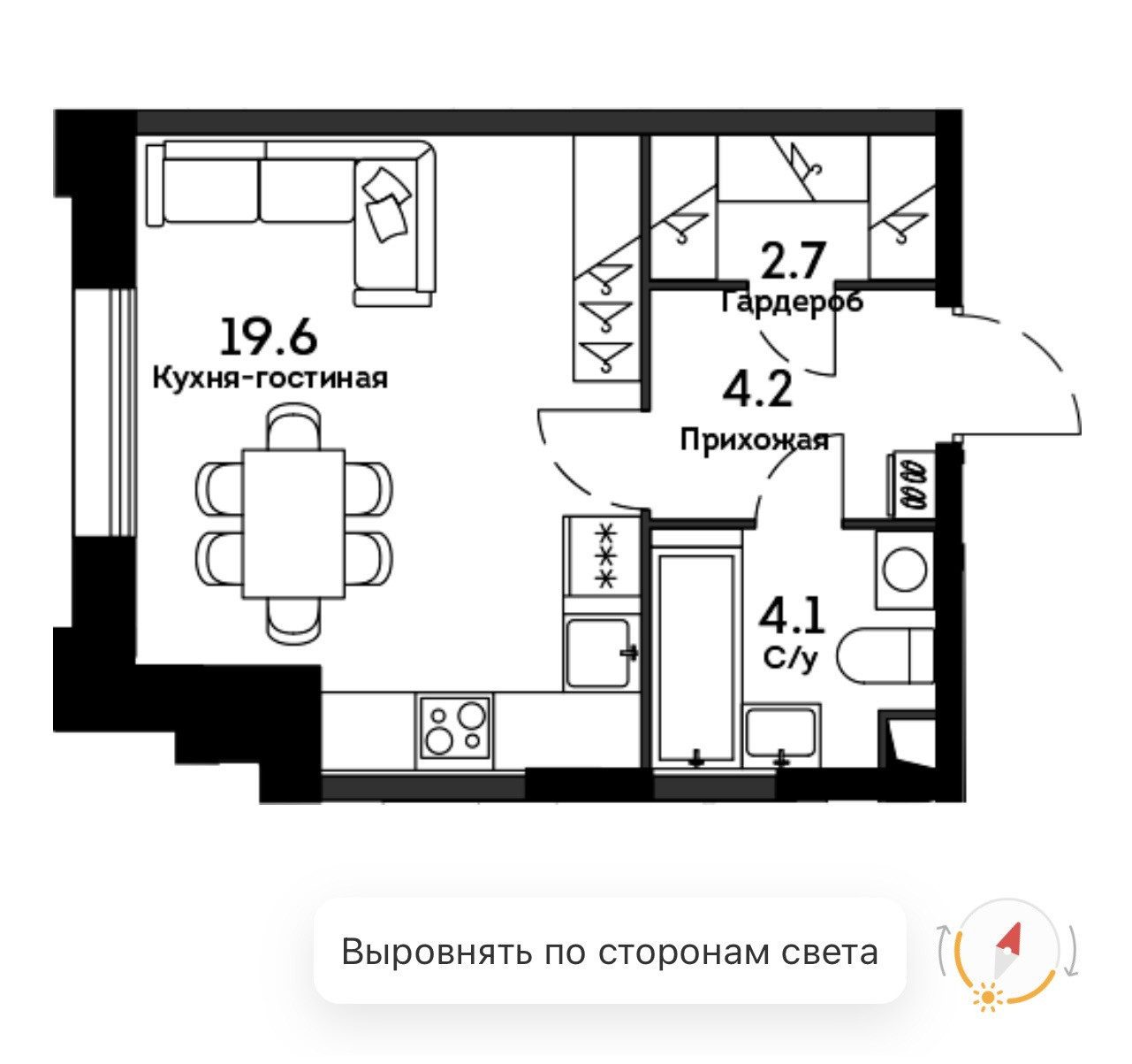 Жилая площадь 19.6 м2