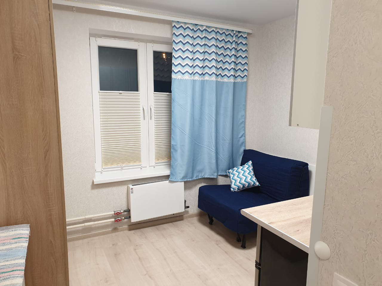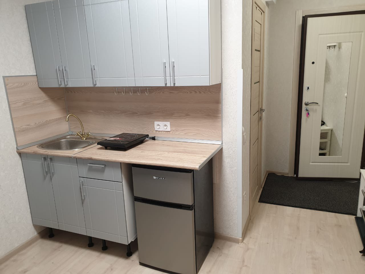 Общая площадь студии – 12,7 м2, санузел совмещен. Высота потолков 2.7м. Произведен Евроремонт.