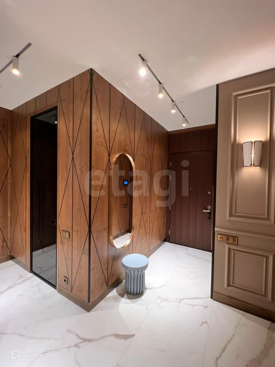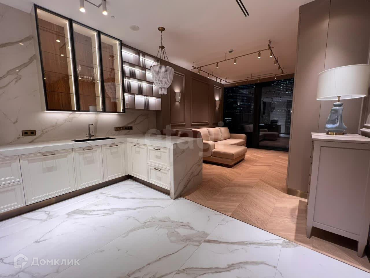 Квартира выполнена в премиальной отделке: использовано сочетание австрийского дубового паркета с сучками в раскладке "французская елка" и керамогранита от итальянской фабрики Cotto D'Este, установлен американский импортированный свет (свет в гостиной Airene, в спальне - Ralph Lauren). Также в отделке апартамента использована латунь, все изделия изготавливались по эскизам дизайнера под заказ. Мягкая панель в спальне ручной работы, премиальный матрас Grether&Wells. Диван Mobel Zeit в обивке из натурального итальянского хлопка.