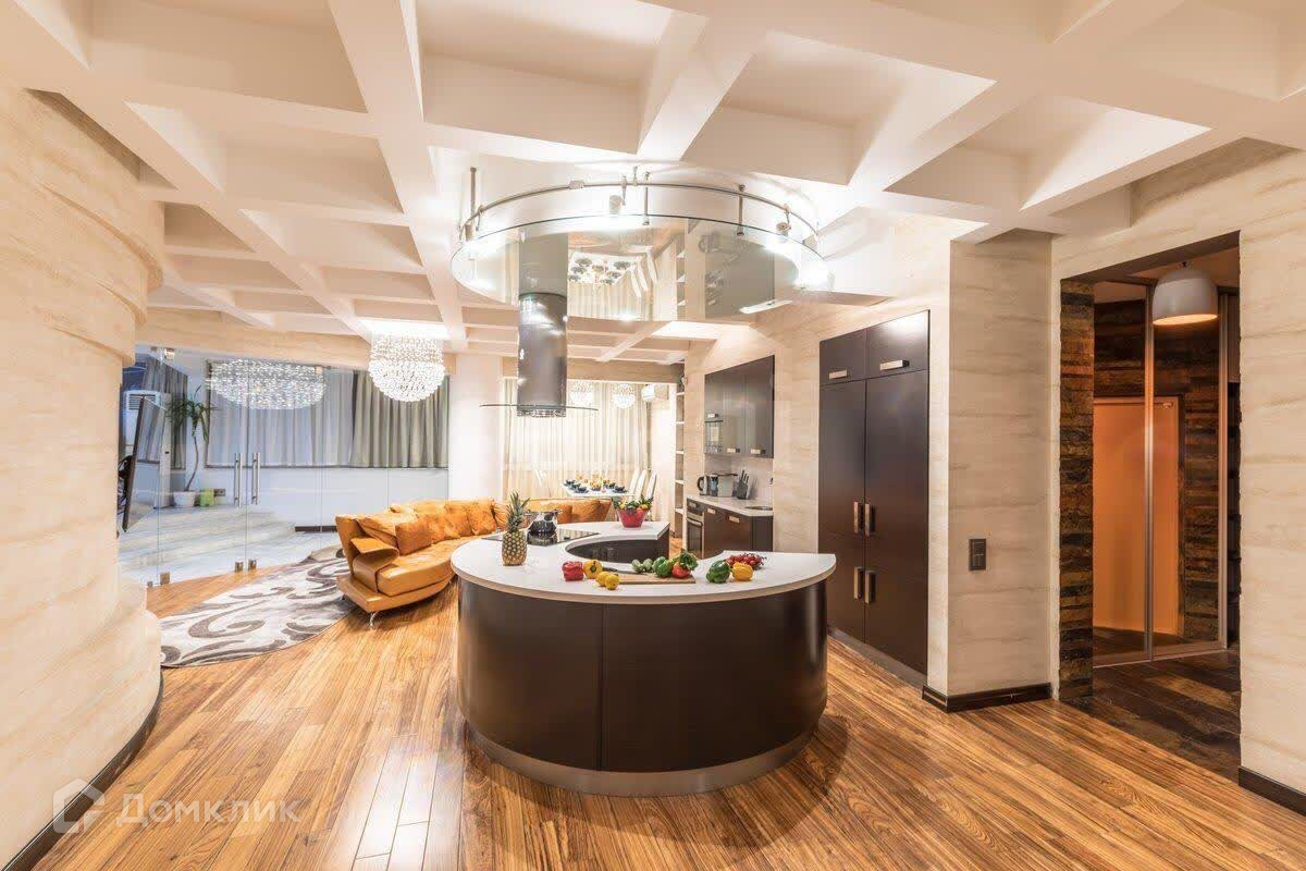 Выполнена дизайнерская отделка в современном стиле с применением ценных пород дерева, мрамора и декоративной штукатурки, установлена итальянская кухня с бытовой техникой Bosch и отдельным островком для приготовления блюд.