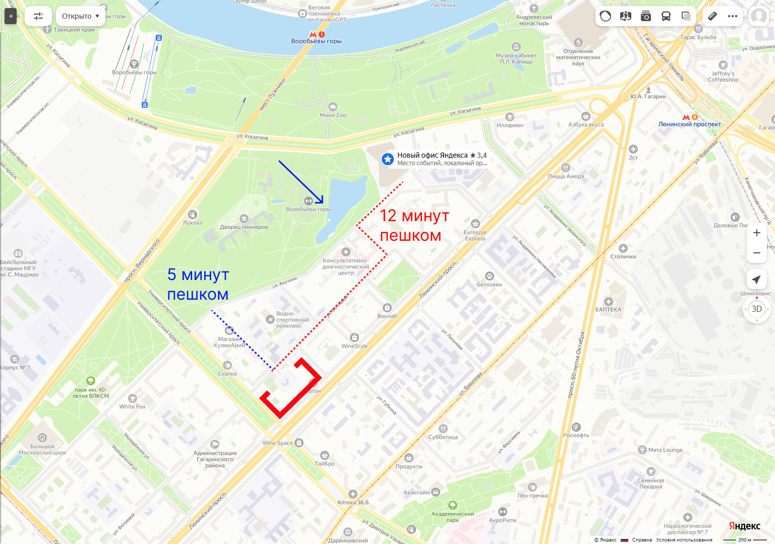 5 минут на автомобиле по прямой (Ленинский проспект и Лужнецкий мост) до 3-го кольца, 10 минут до садового кольца