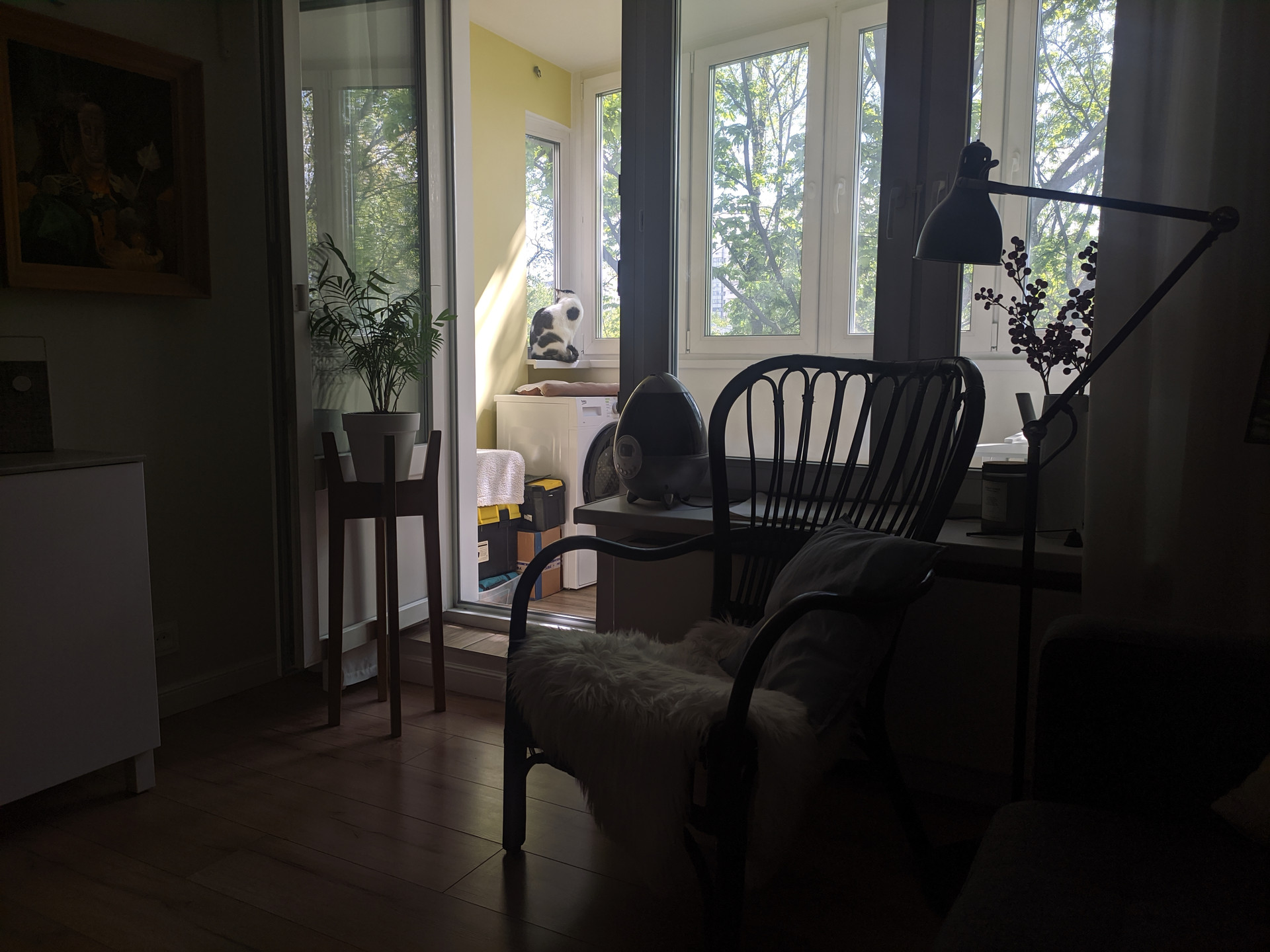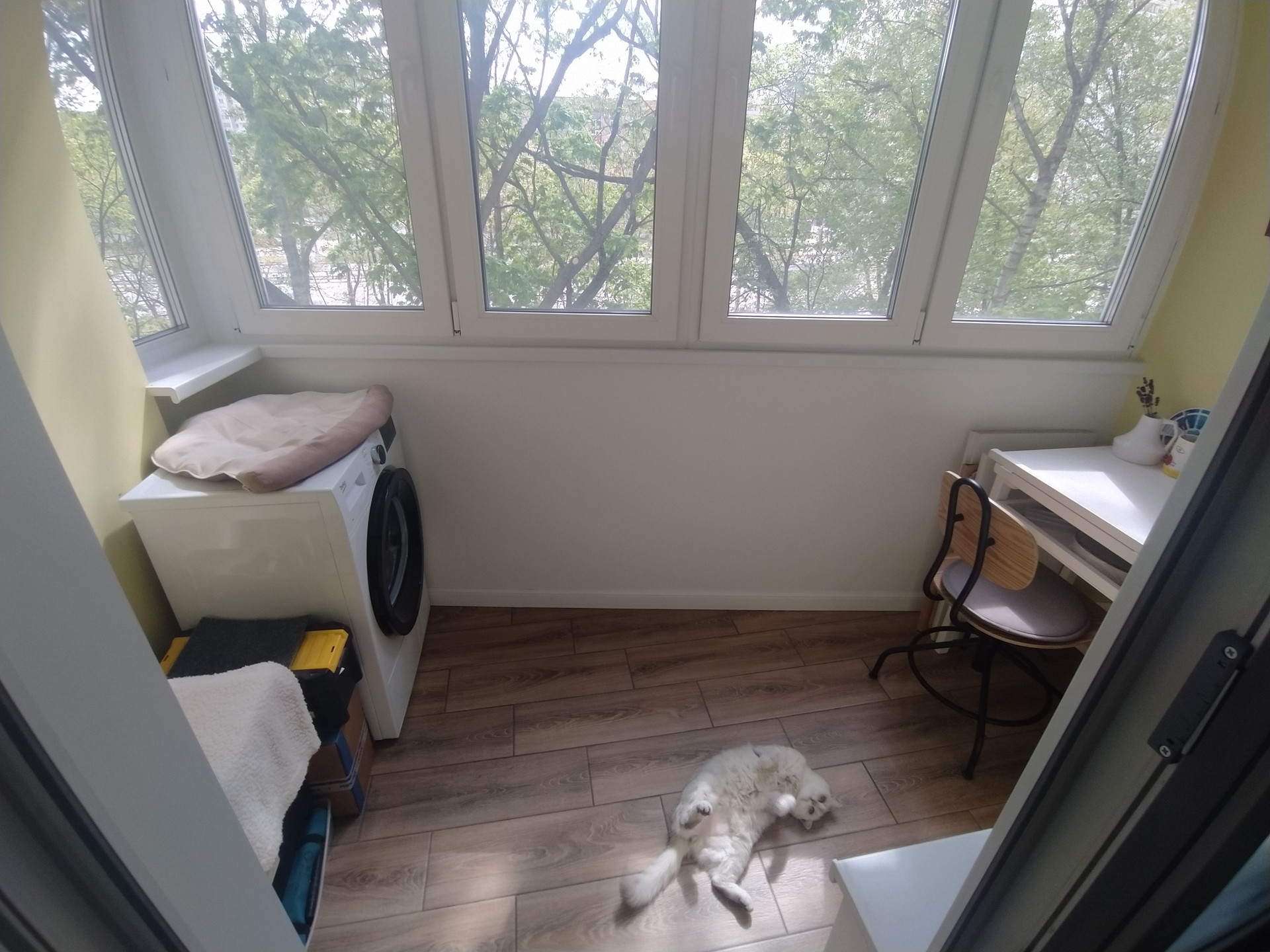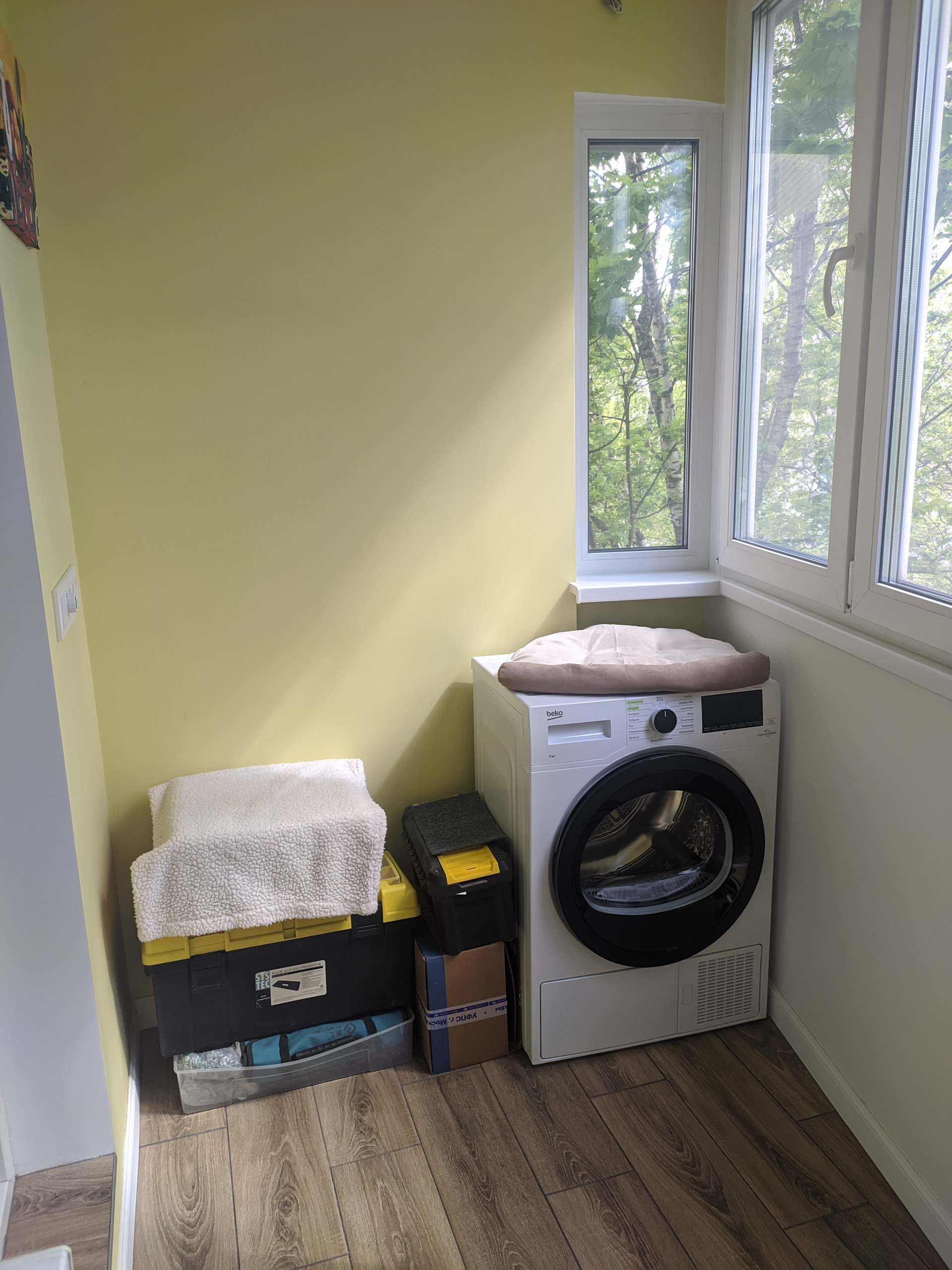 Двухкамерный стеклопакет. Регулируемый теплый пол. Еще одно помещение для круглогодичного использования. Очень светлая. Используем как мастерскую. Сейчас устанавливаю столешницу над сушильной машиной.