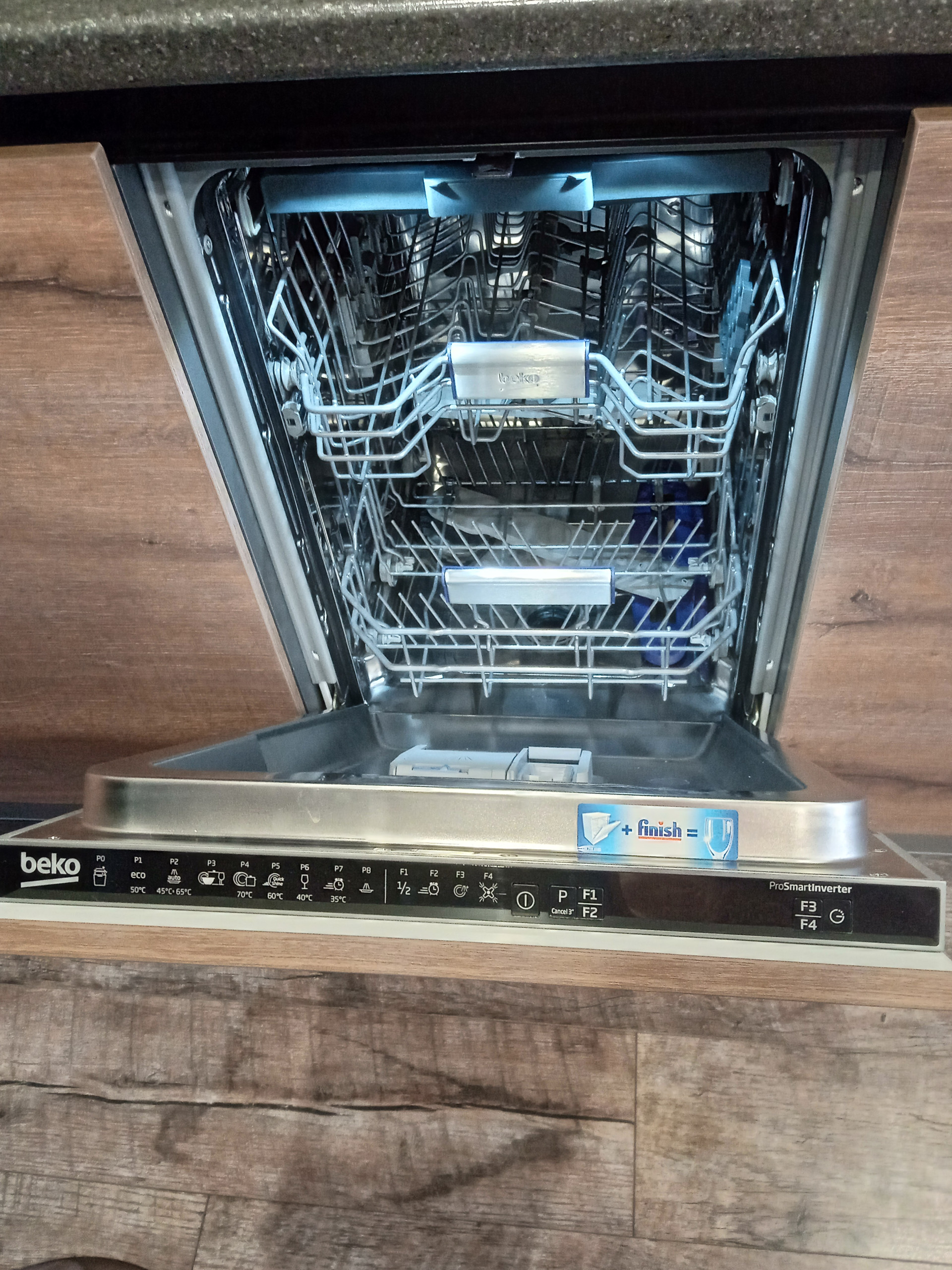 Встроенная кухня с техникой: индукционная варочная поверхность, духовой шкаф, посудомоечная машина, холодильник, вытяжка.