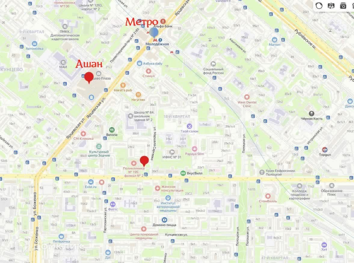 Идеальное расположение для сдачи в аренду: рядом с продуктовыми магазинами, ТЦ "Ашан", метро, поликлиникой, школой, детским садом, университетом "Синергия", пекарней, фитнес-залом и другими удобствами. Зеленые зоны вокруг создают приятную атмосферу.