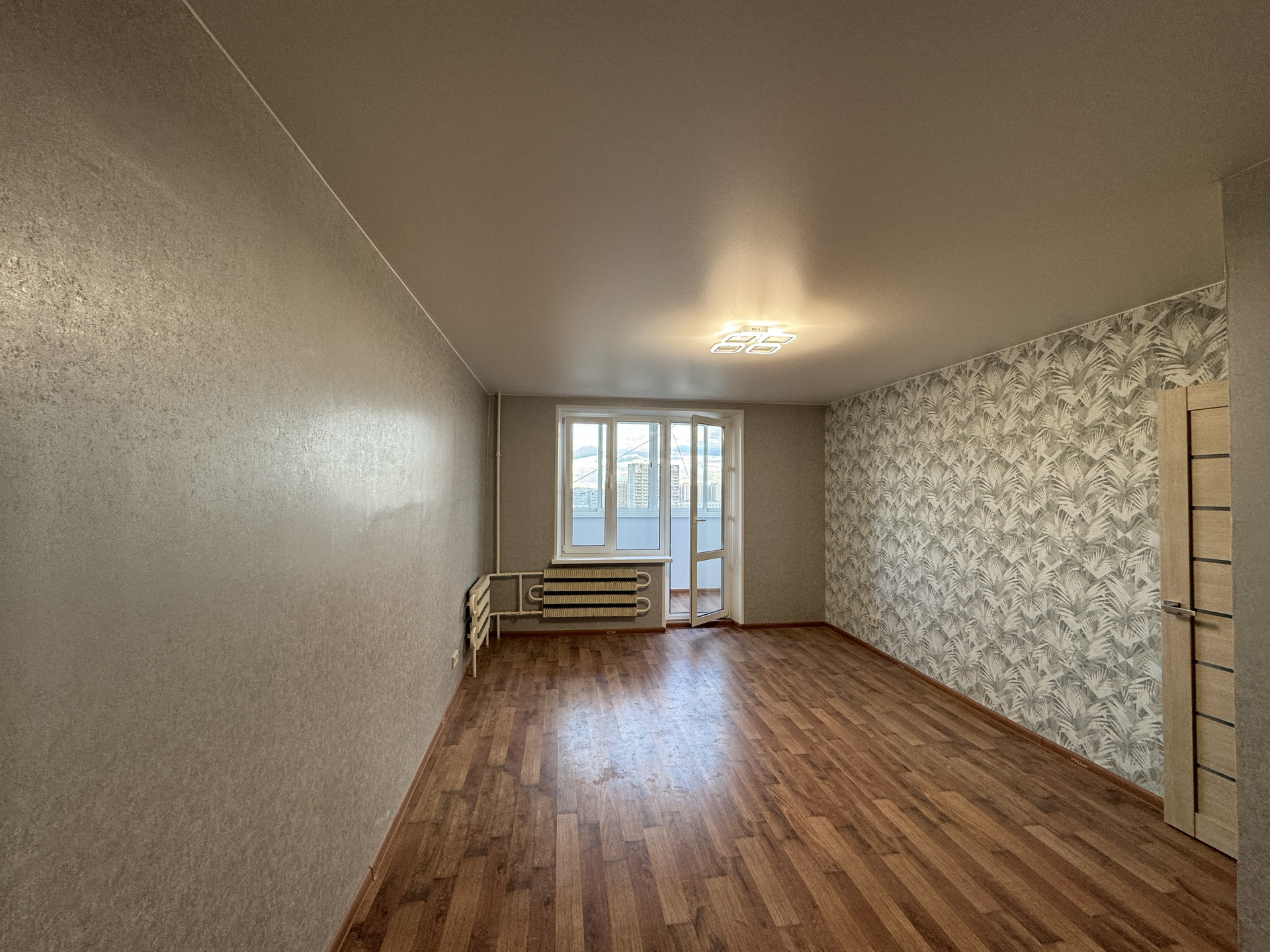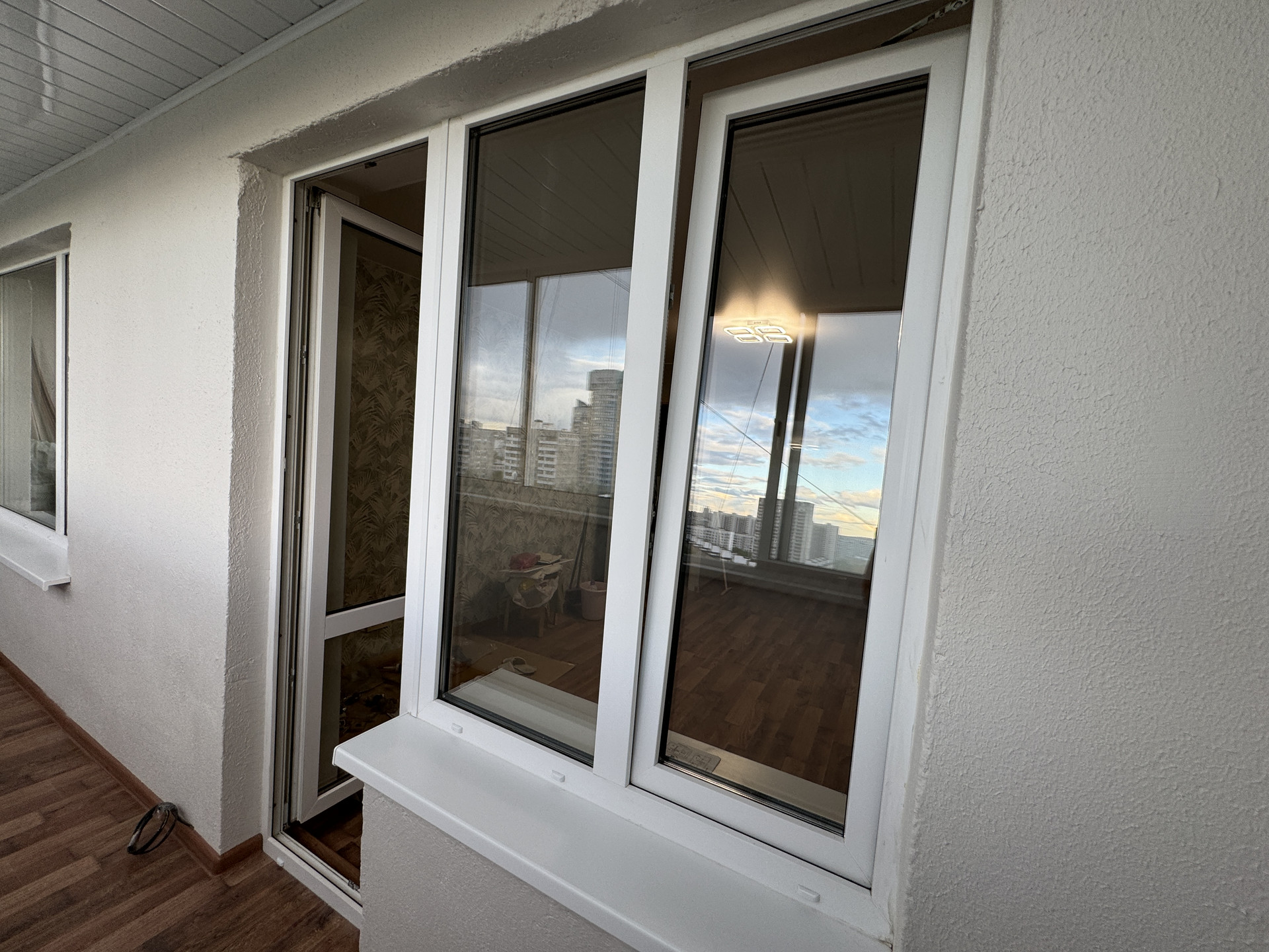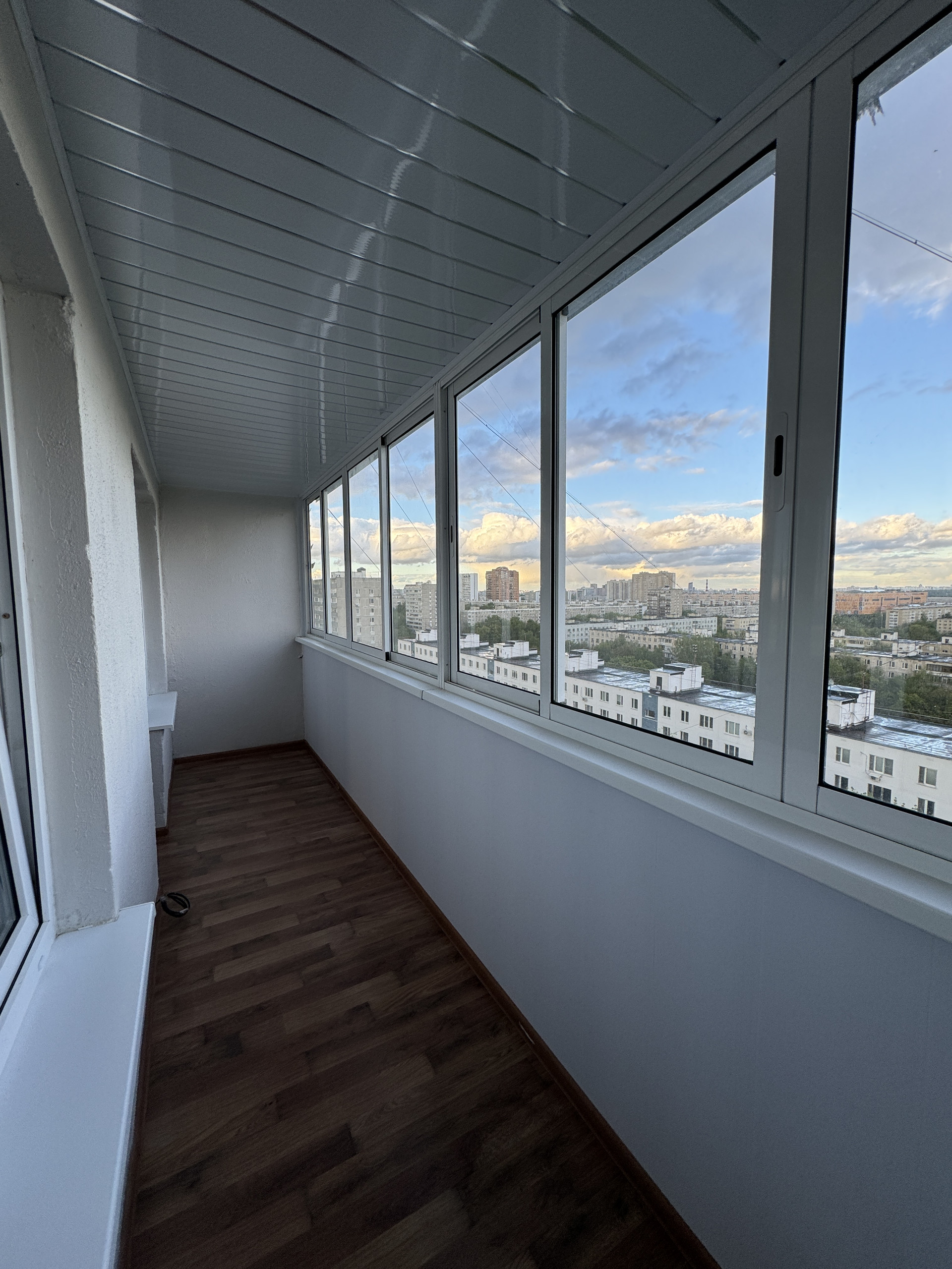 Большая застекленная лоджия площадью 6.2 м, вдоль комнаты и кухни.