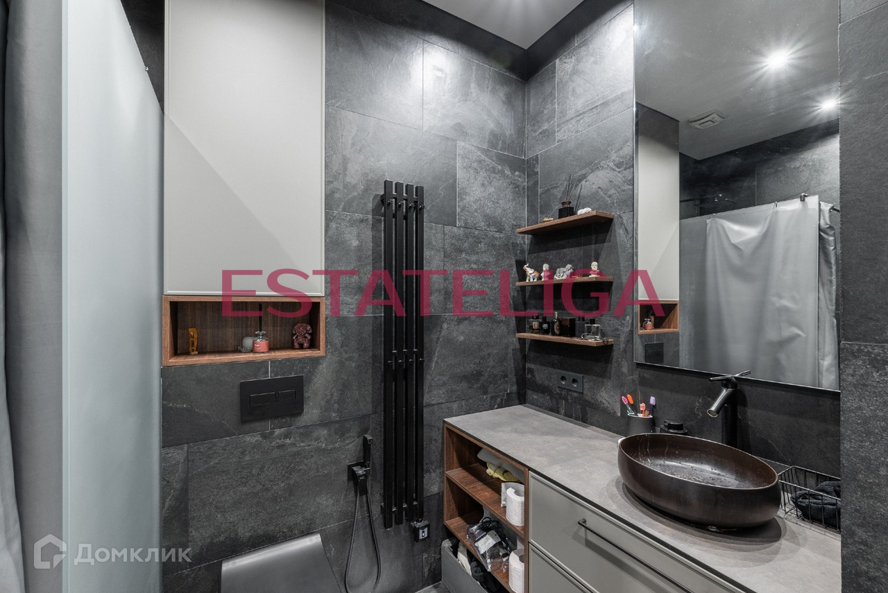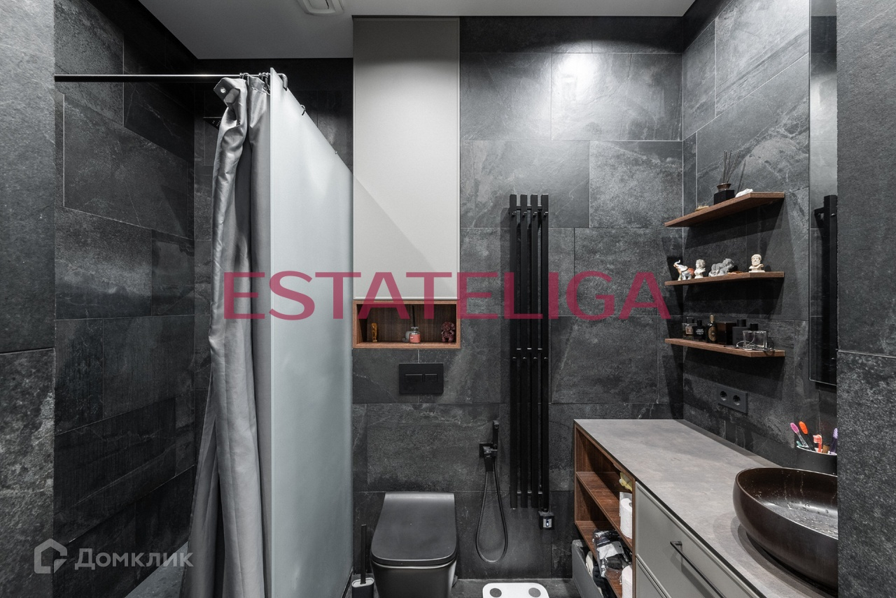 В двухкомнатной квартире один большой совмещенный санузел в стильных темных тонах.