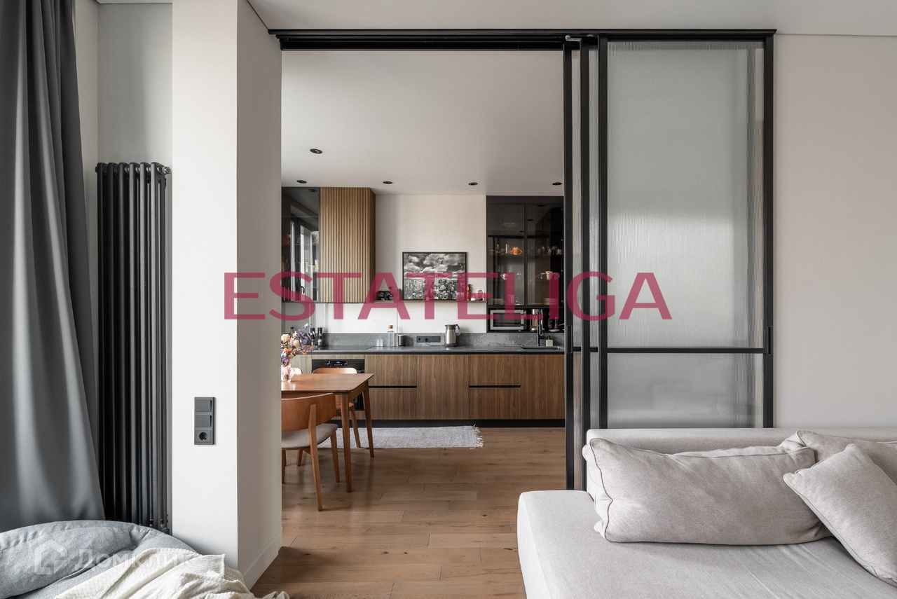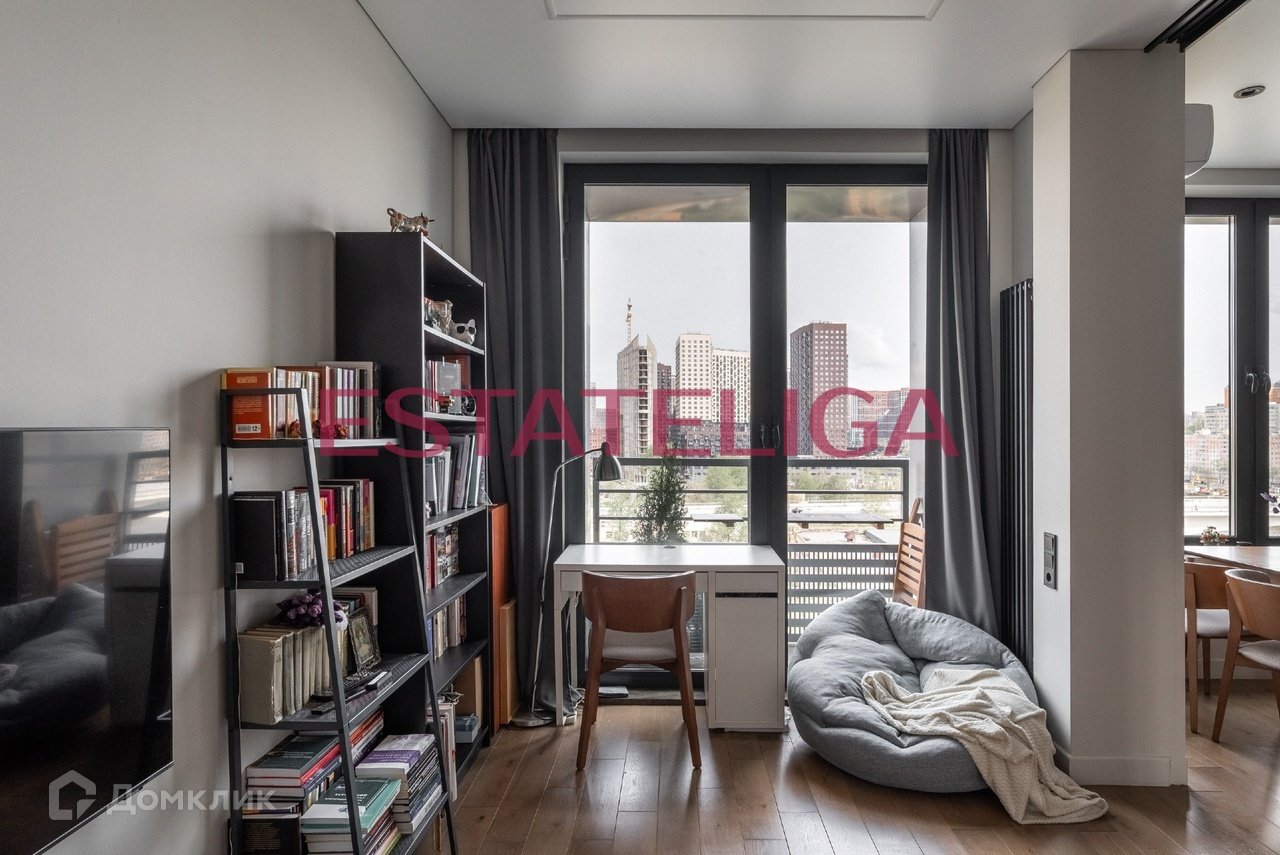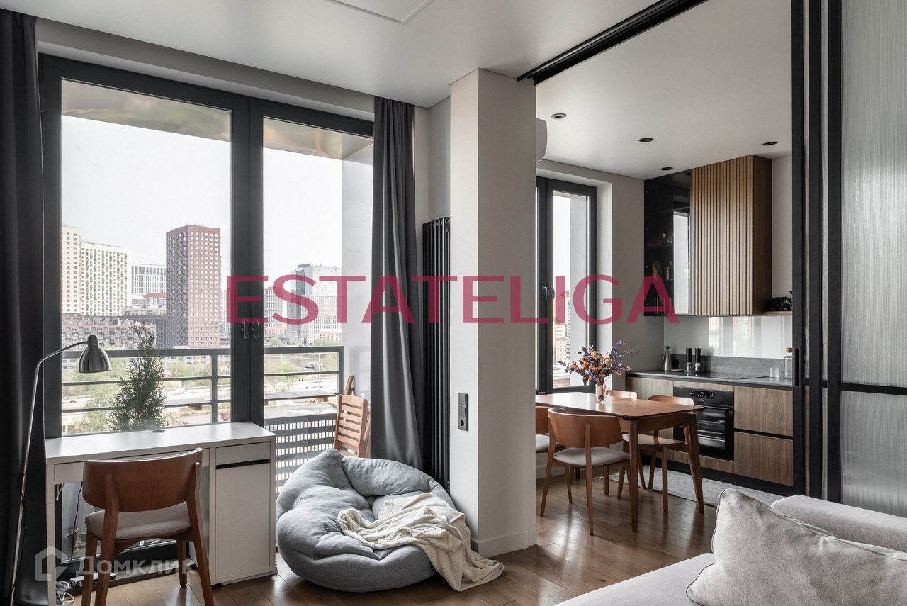 Кухню и гостиную разделяют широкие раздвижные двери, что очень функционально, можно изолировать отдельную комнату, а можно объединить пространство и использовать его как большую лаунж зону! Там же выделена рабочая зона! Из гостиной можно выйти на балкон и наблюдать всю панораму Москва-реки вдоль Шелепихинской набережной!
