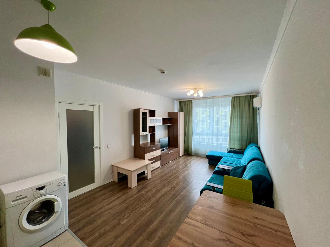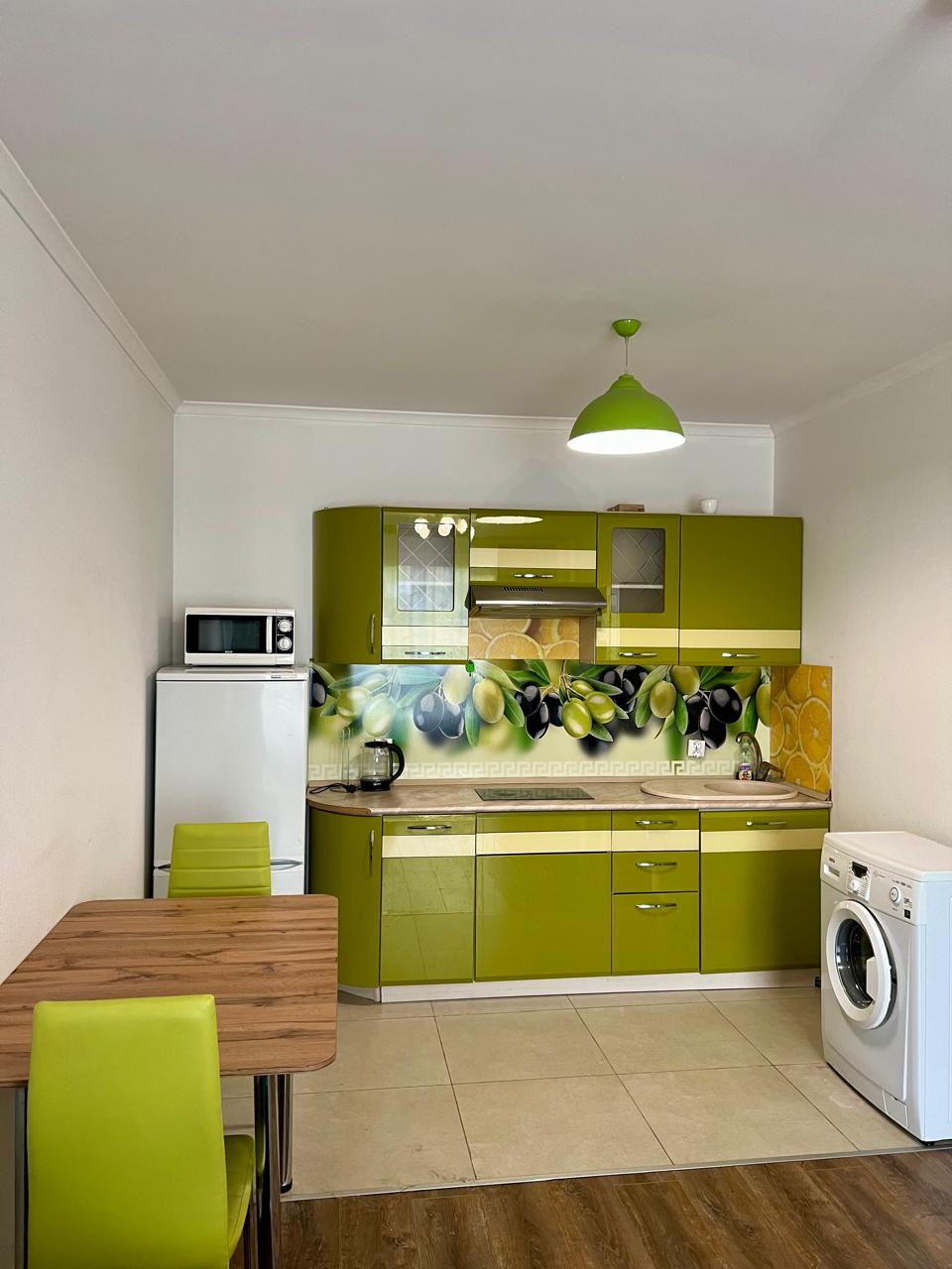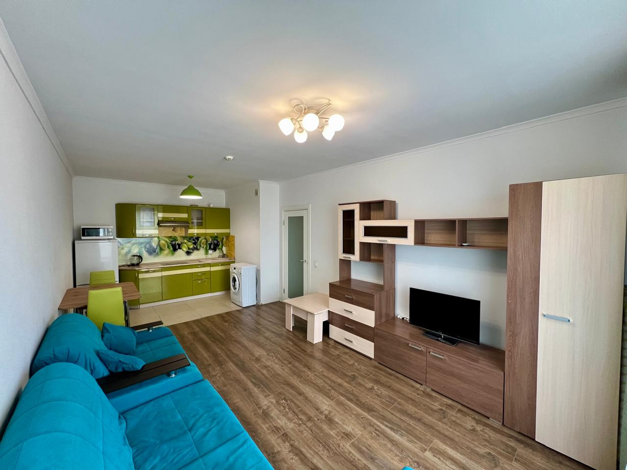 Продается с кухней, мебелью и техникой.