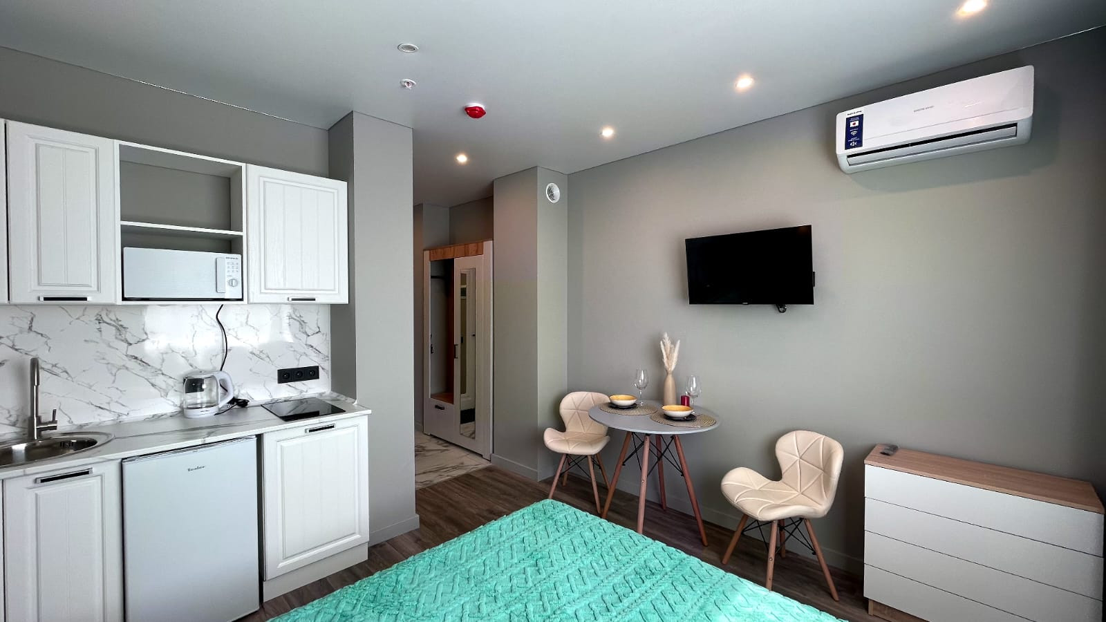 Евроремонт с выводом под кухонную зону, отделкой, готовым санузлом и сантехникой (раковина, унитаз, душ со стеклянной ширмой). Полная новая отделка мест общего пользования: коридоры и холлы. В здании комплекса заменены коммуникации (канализация, электрика, водопровод, отопление, вентиляция). Установлены сплит-системы для кондиционирования воздуха, стеклопакеты и вентиляция. Срок передачи ключей - август 2024 года.