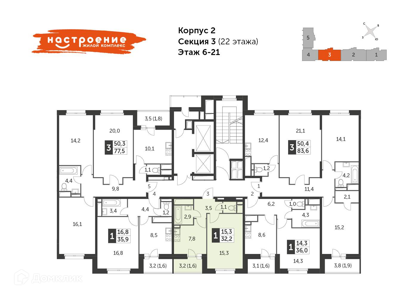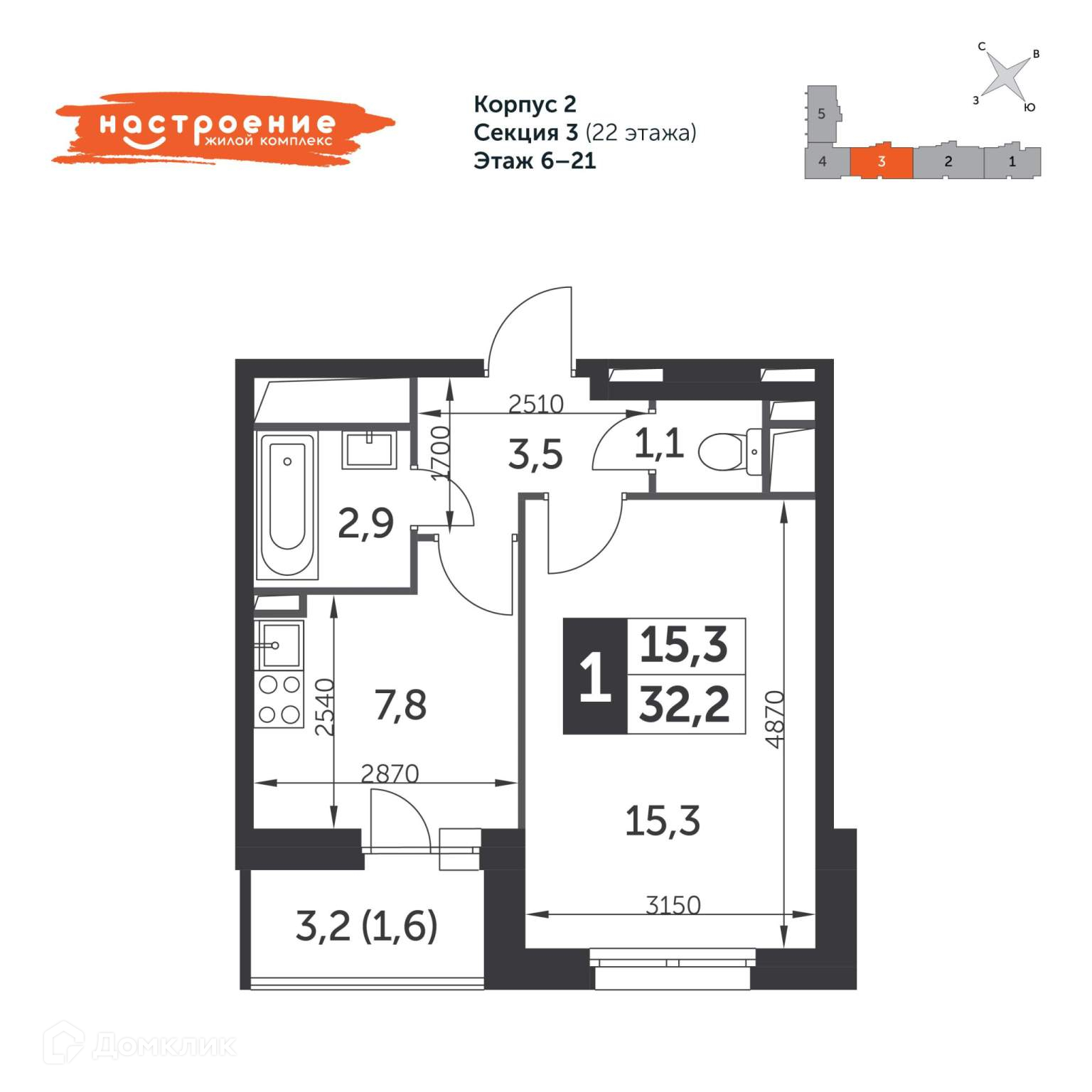 Продаётся 1-к квартира №577 в сданном корпусе общей площадью 32.3 кв.м. на 16-м этаже 22 этажного дома.