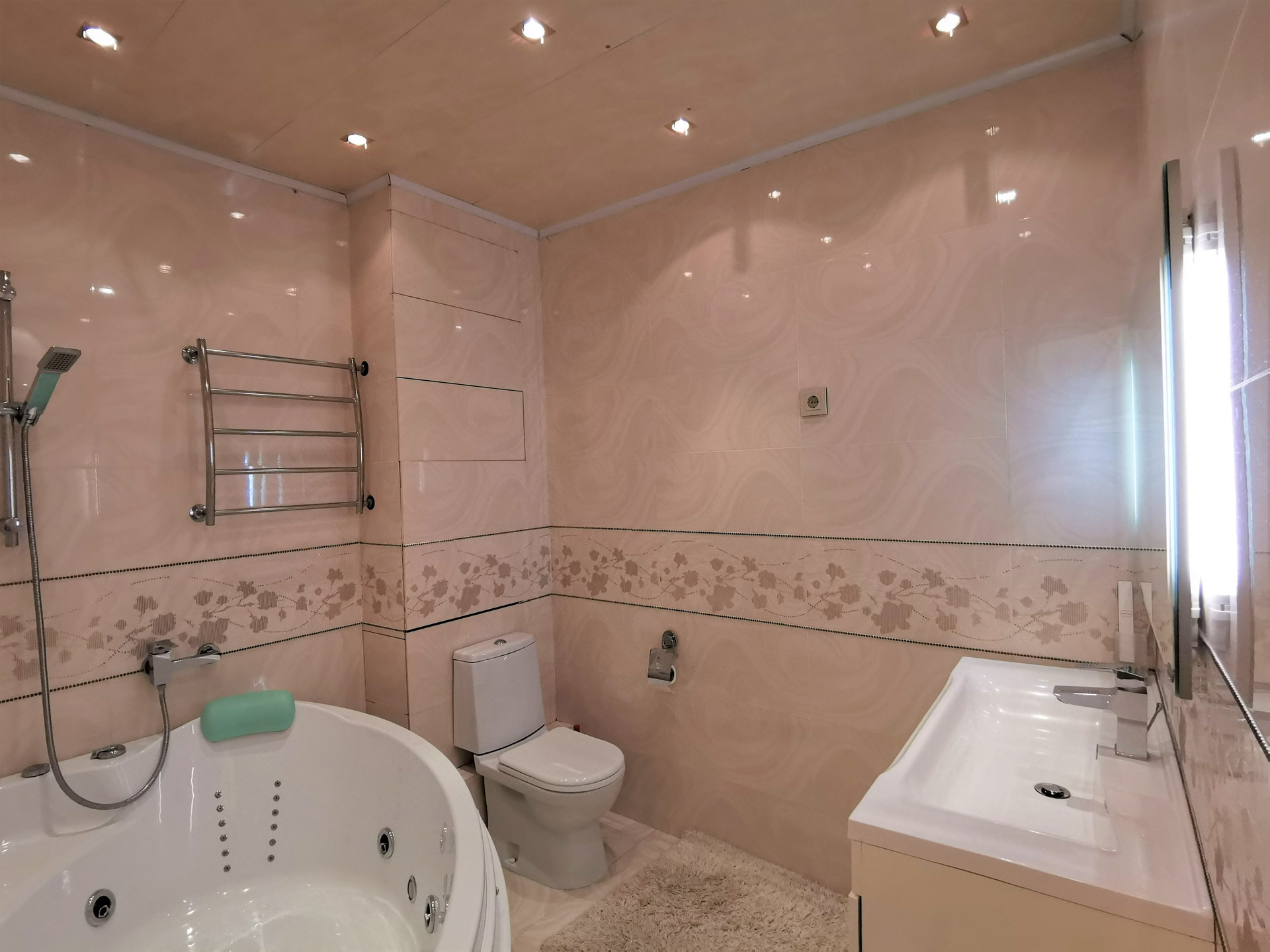 Квартира имеет большую обустроенную застекленную лоджию, выход на которую из 2 спален. Окна пластиковые, на полу ламинат и плитка. В ванной комнате джакузи с гидромассажем. В кухонной зоне встроенный гарнитур со всей соответствующей техникой (духовой шкаф с СВЧ, стиральная машина, вытяжка).
