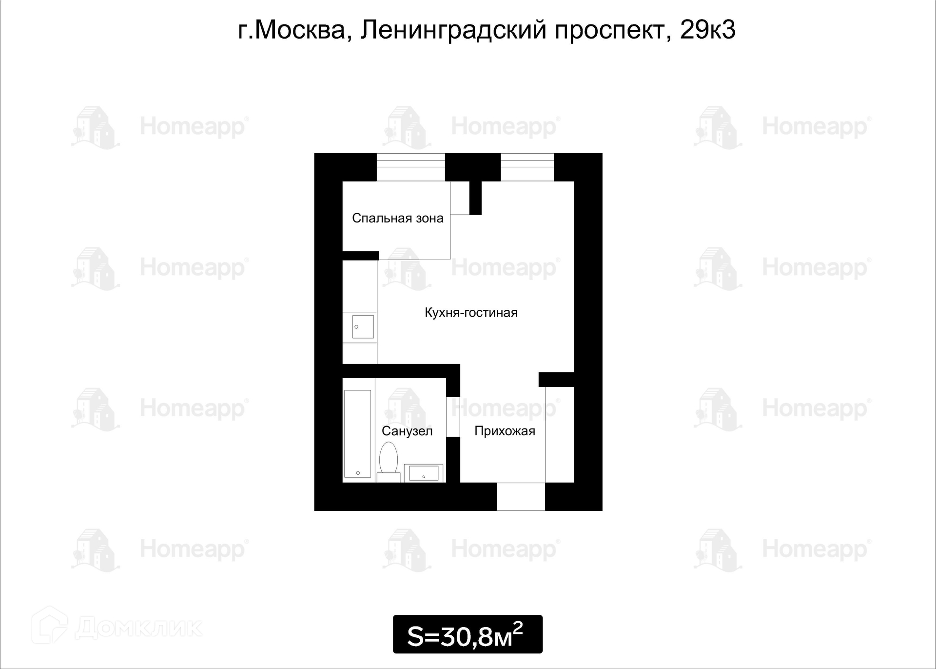 Общая площадь 30.8 м2