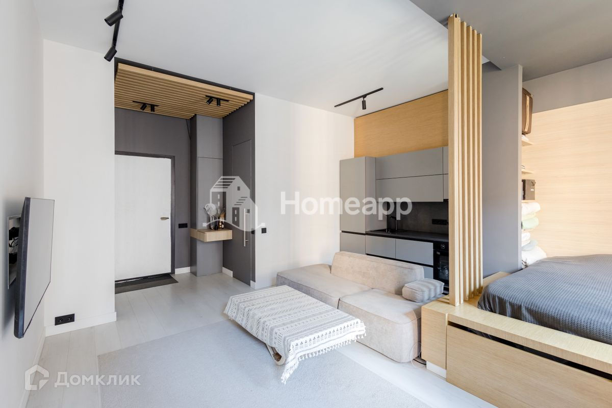 Планировкой предусмотрены: просторная кухня-гостиная с уютной спальной зоной, санузел и прихожая с зоной гардероба. Из окон квартиры открывается вид в тихий зеленый двор. Пространство очень светлое! Прекрасно подойдет как для одного человека, так и для семейной пары.