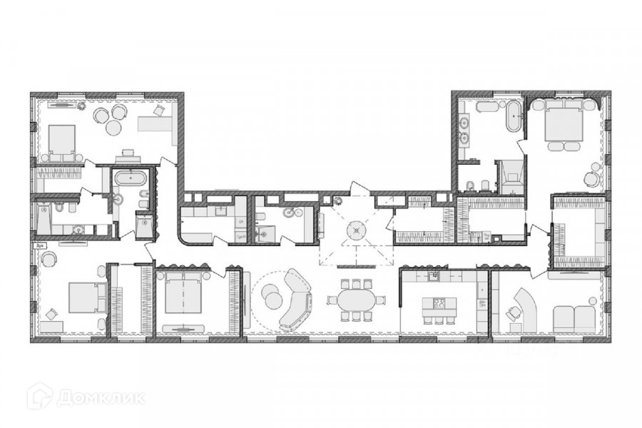 Планировочное решение: просторная гостиная со столовой зоной, кухня, три мастер-спальни с собственными ванными и гардеробными, две спальни, санузел с душевой, постирочная, гардеробная, прихожая.