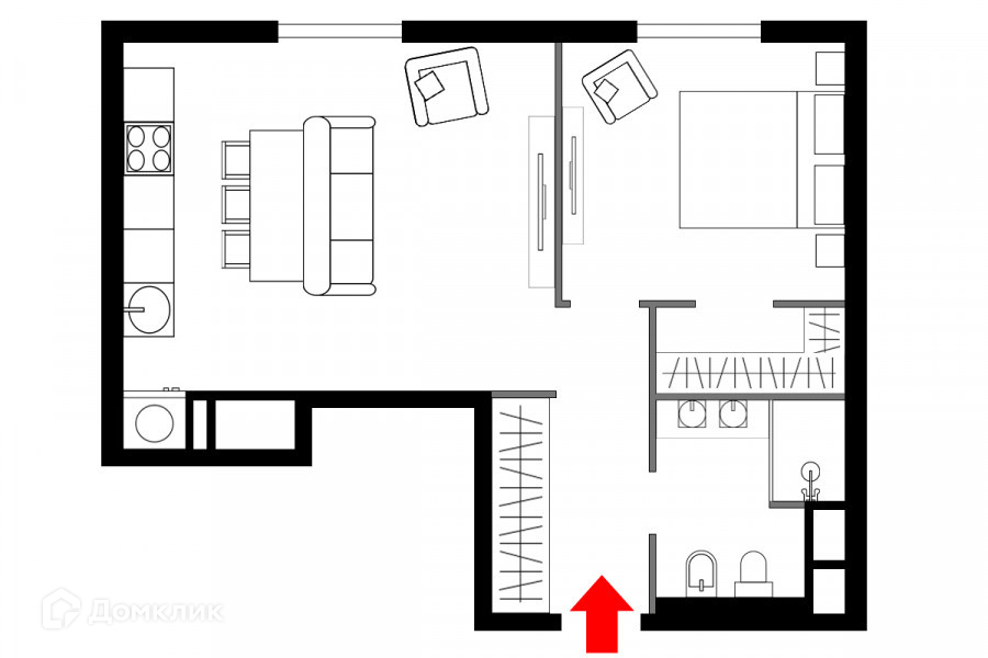 Планировочное решение: кухня с обеденной зоной и гостиной, изолированная спальня, санузел, гардеробная комната.