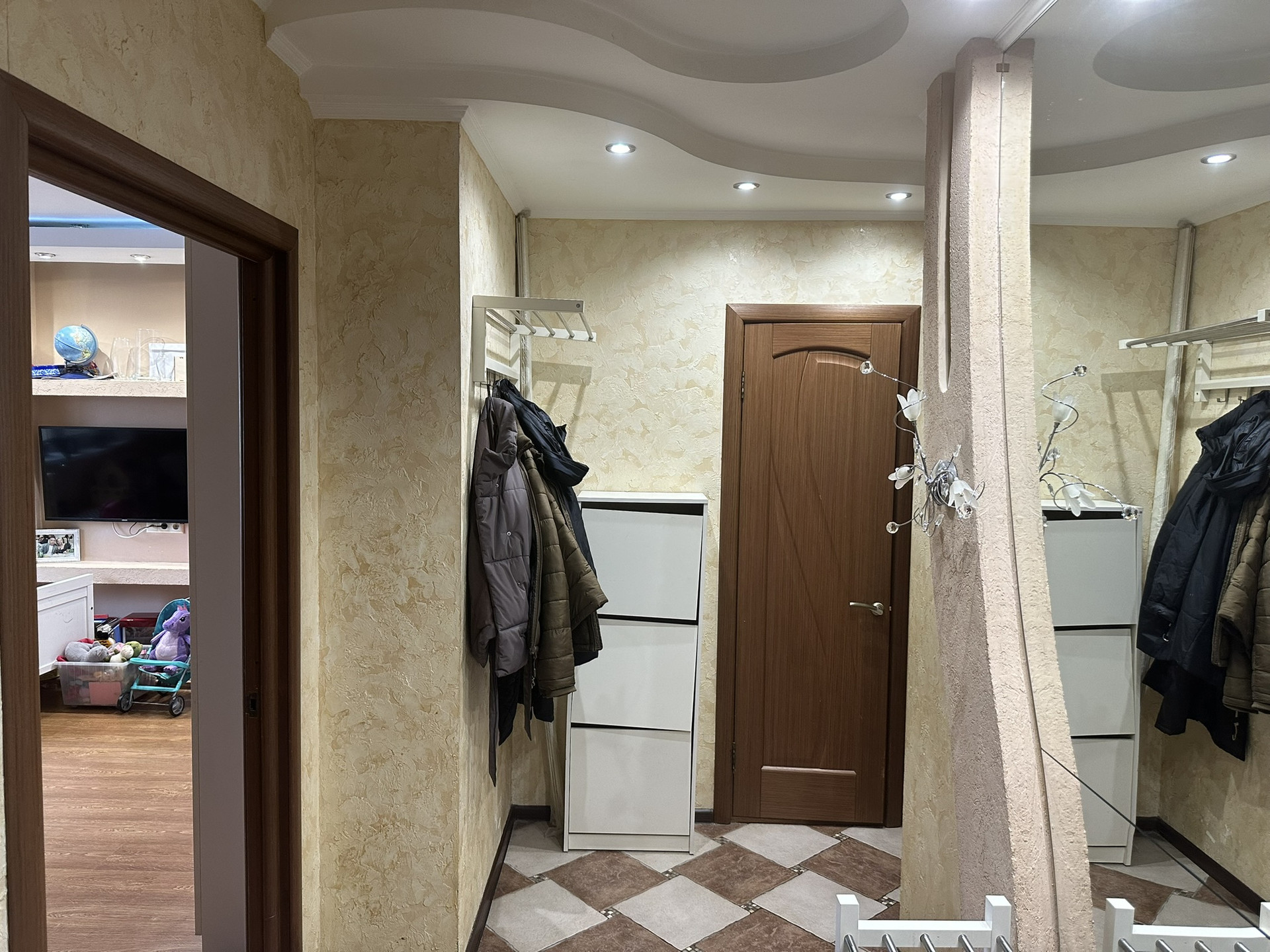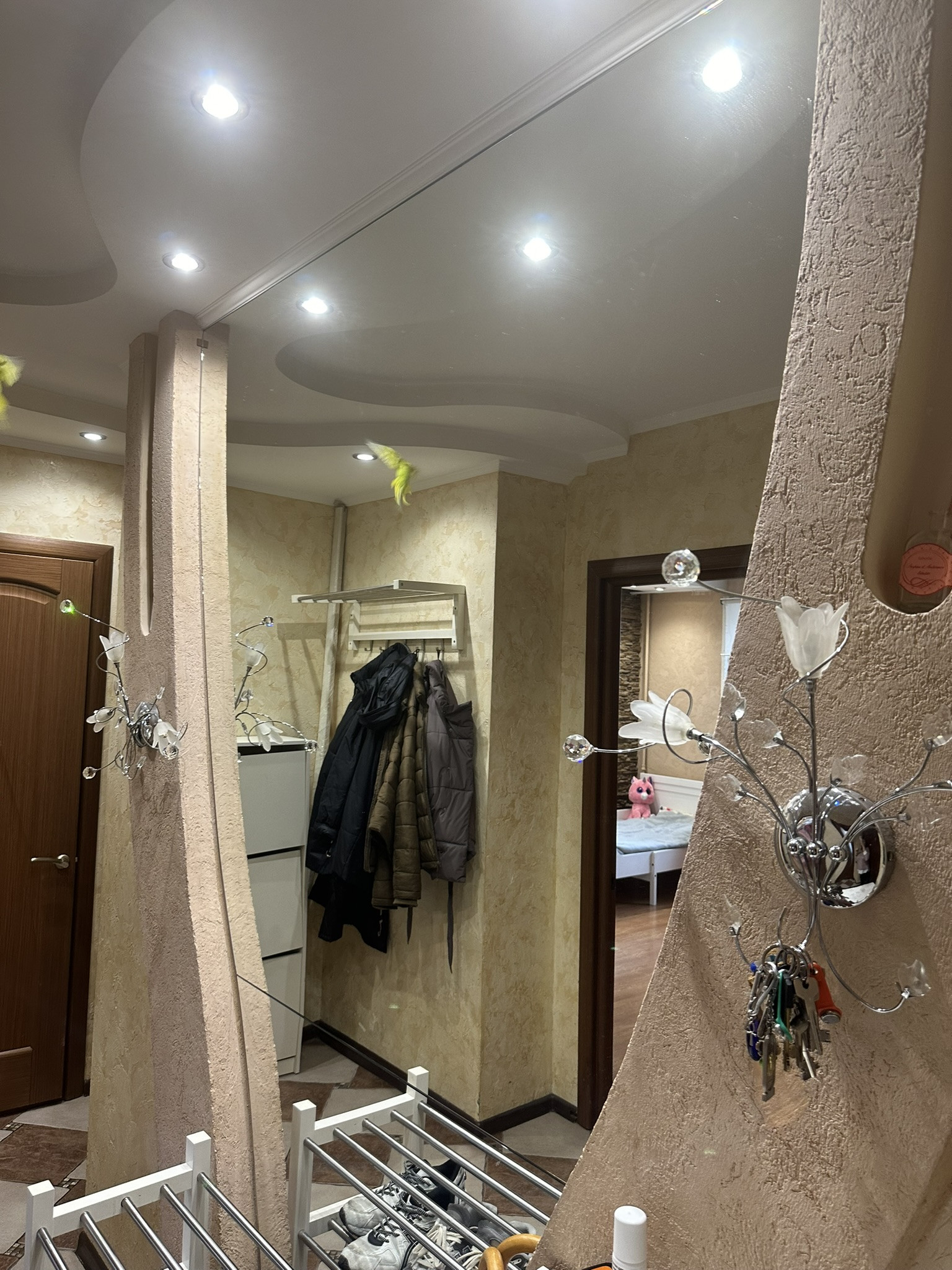 Комнаты раздельные (изолированные) 18 кв.м. и 12,2 кв.м., санузлы раздельные, хорошая сантехника, плитка, счетчики установлены, просторный холл с большим зеркалом, европотолки с подсветкой.