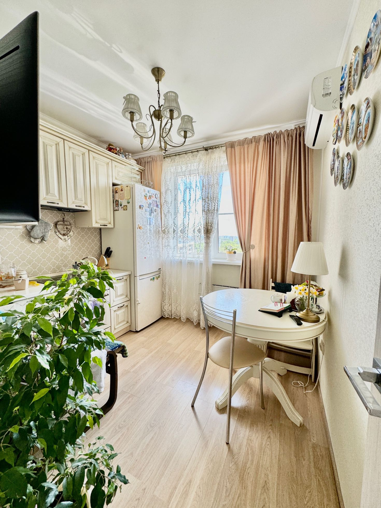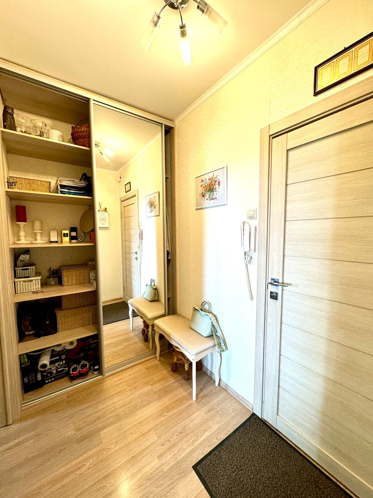 Продается однокомнатная квартира. Квартира светлая, уютная, теплая. Этаж 14, над квартирой теплый технический этаж. Окна на юг. (в квартире всегда светло и уютно, панорамные виды на закат и рассвет). Окна в тихий двор, дороги не слышно. Есть кондиционер. Квартира не угловая. Ремонт 2019г. Кухня в классическом стиле со встроенной техникой- ПММ, электрическая варочная панель, духовой шкаф , техника Ханза ( по договоренности технику можем оставить). В зале в нише обустроена вместительная гардеробная со встроенной системой хранения. В прихожей - большой вместительный встроенный шкаф с зеркалами во всю высоту.