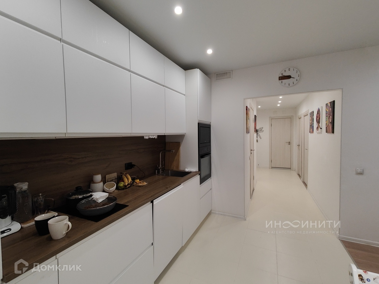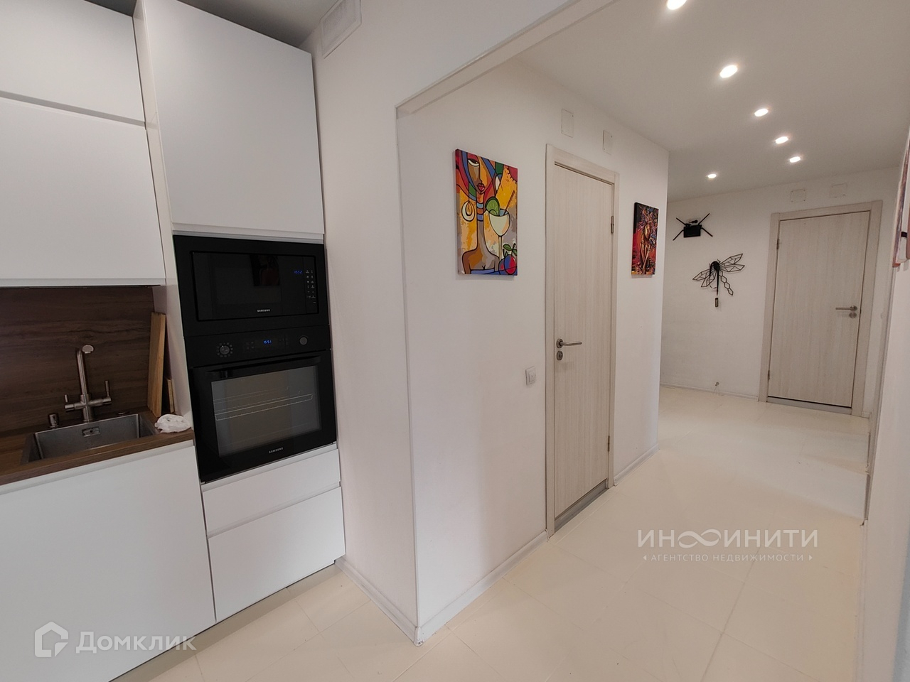 - Кухонный гарнитур со встроенной техникой, включает в себя: холодильник, посудомоечную машину, индукционную плиту, духовой шкаф, СВЧ.