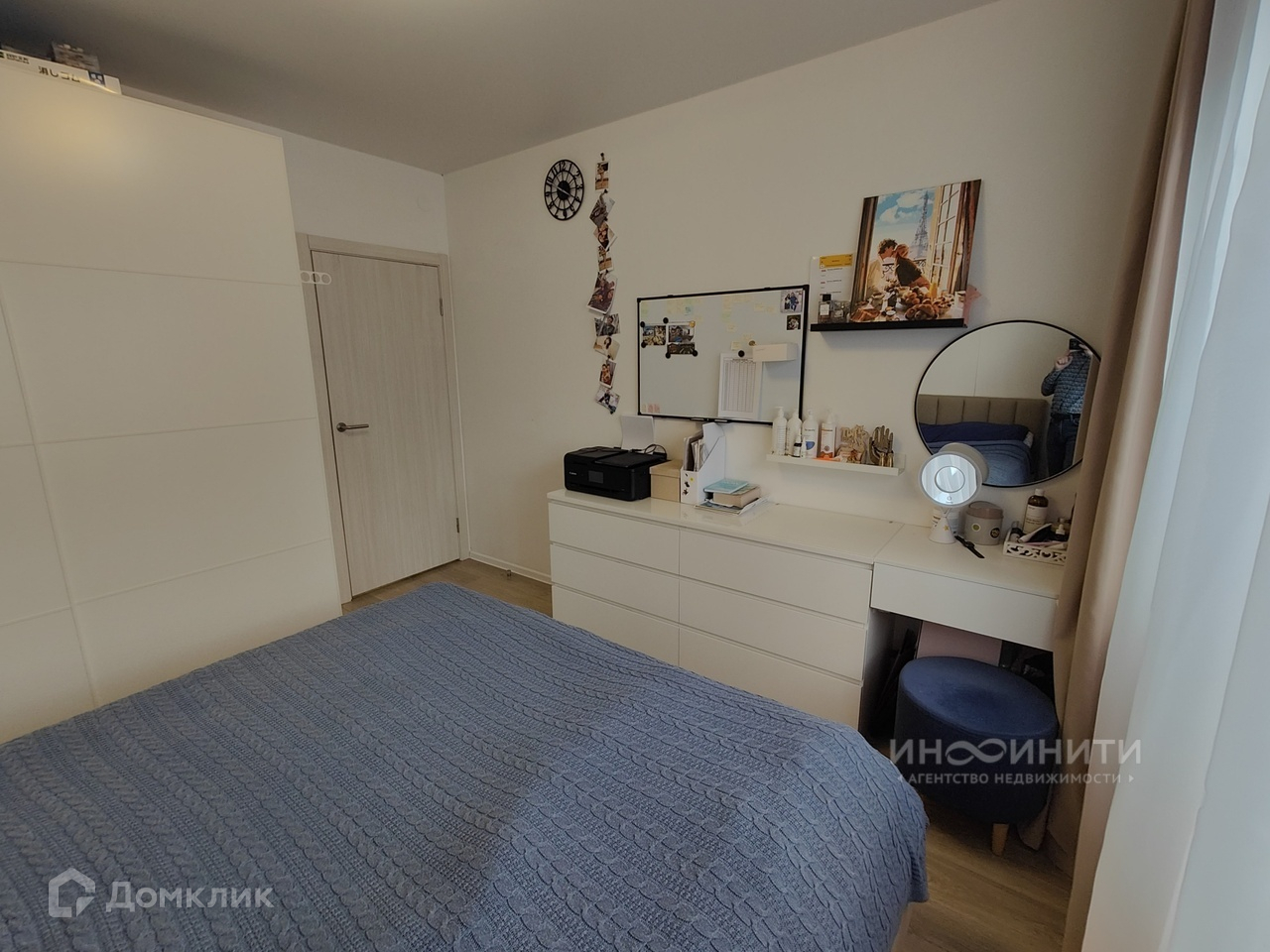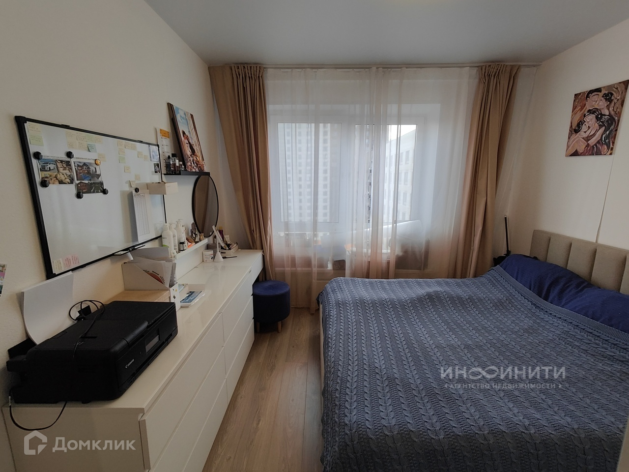 - В спальне остается кровать на высоких ножках с подъемным механизмом, шкаф, комод, косметический столик.