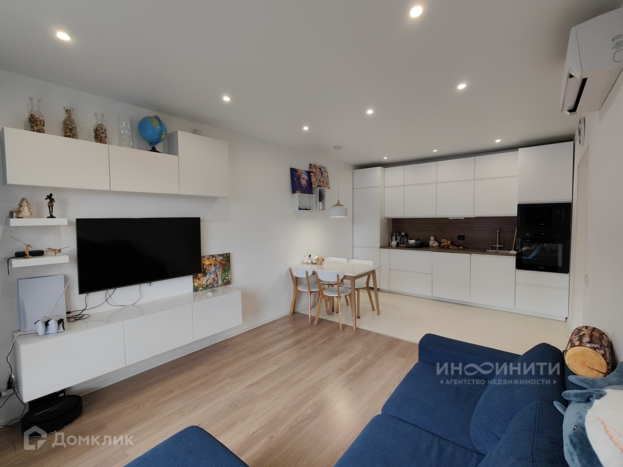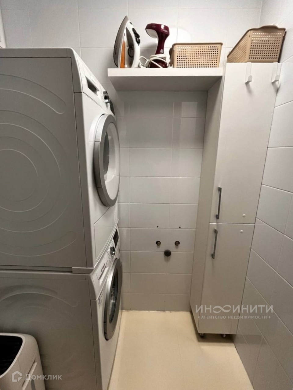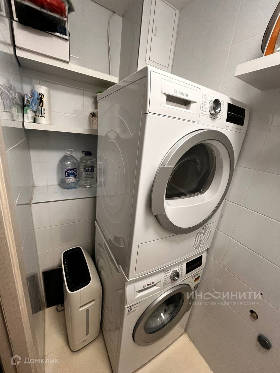- В постирочной установлены: стиральная и сушильная машина фирмы BOSСH, диван на высоких ножках, чтобы везде мог проехать робот-пылесос, кондиционер мощностью 12 BTU, шкаф и дополнительные стеллажи.