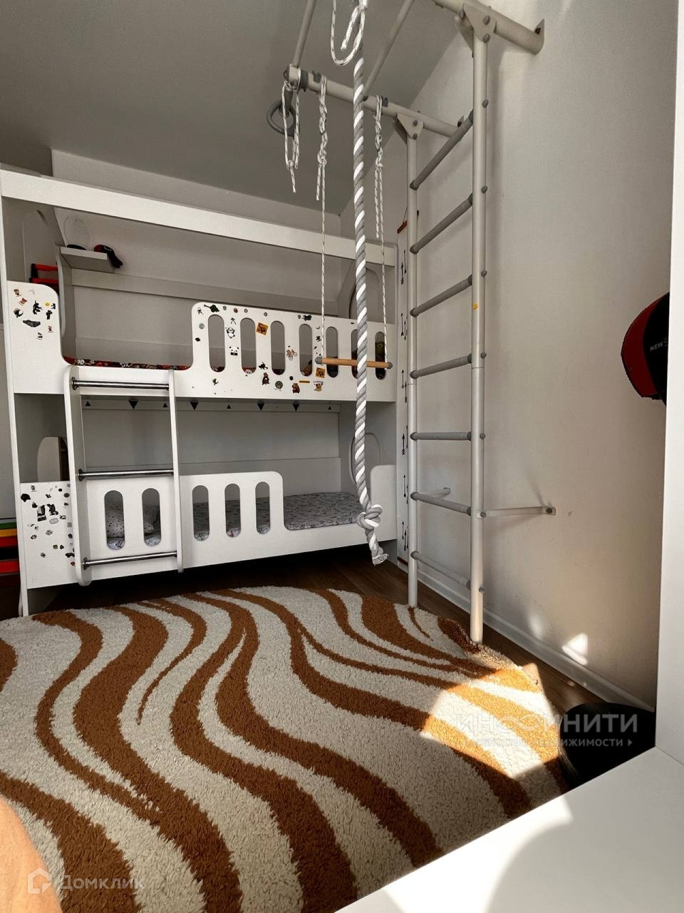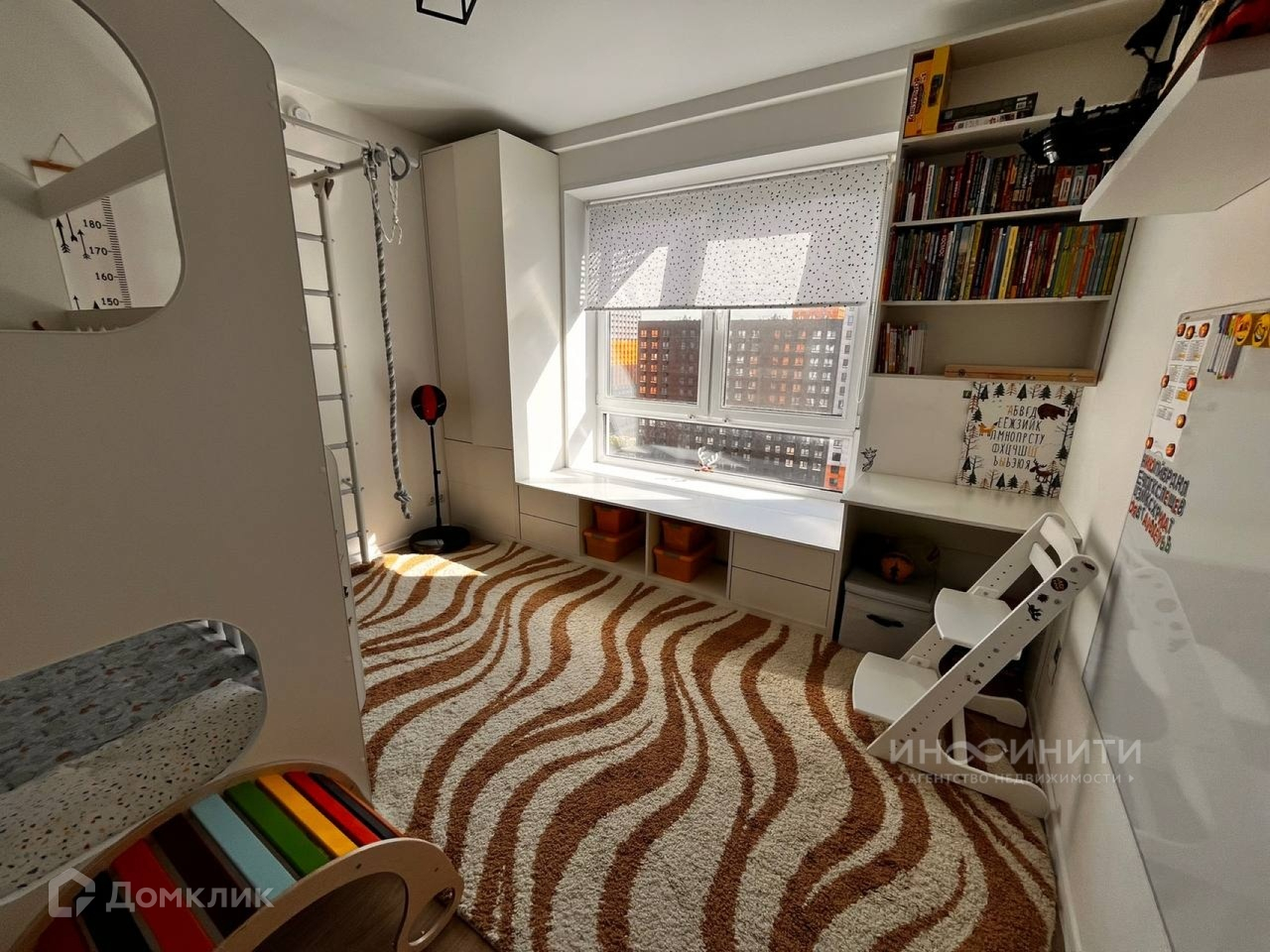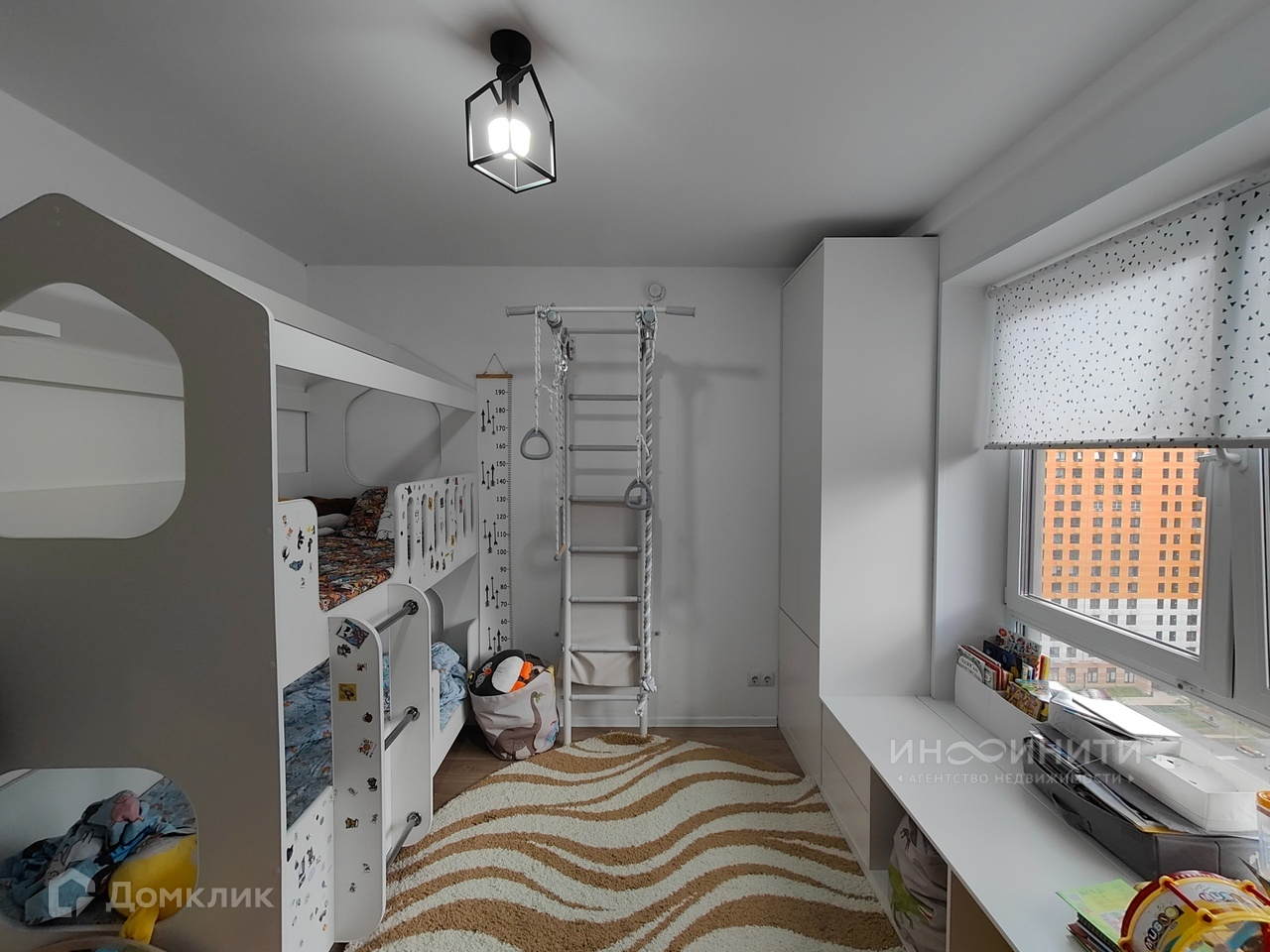 - Детская включает в себя двухъярусную кровать, шкаф с продолжением подоконника (удобное место для чтения книг и наблюдения за звездами), письменный стол, спортивный уголок.