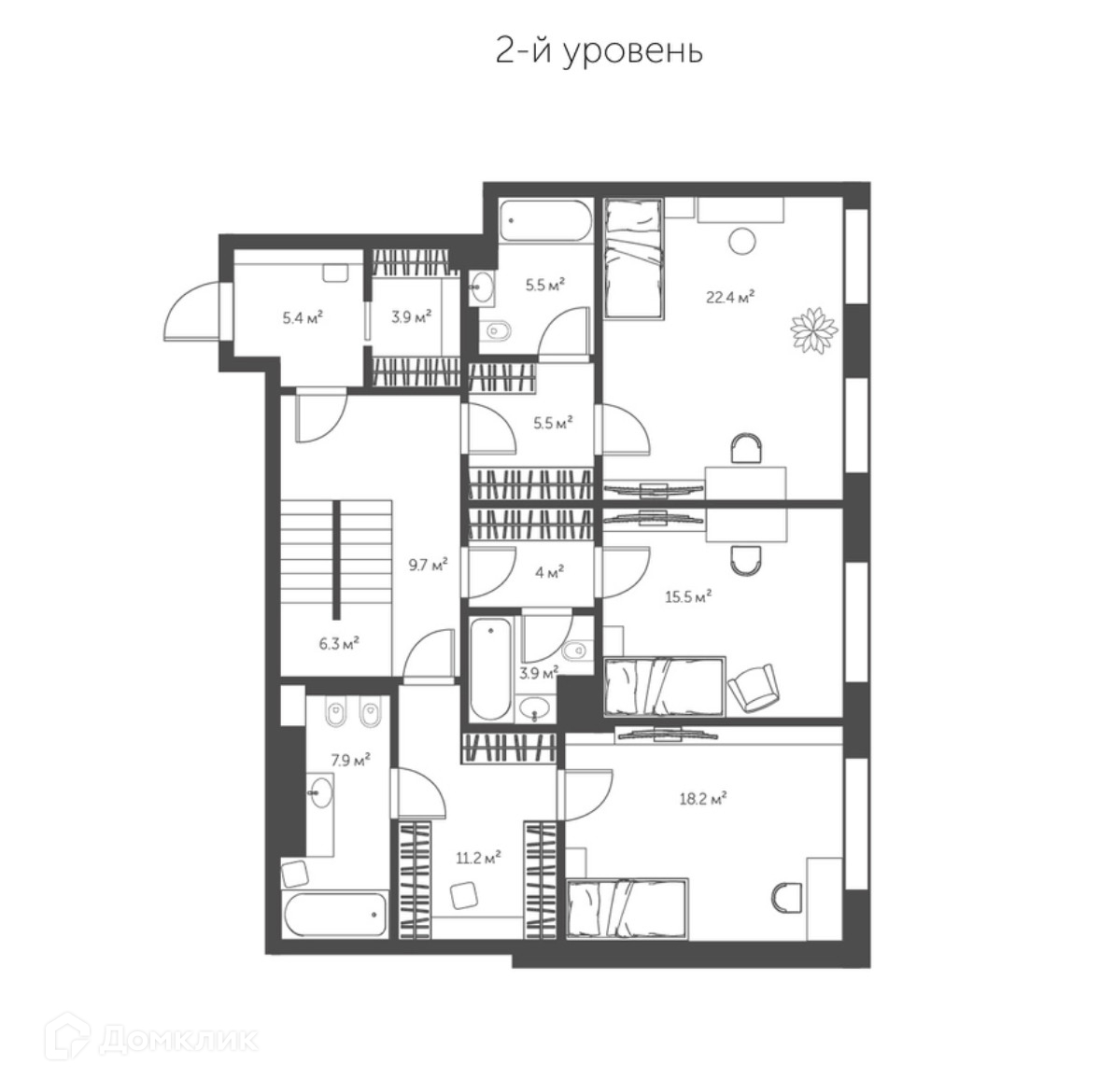 Возможная планировка на 1-м уровне: просторная кухня-гостиная площадью 61 м², мастер-спальня с собственной гардеробной и ванной, гостевой санузел, постирочная, холл. На 2-м уровне — 3 спальни со своими гардеробными и санузлами, дополнительная гардеробная или кладовая. Благодаря панорамным окнам пространство наполнено естественным светом, открываются виды на тихий уютный двор.