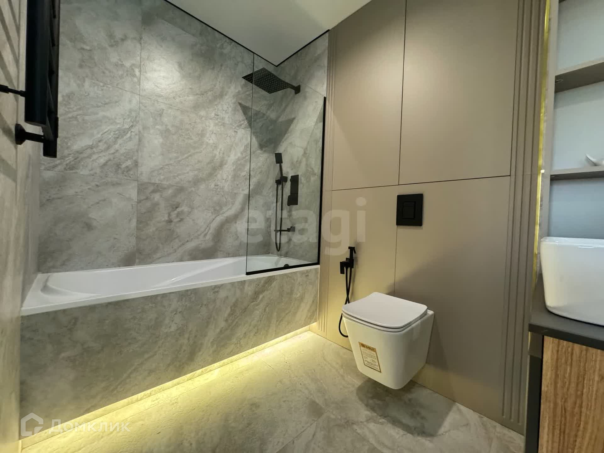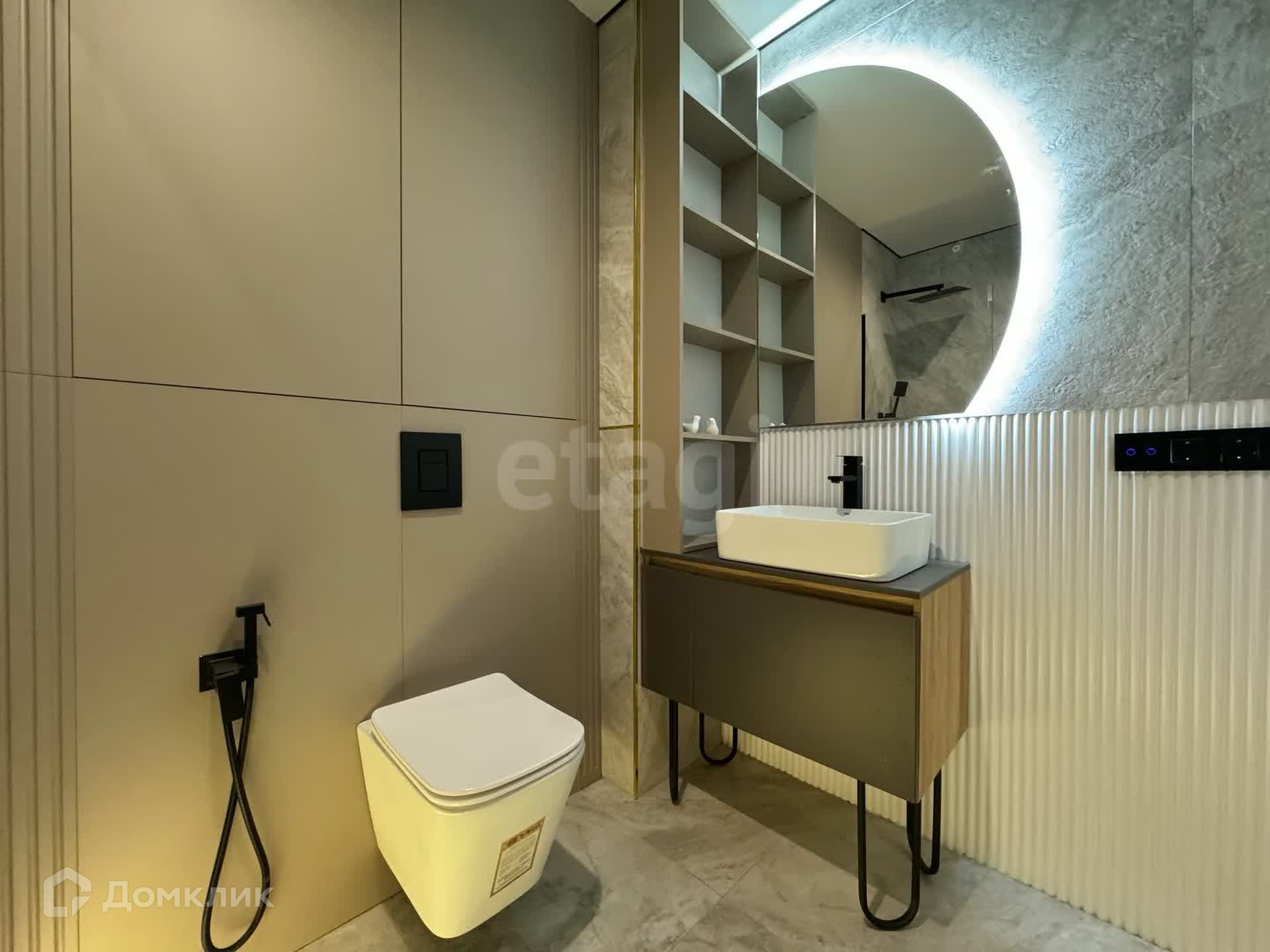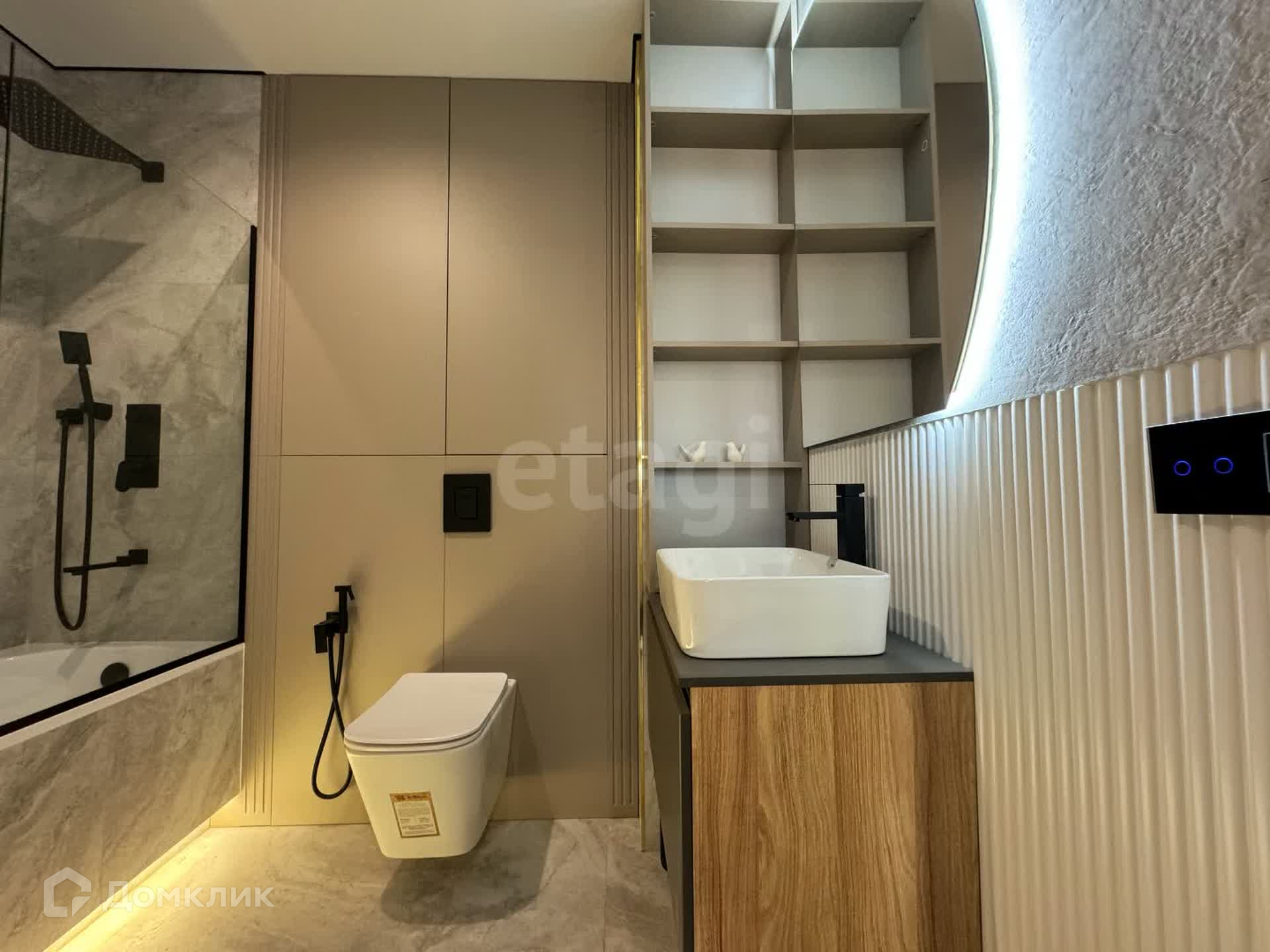 Два эргономичных санузла с разными уровнями подсветки и вытяжки. В одном ванна, в другом душевая кабина.