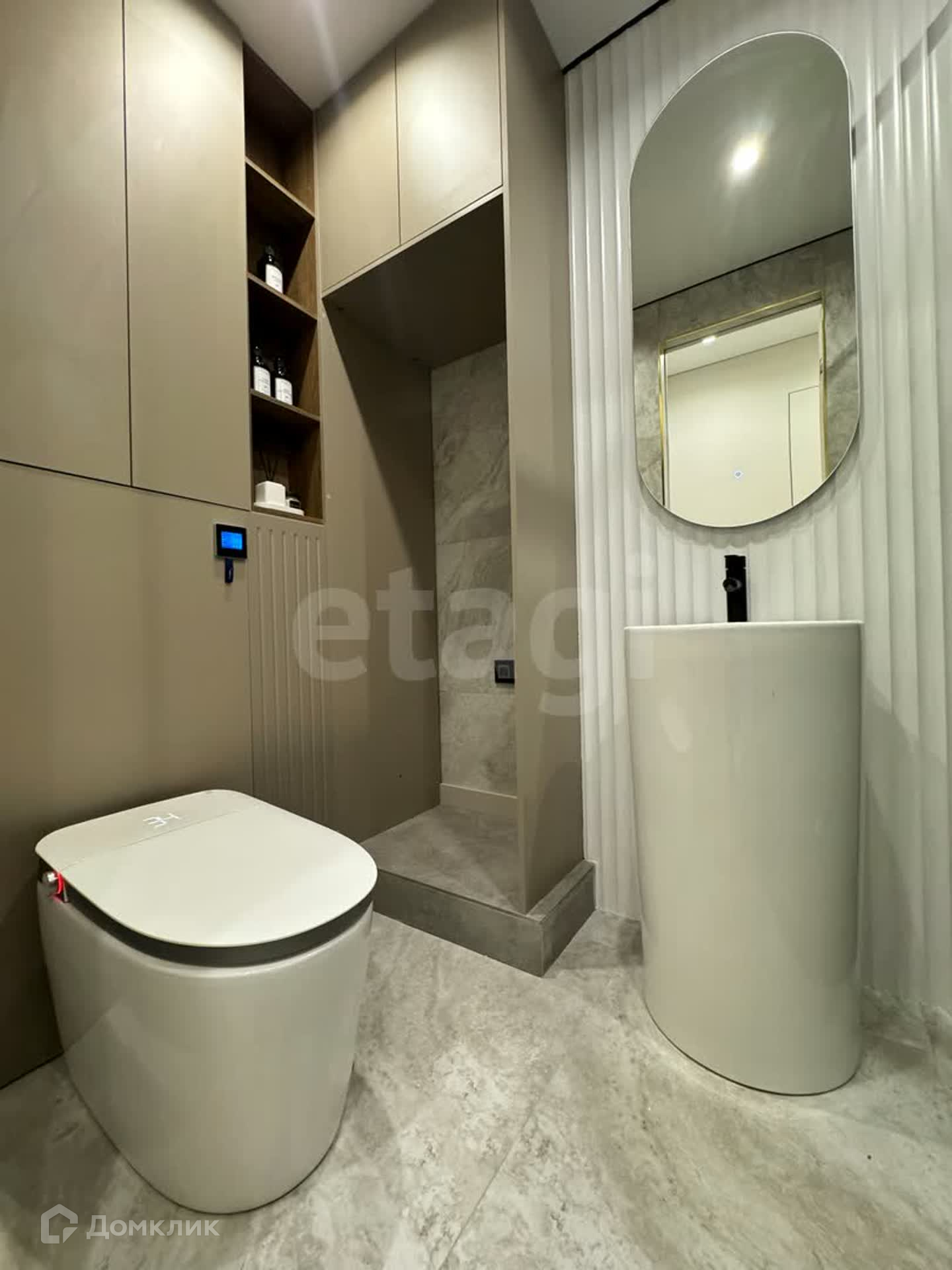 Умный унитаз с подсветкой, который показывает температуру в санузле, открывается при приближении к нему, управляется с пульта по функциям.