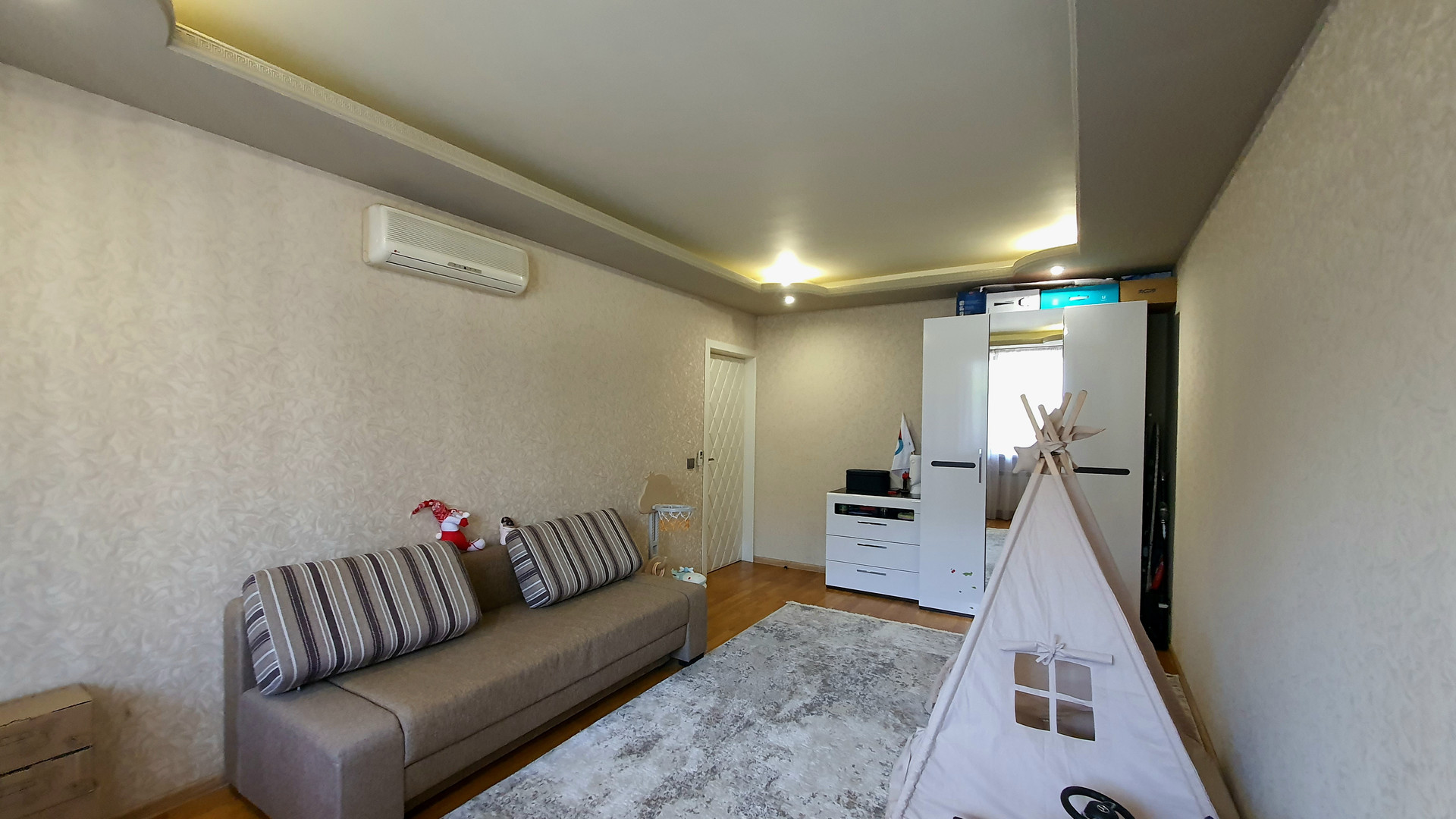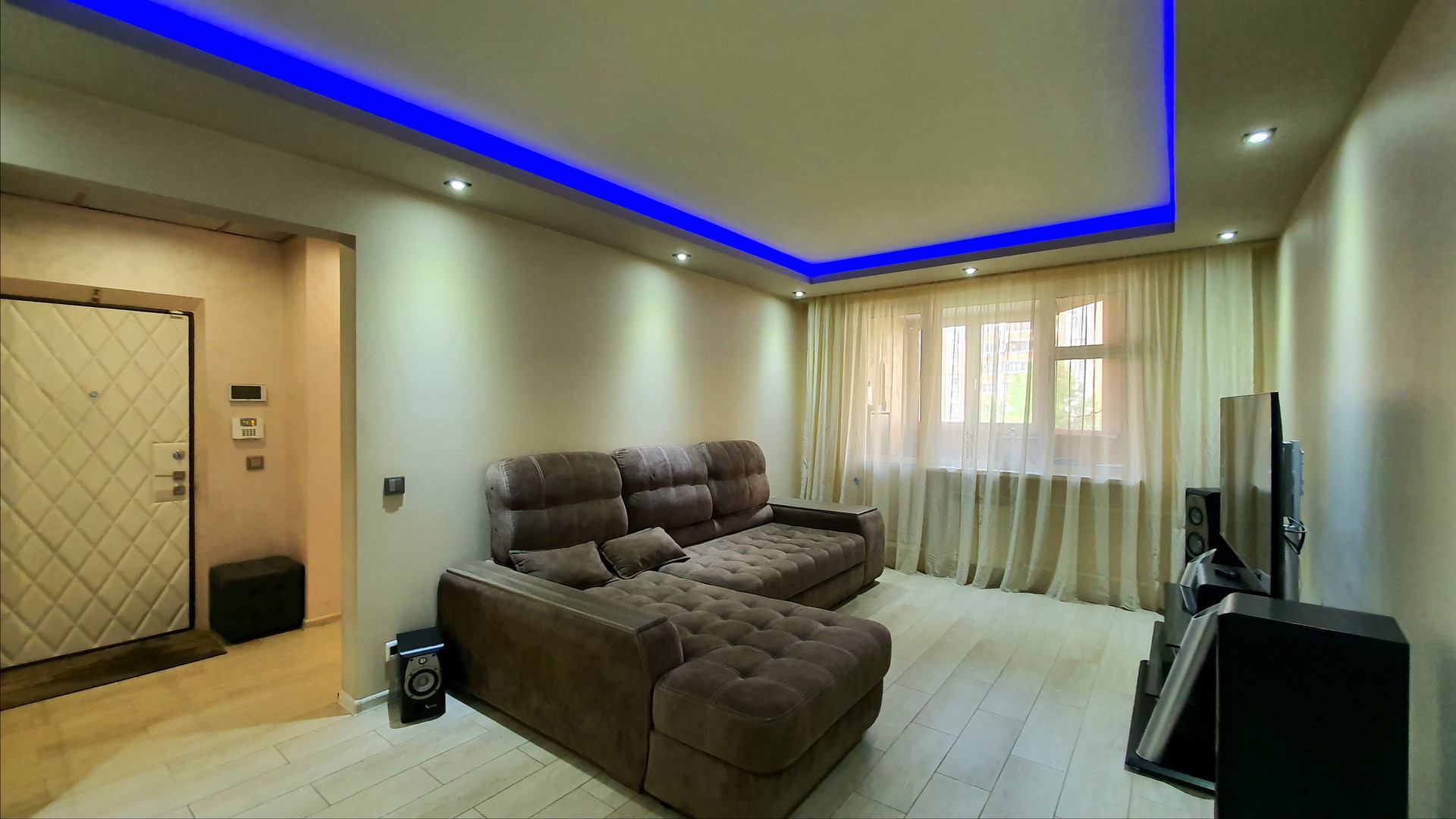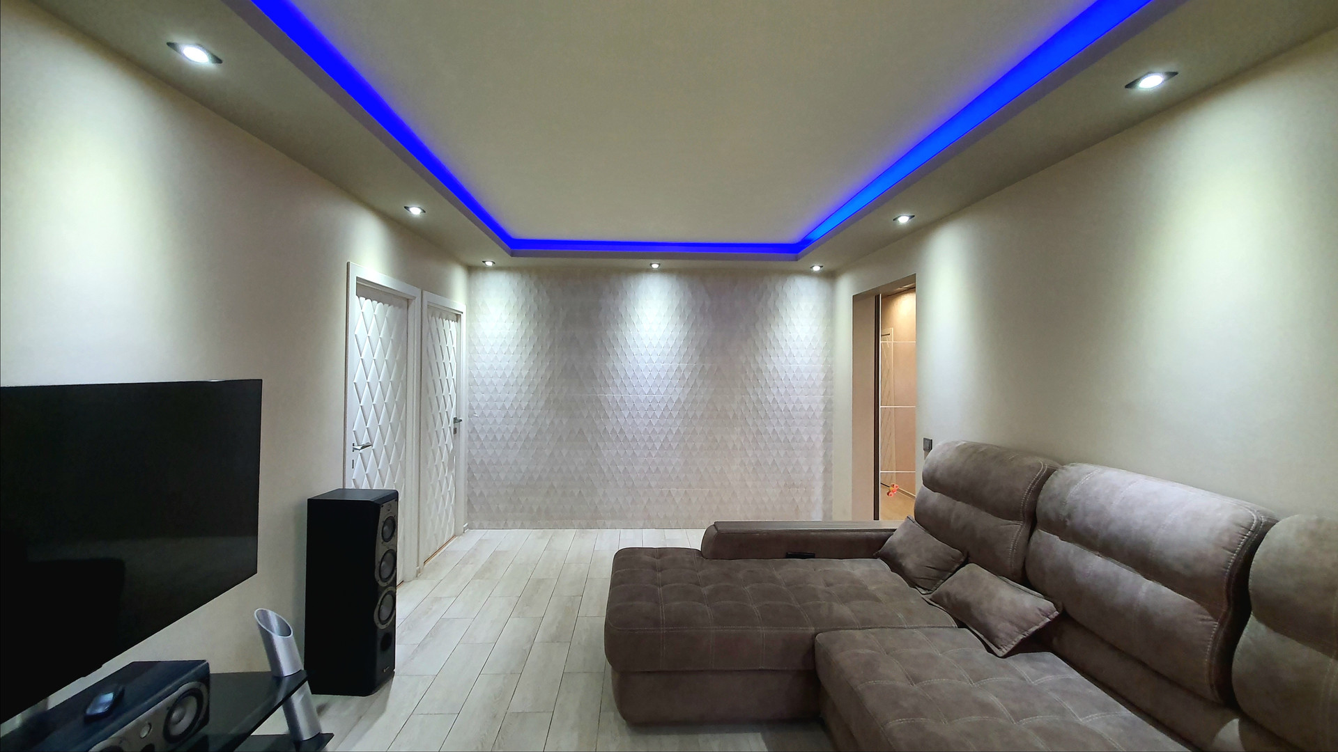 •    объединили комнату с коридором – теперь это функциональная гостиная для совместного просмотра семейного кино и проведения времени вместе;