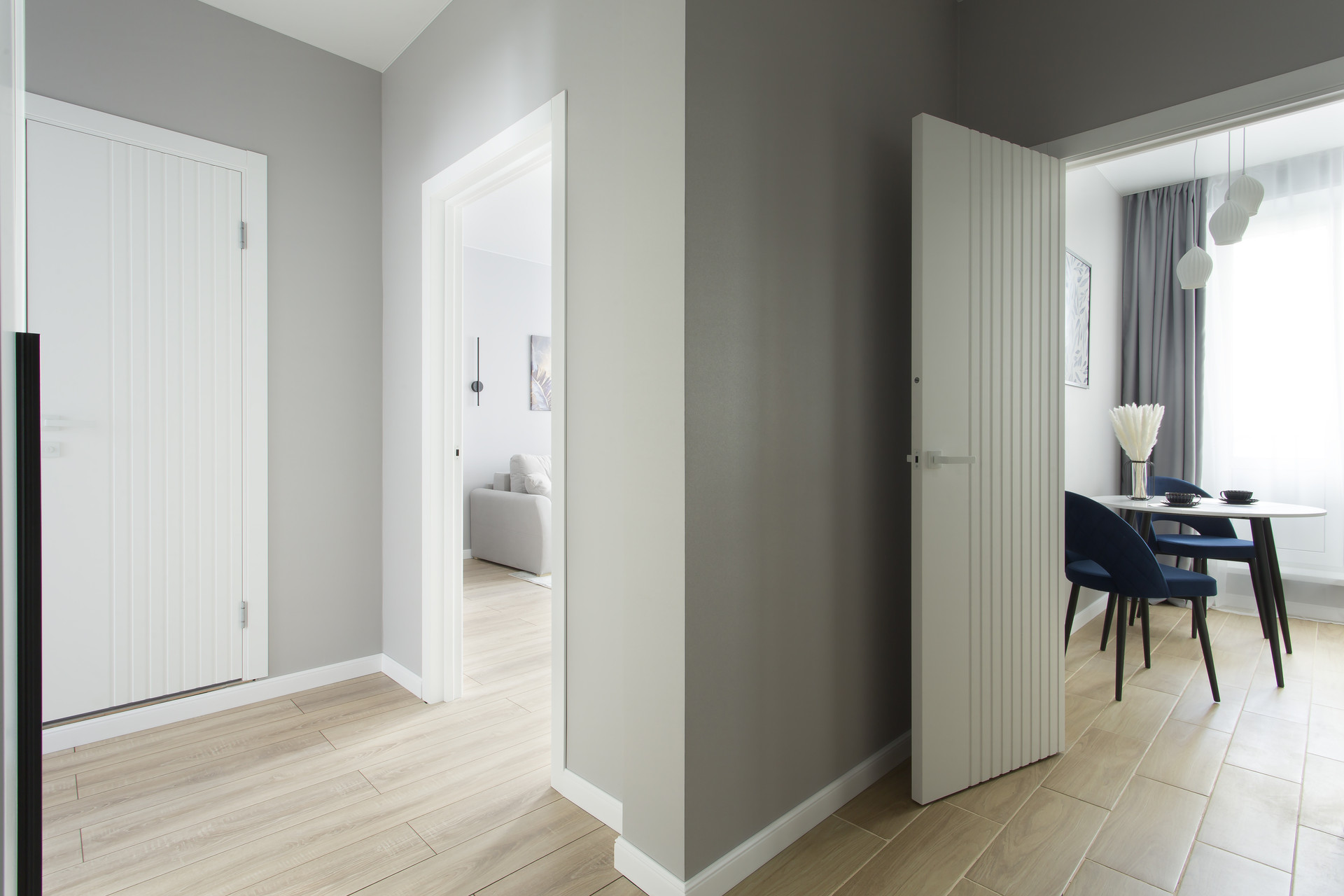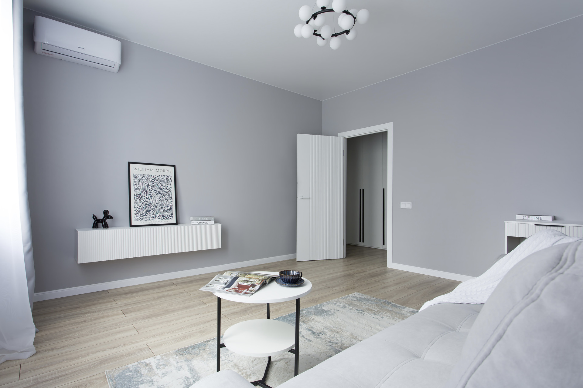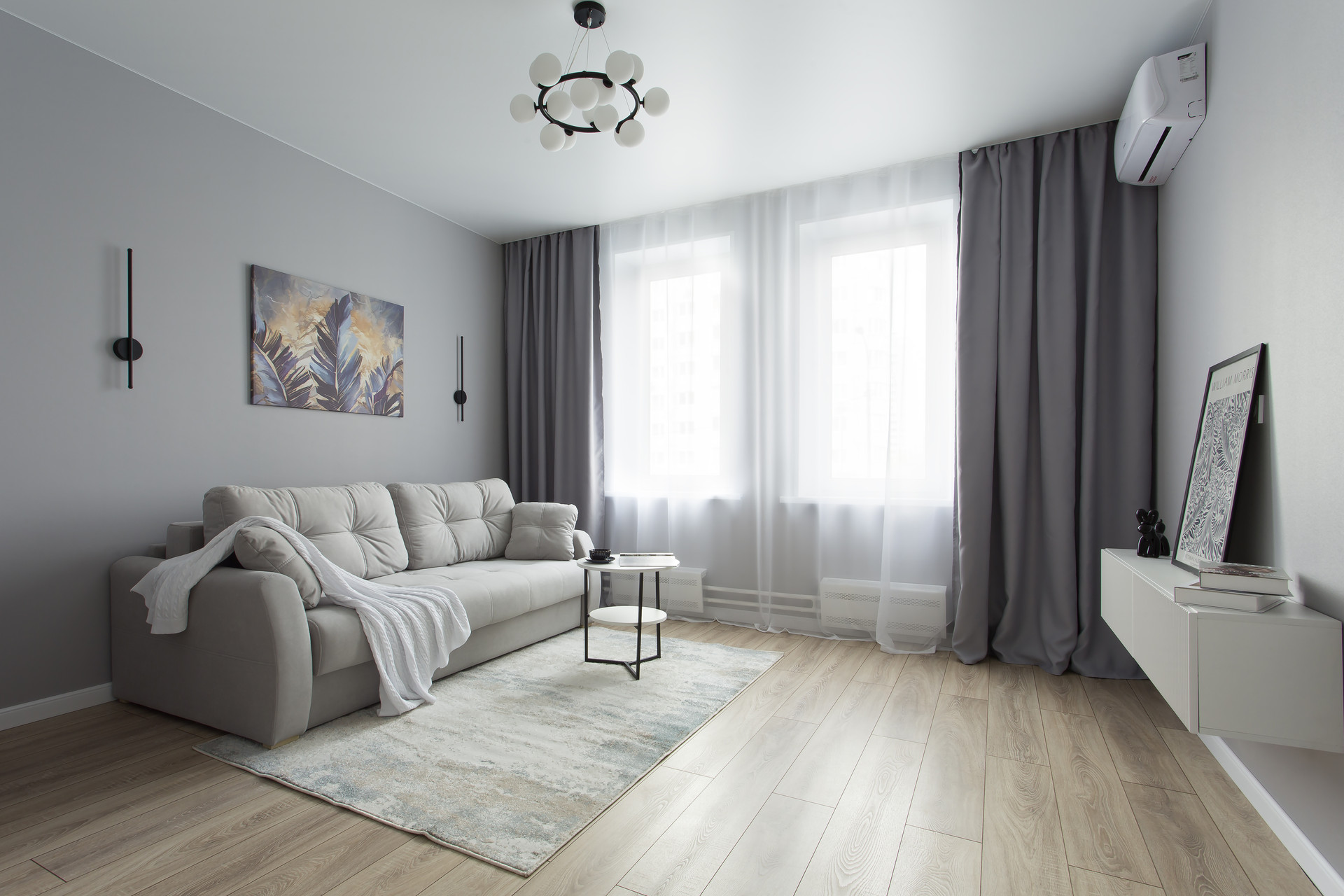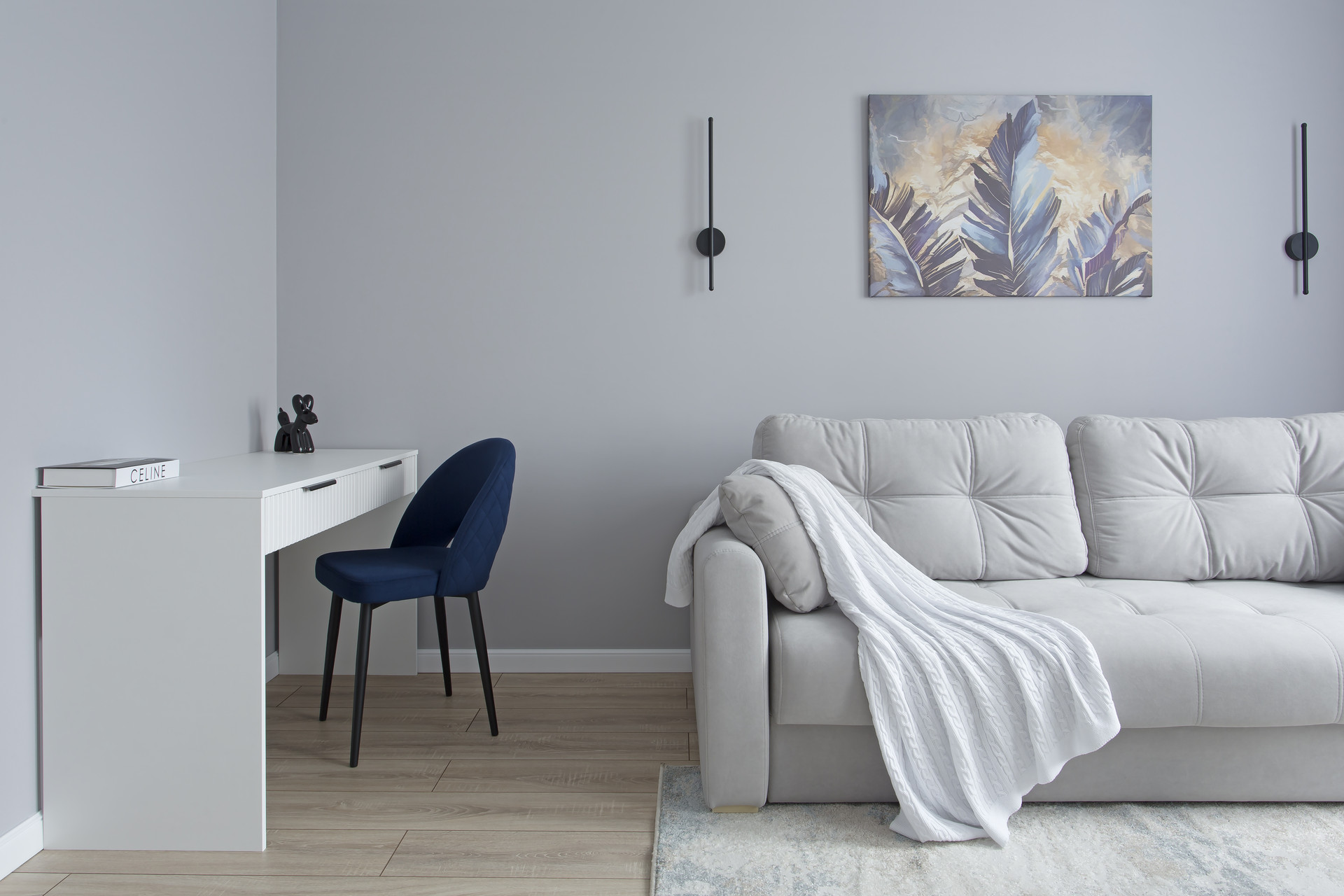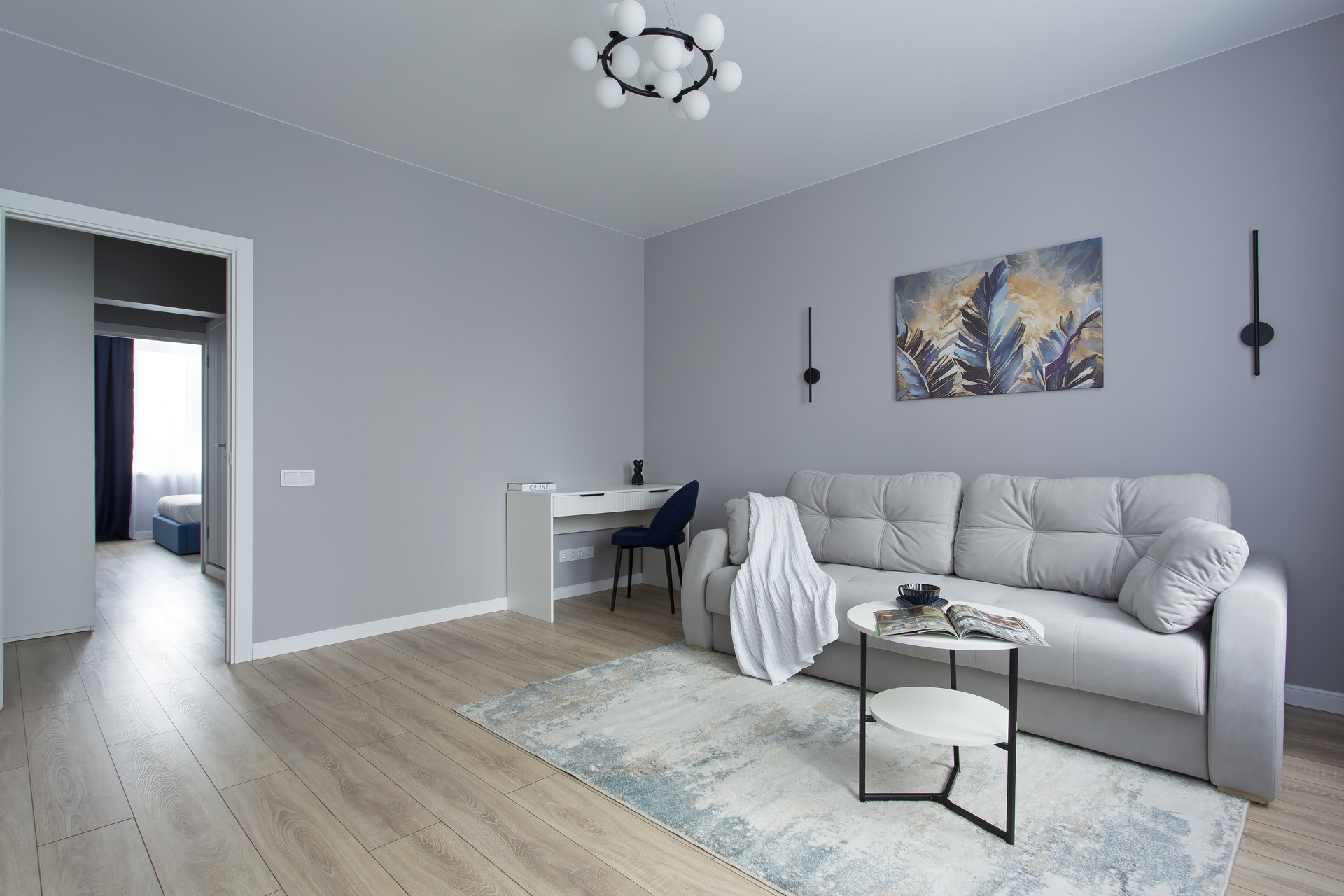 Вторая комната в нейтральных тонах может быть трансформирована в детскую, гостиную, кабинет или комнату по вашему назначению, а раскладной диван обеспечит полноценное спальное место.