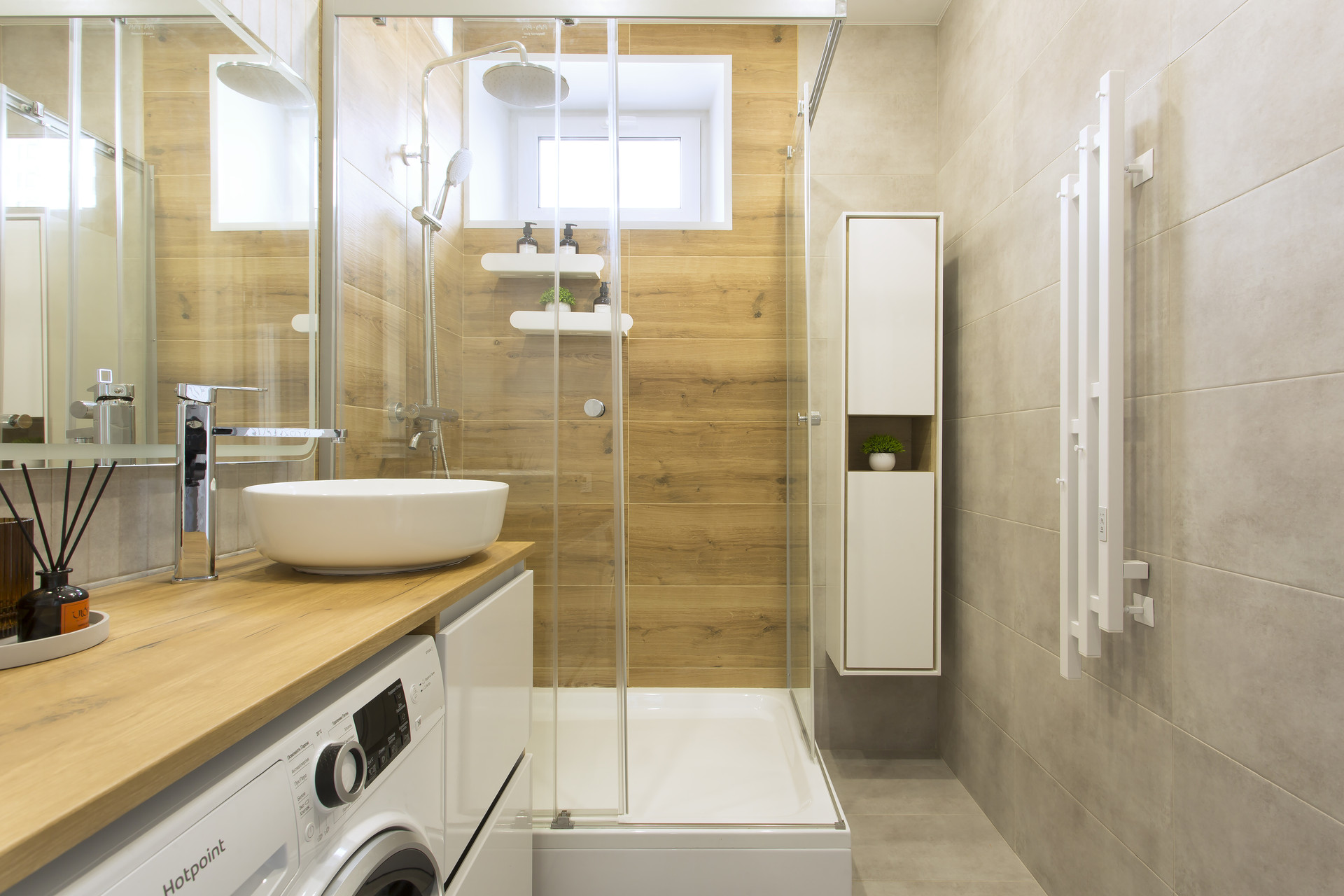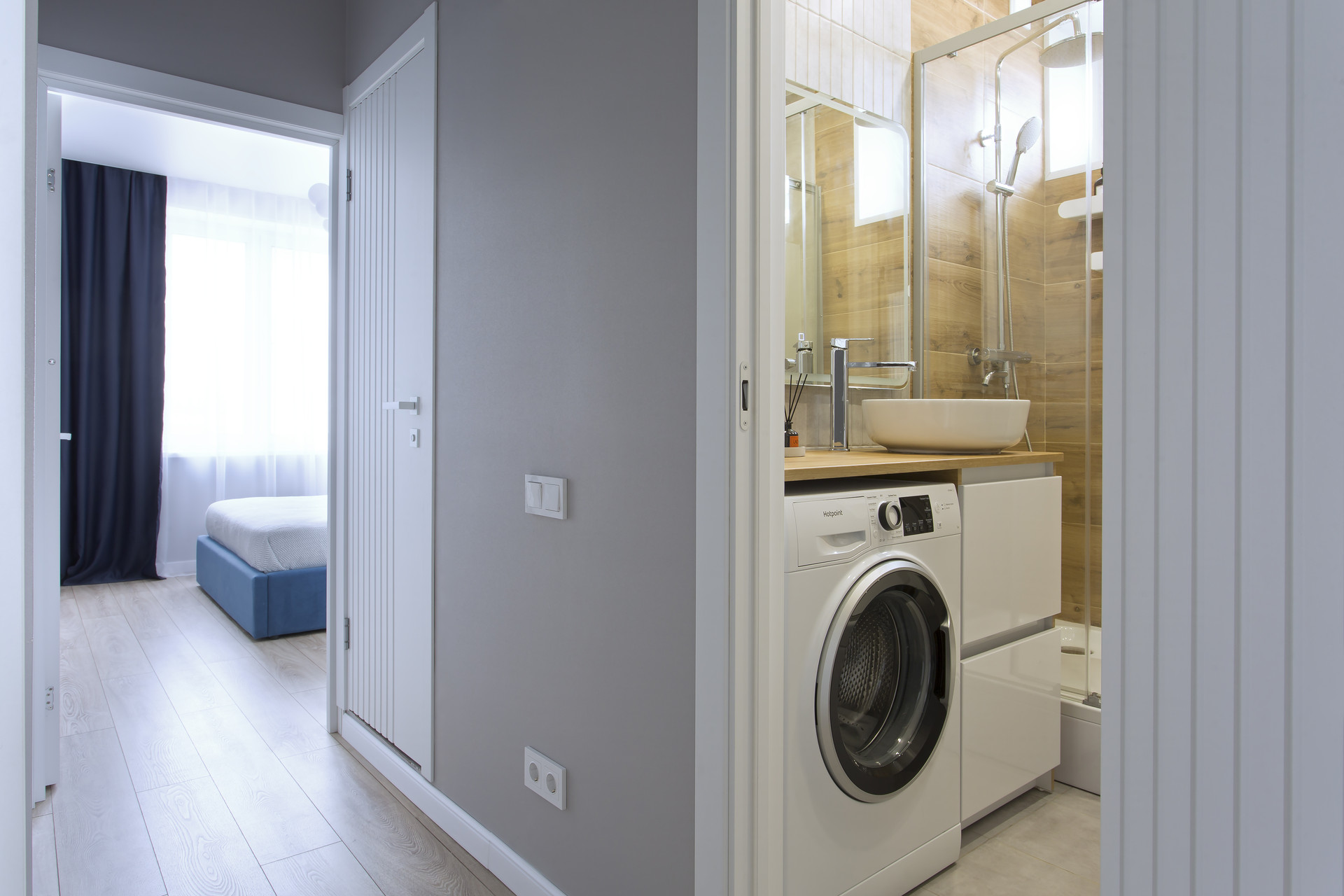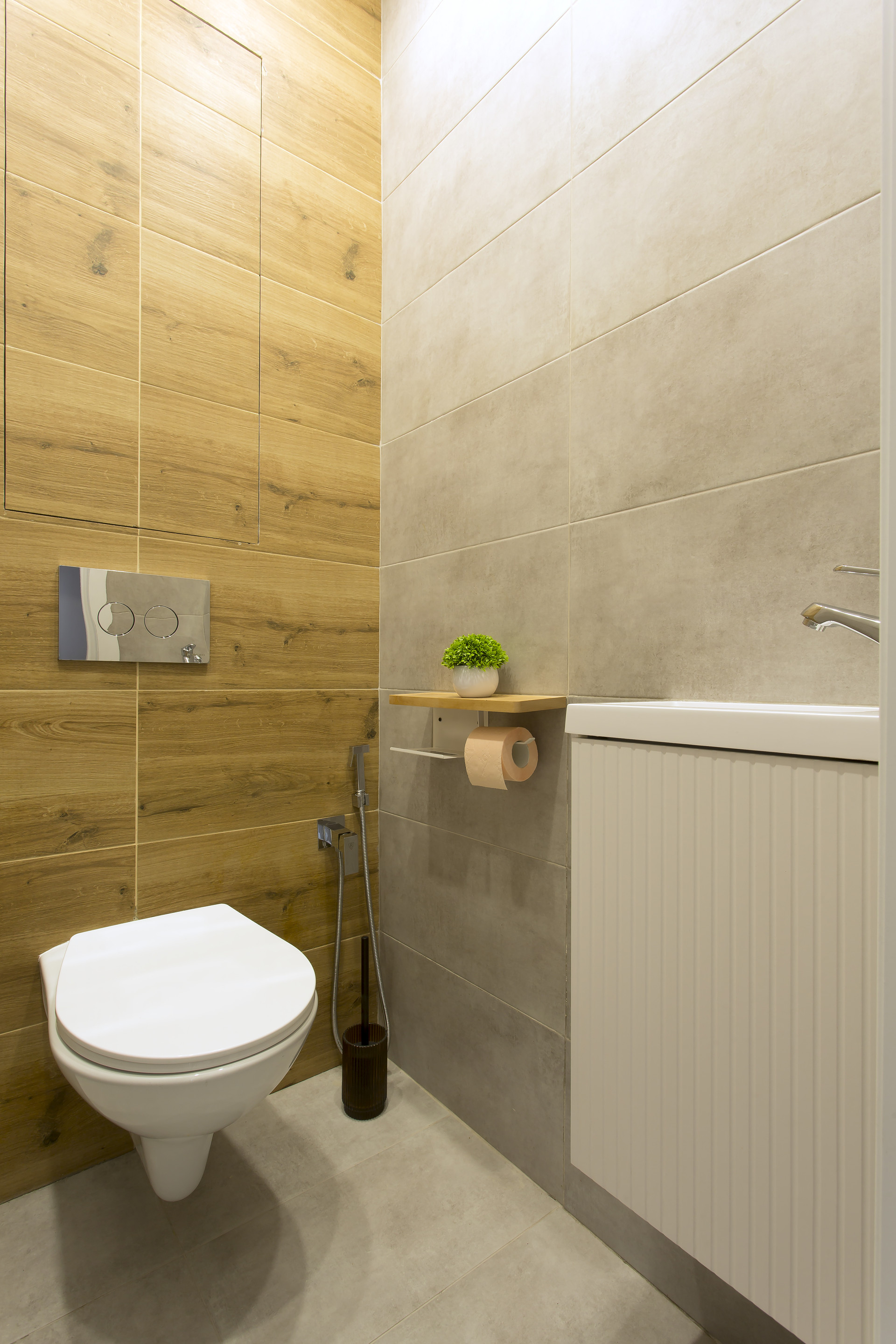 В раздельном санузле предусмотрен гигиенический душ и небольшая раковина. Ванная комната оборудована просторной душевой, стиральной машиной, стильной раковиной и пеналом для хранения принадлежностей. Предусмотрен теплый пол с датчиком регулировки температуры и бойлер для нагрева воды в сезон отключения.