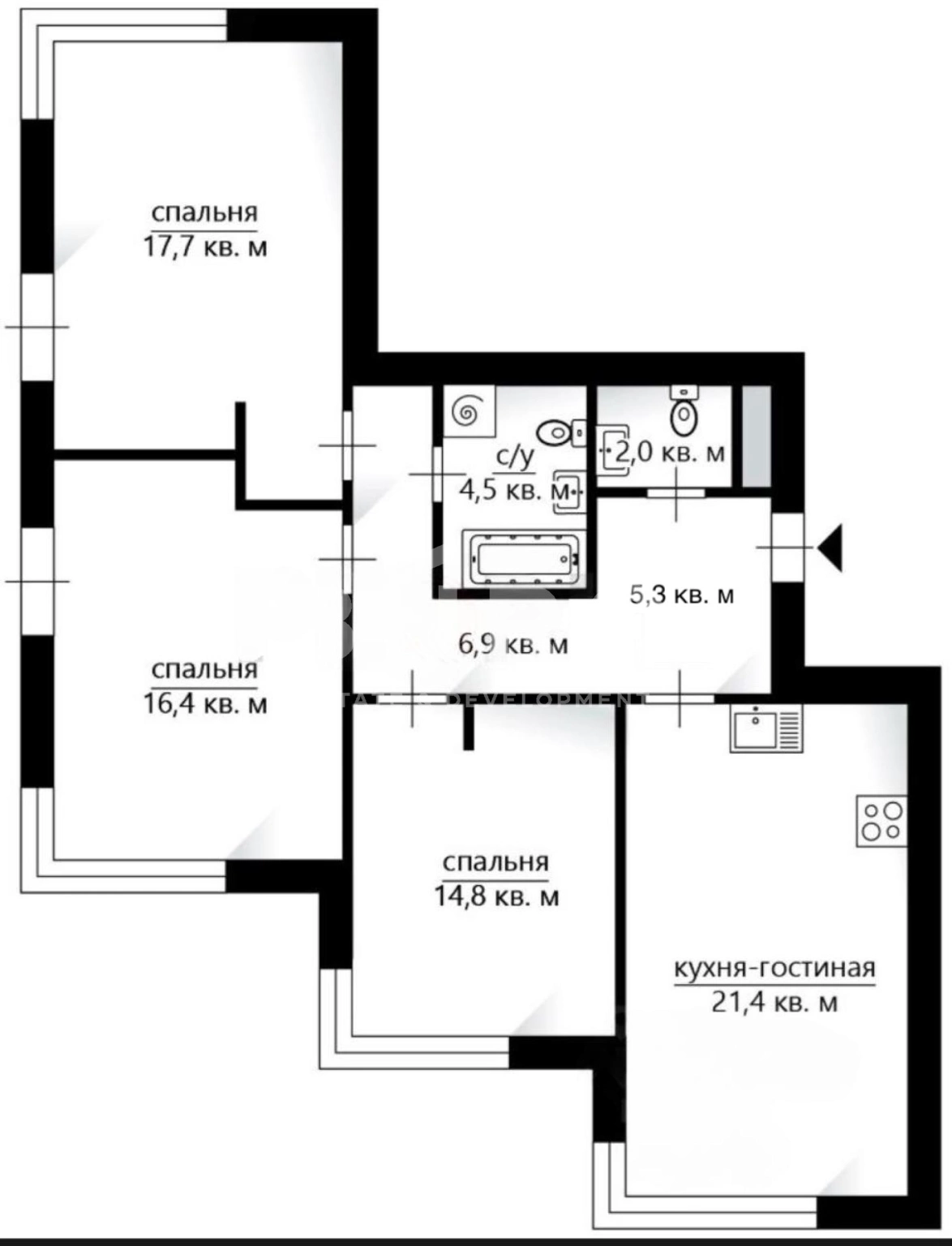 Планировка позволяет сделать: кухню-гостиную, 3 спальни, 2 санузла и постирочную.
