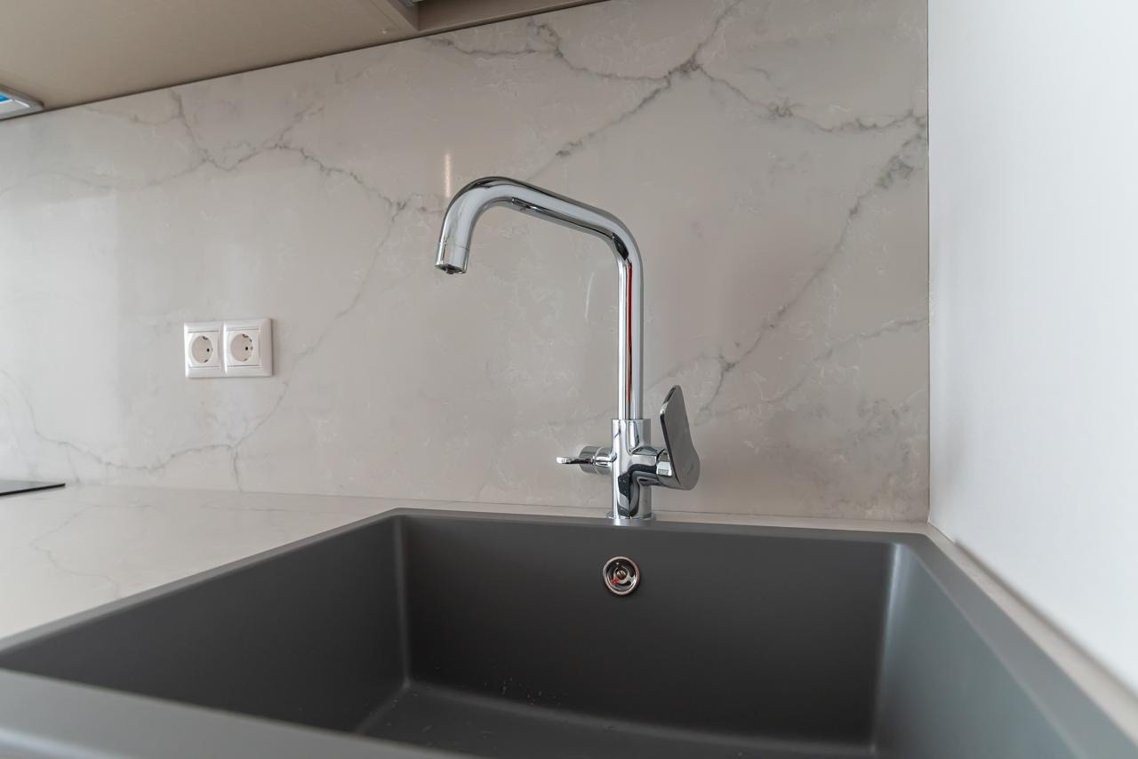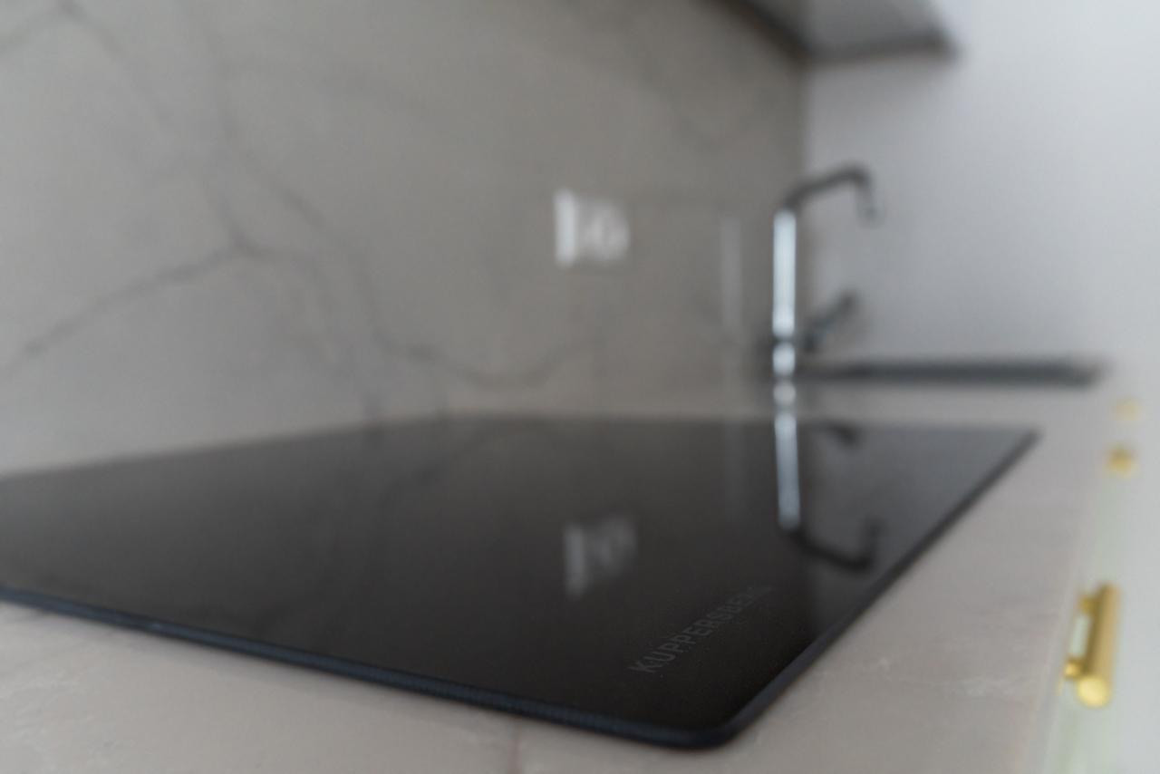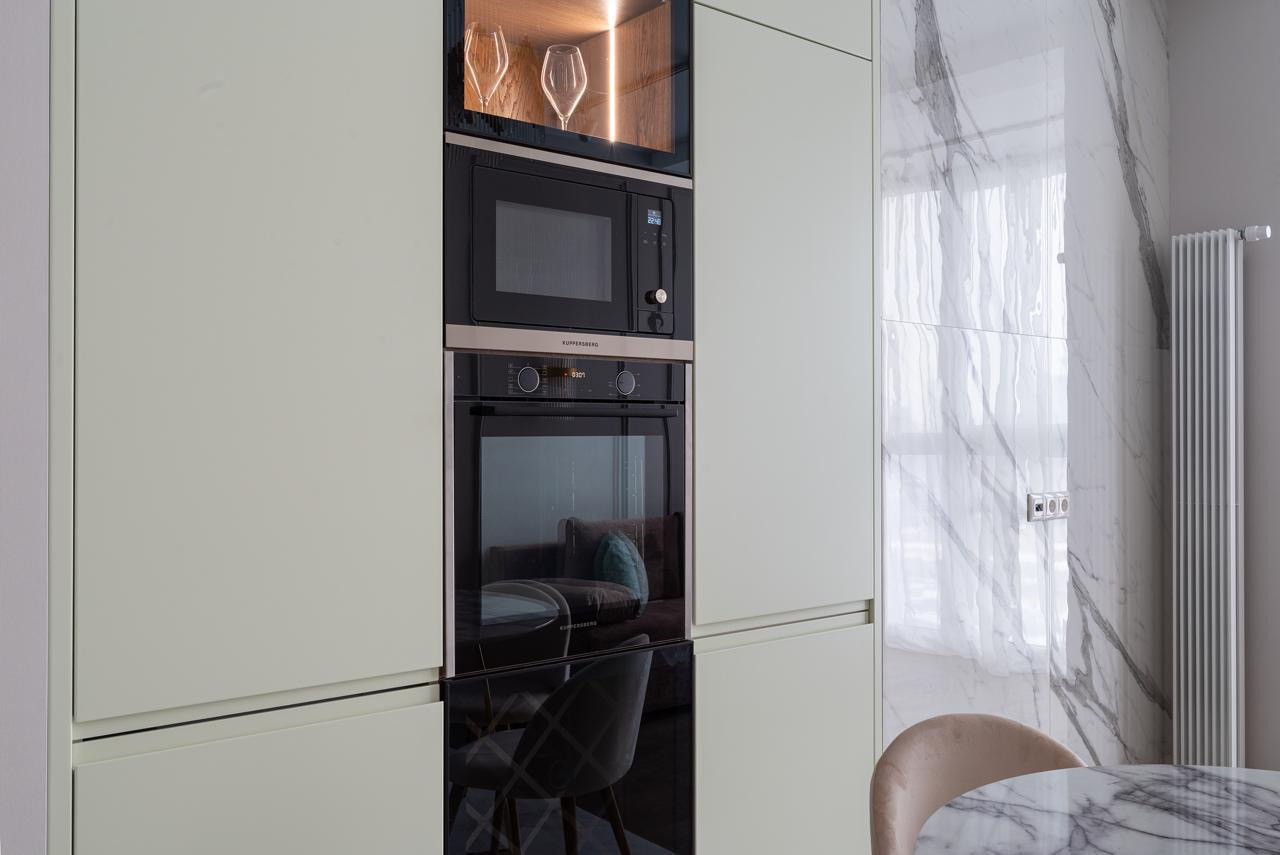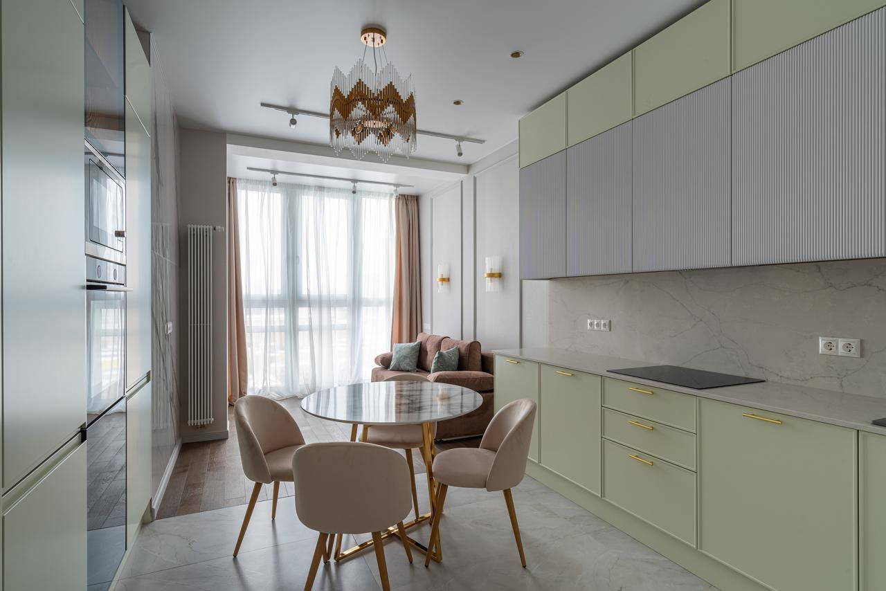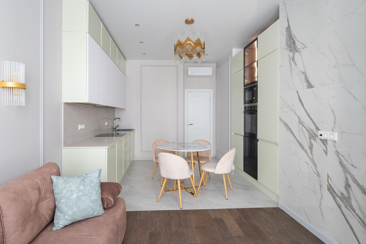 Кухня-гостинная, мастер-спальня с ванной и гардеробной, еще одна комната может быть использована как детская, кабинет или спальня по Вашему усмотрению, 2 санузла (включая душевую и ванную комнату). Все укомплектовано новой мебелью и техникой, включая варочную панель, духовку, посудомоечную машину, микроволновая печь, холодильник, стиральная машина (вся техника ведущих производителей, новая, никто не пользовался). Кондиционеры установлены во всех комнатах и в кухне-гостиной. Полы выполнены с использованием высококачественной паркетной доски, массив дуба.