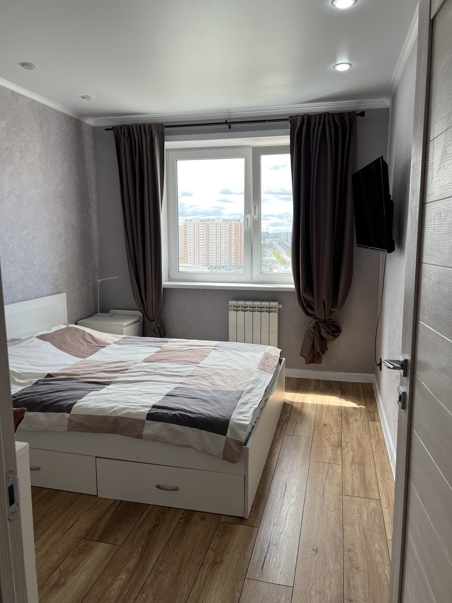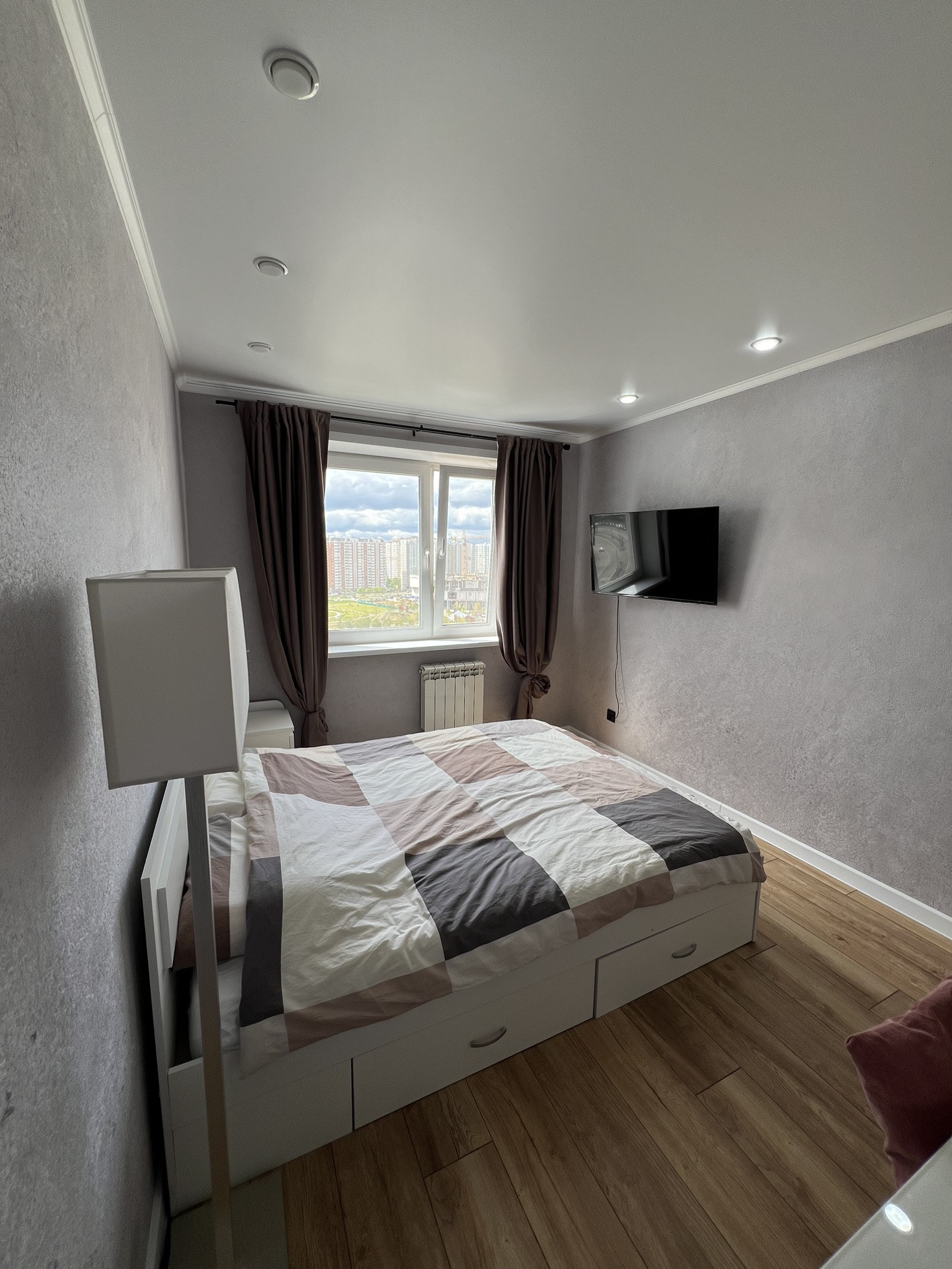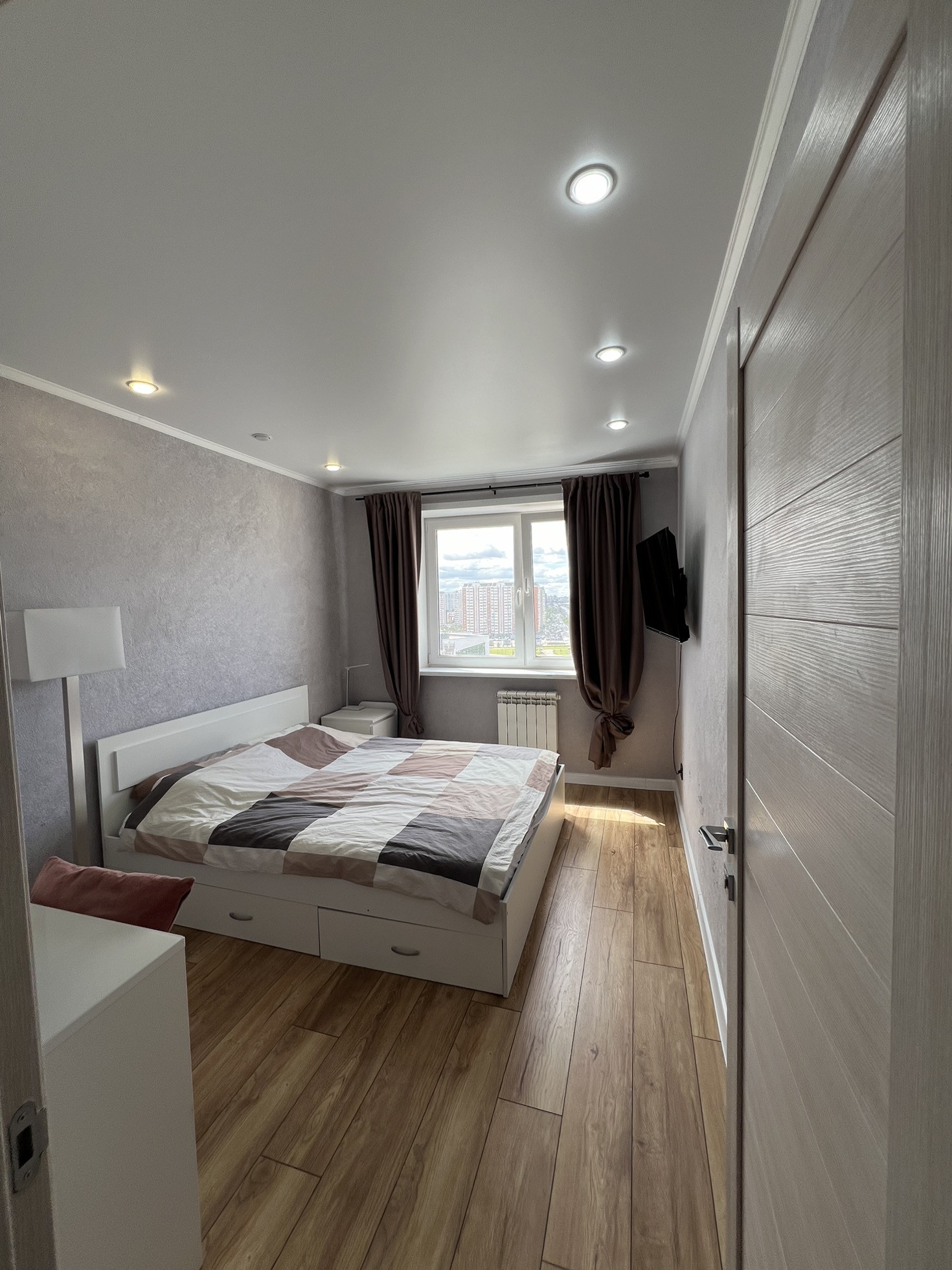 В маленькой комнате заменены окно и батарея, натяжной потолок.