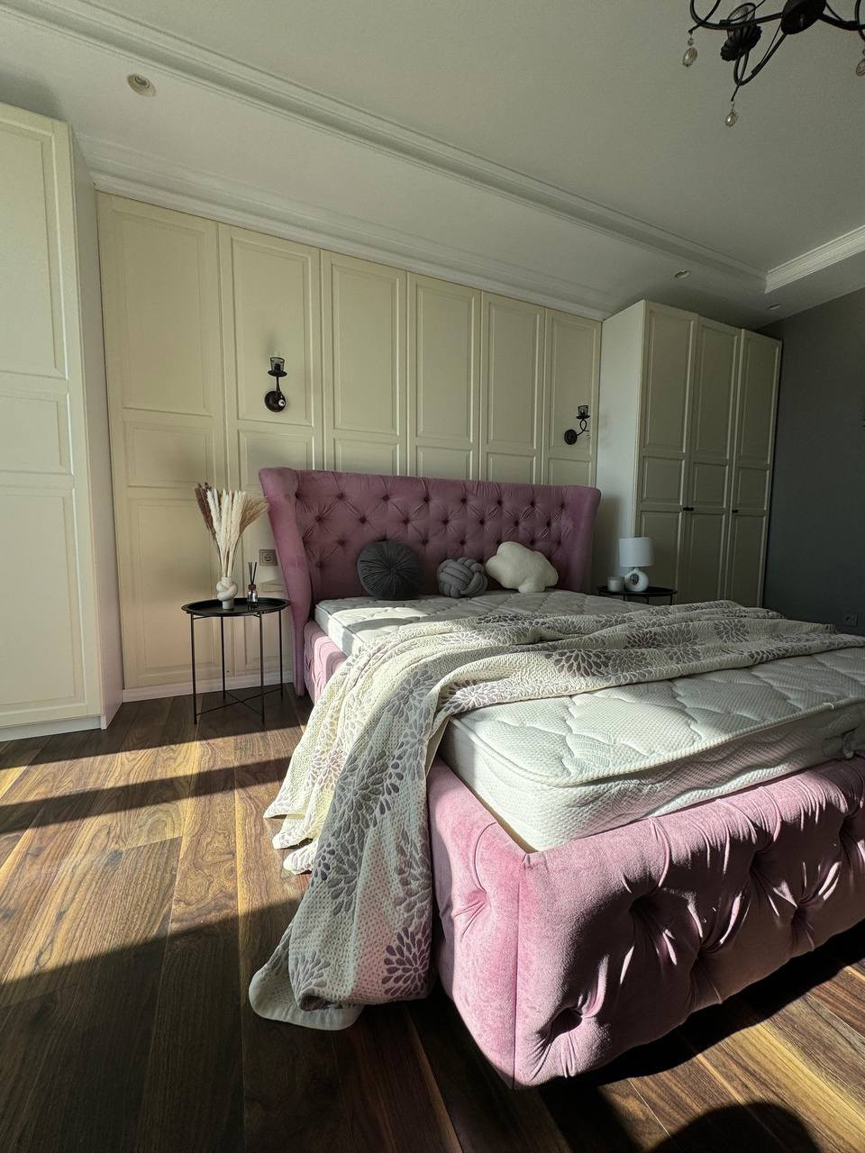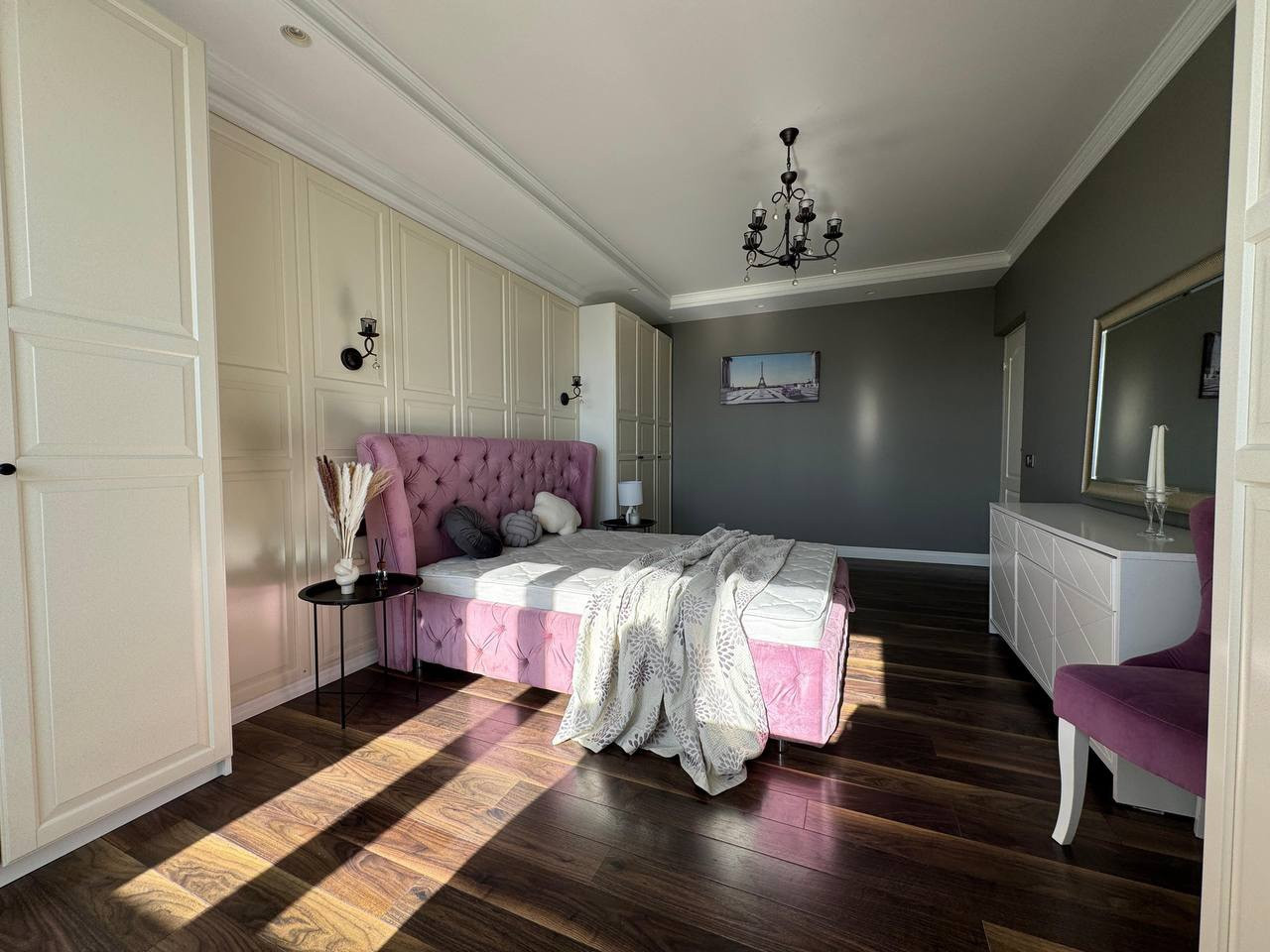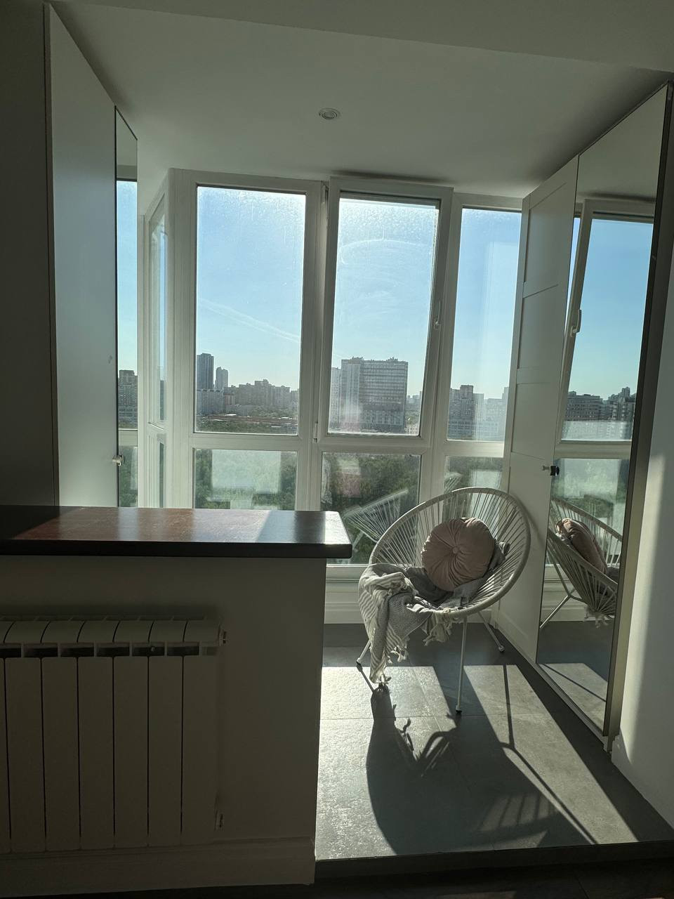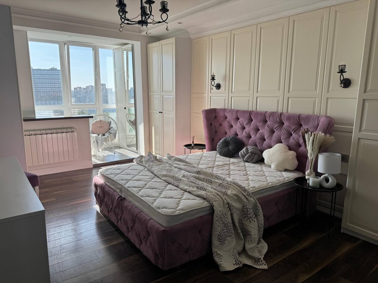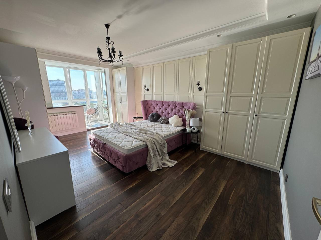 В спальне витражное остекление с видом на сквер. Кровать 160*200 с подъемным механизмом. Мест для хранения много ( 3 шкафа+2 на балконе). Шкафы в отличном состоянии.