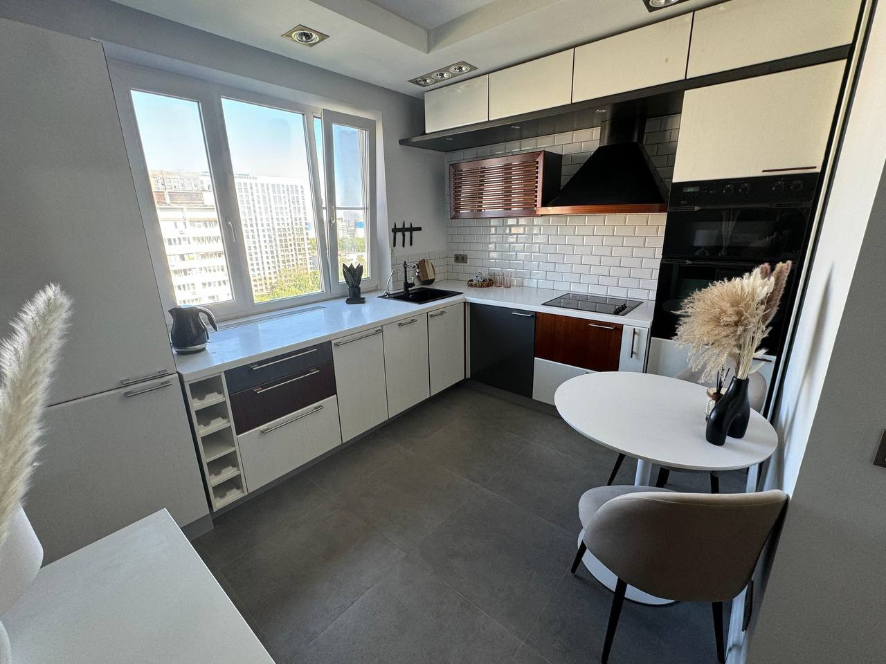 Кухня с большой длинной гарнитурой вдоль окна с красивым видом. Встроенная итальянская техника в рабочем состоянии (микроволновка, духовка, холодильник, посудомоечная машина). Стиральная машинка Bosh с функцией сушки.