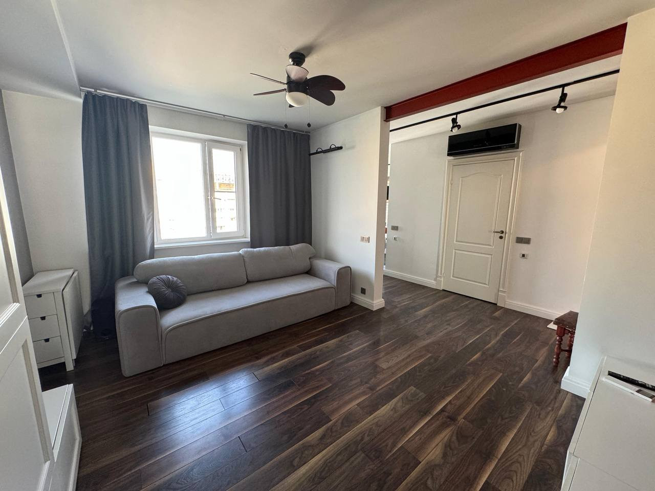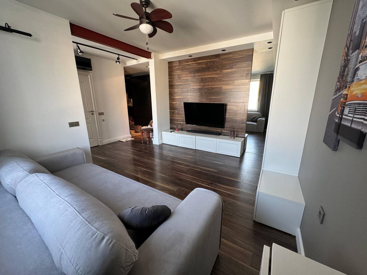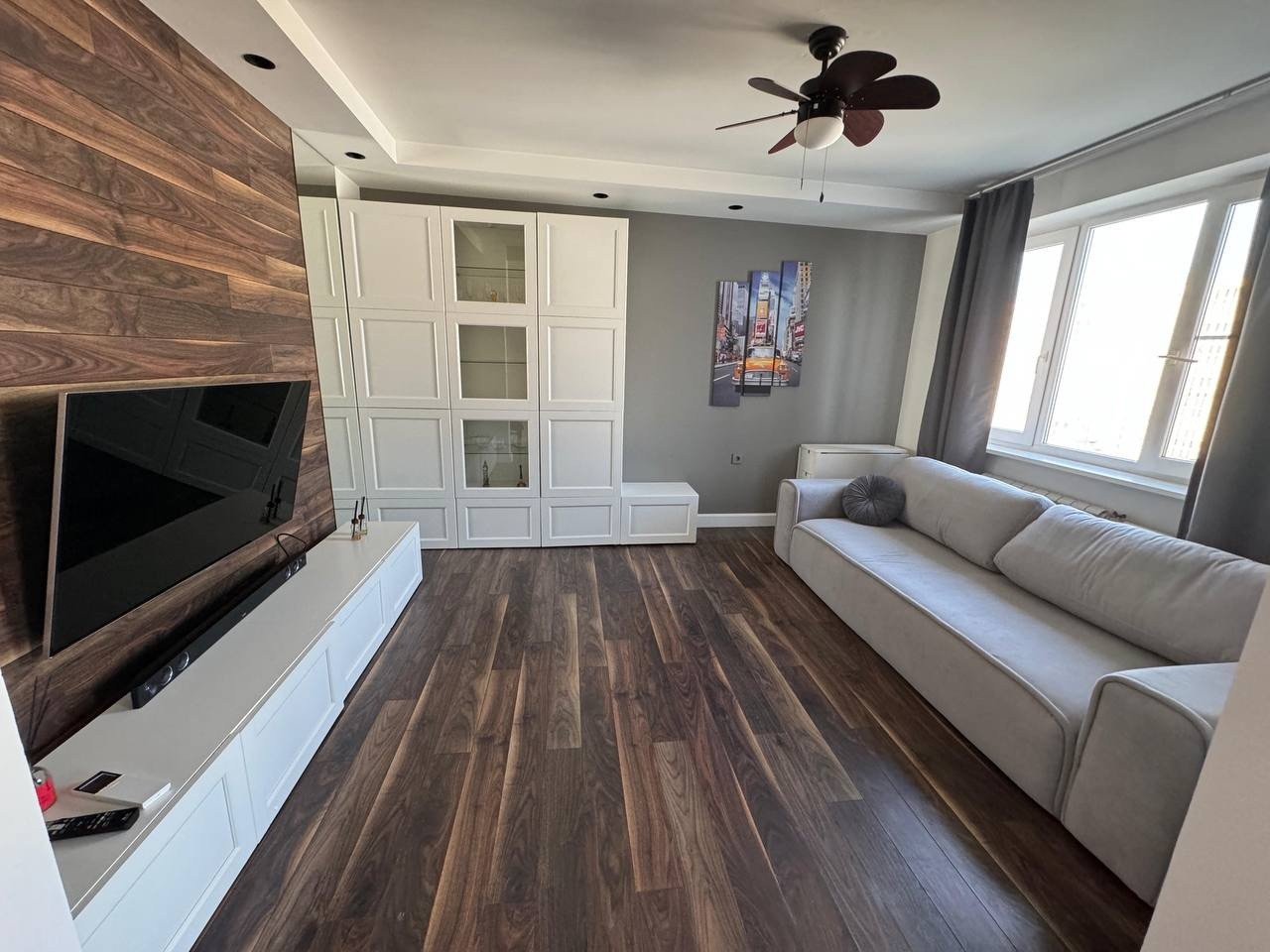 В зале диван новый раскладной. Телевизор 55 дюймов Samsung с функцией смарт тв. Саунд бар LG с колонкой.