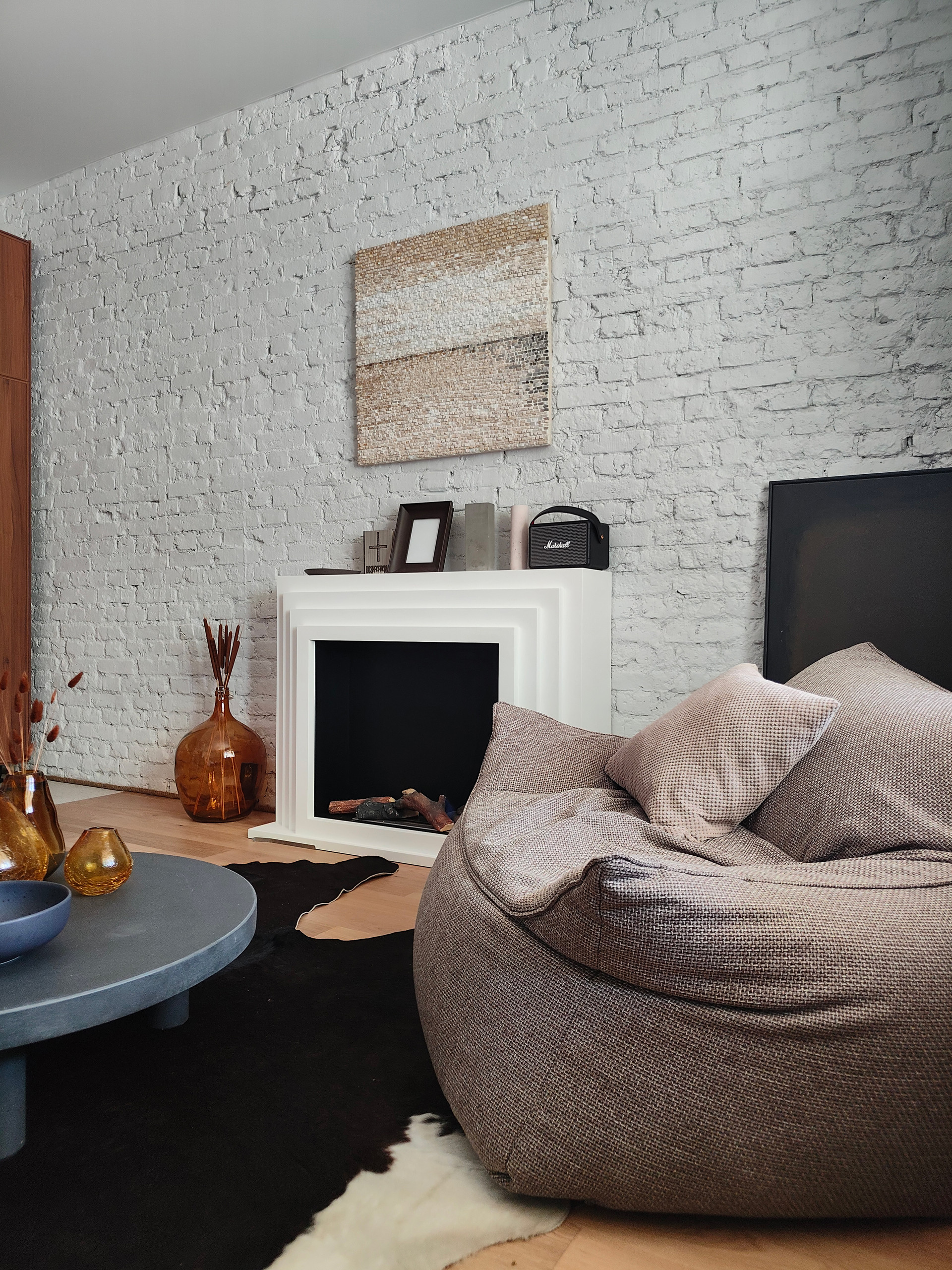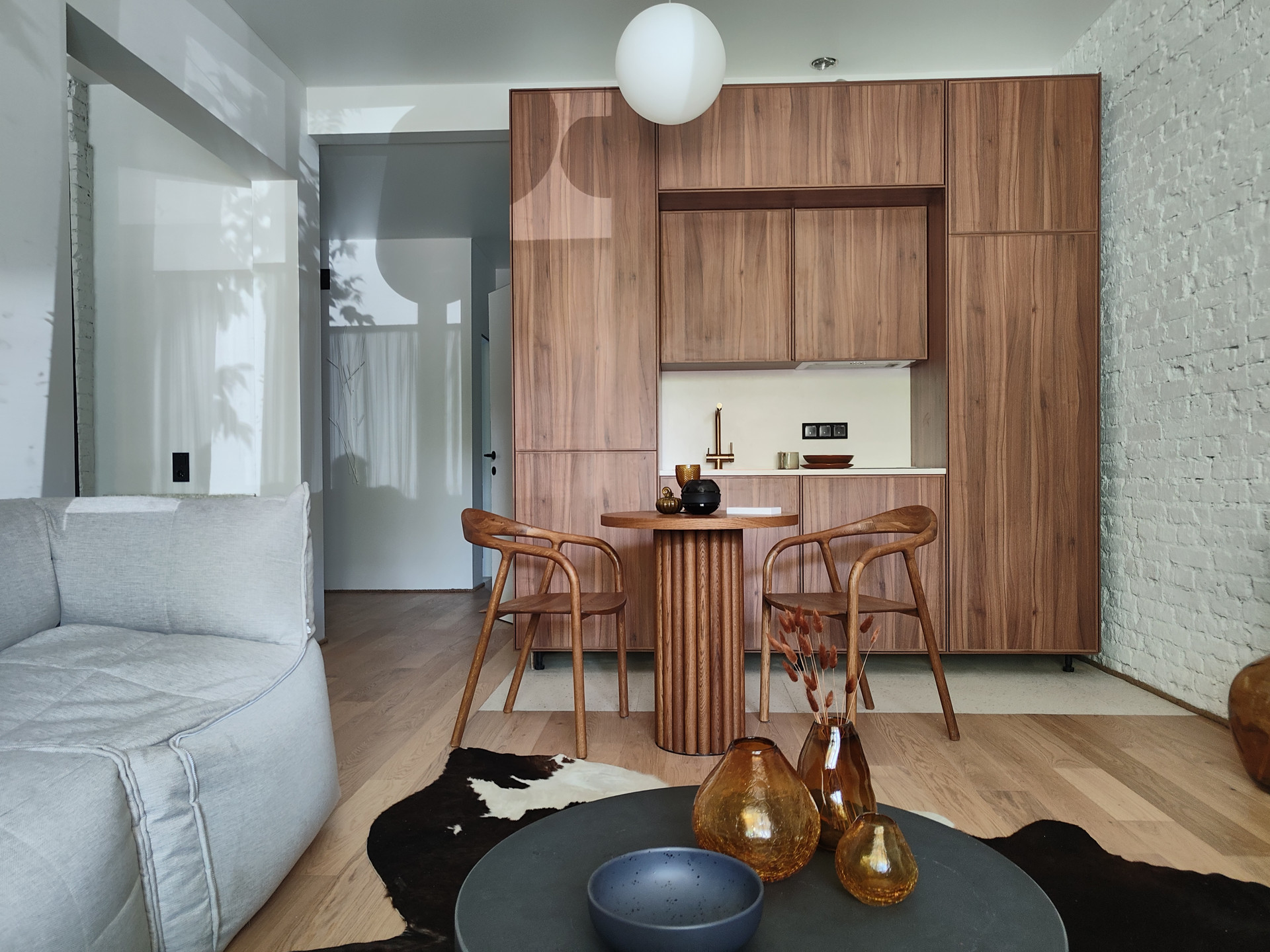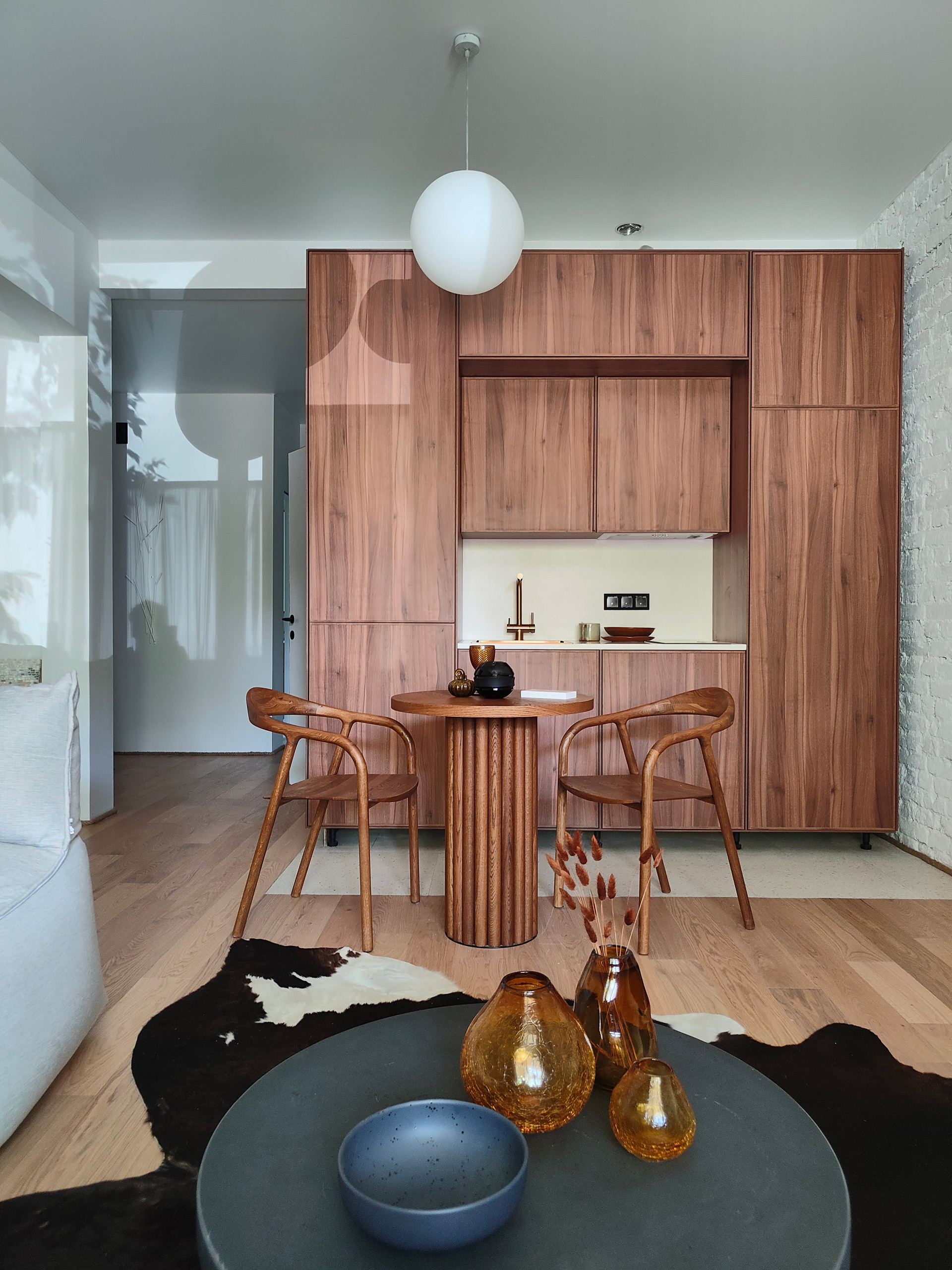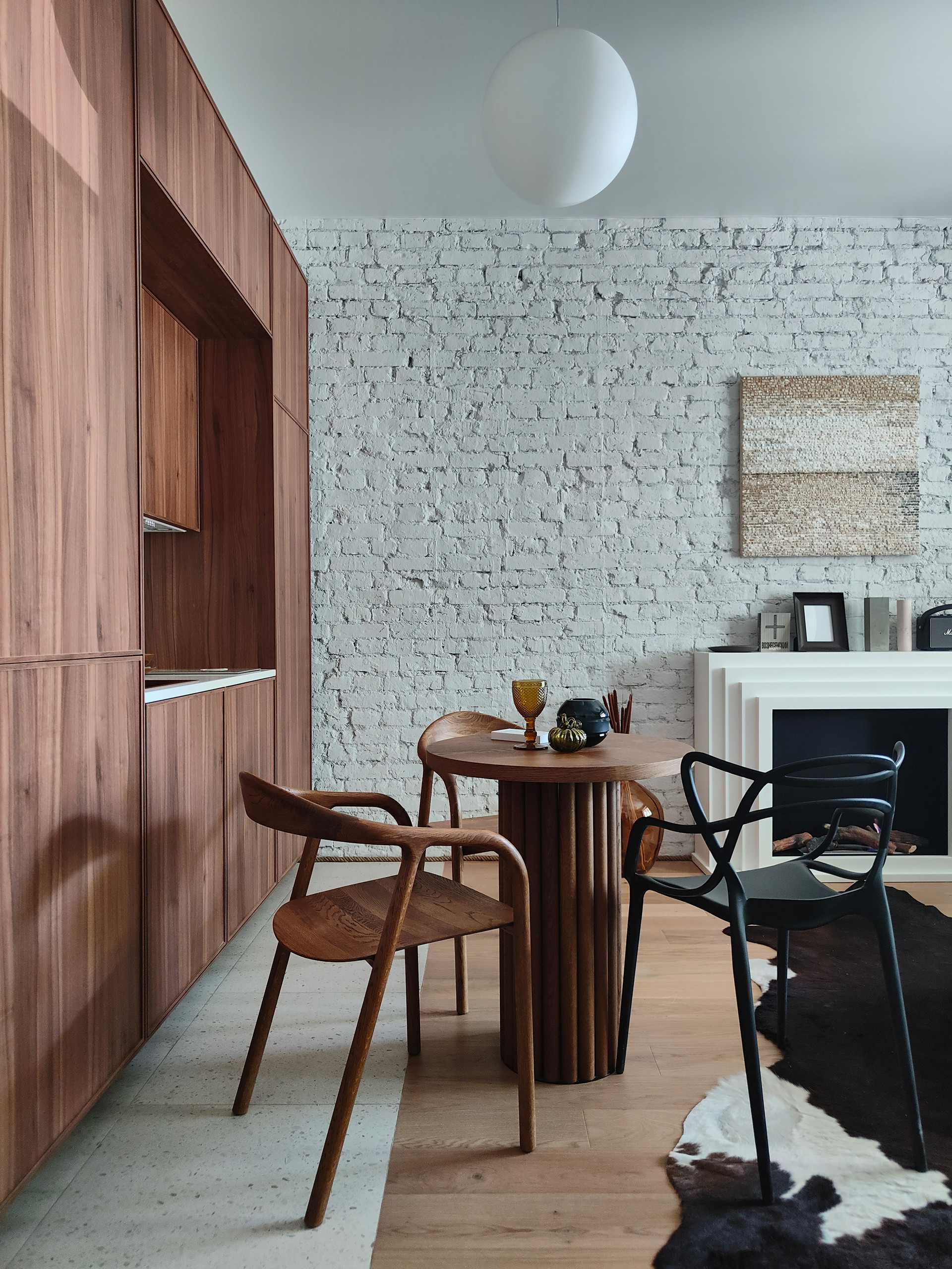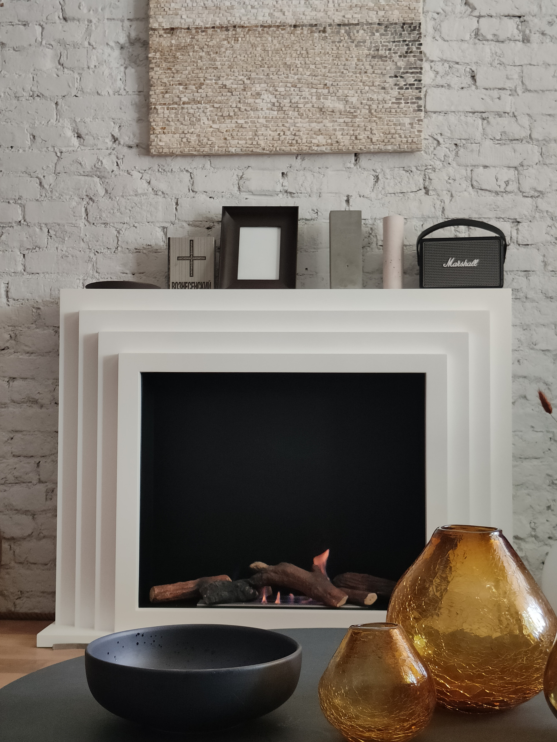 Новая кухня с каменной столешницей, латунной фурнитурой, индукционной плитой и вытяжкой. Новый био-камин.