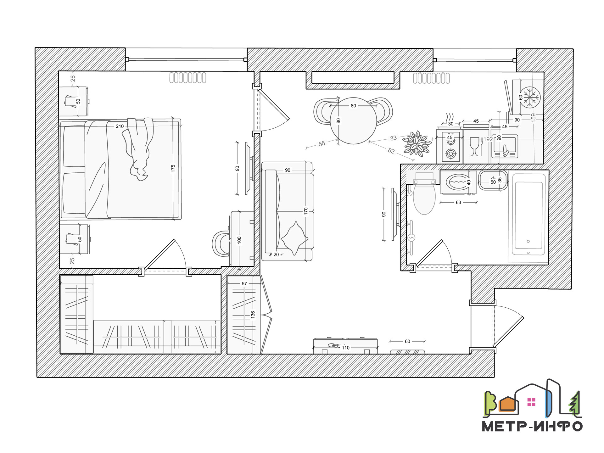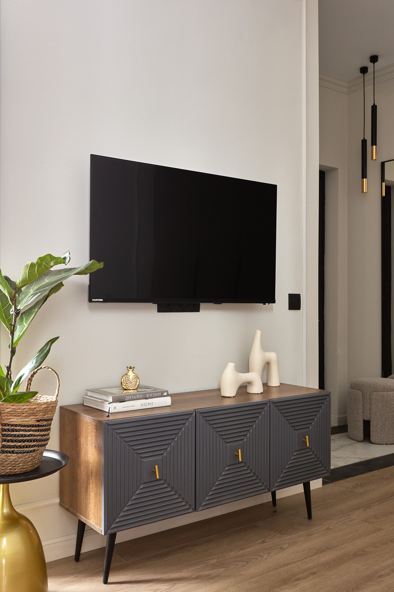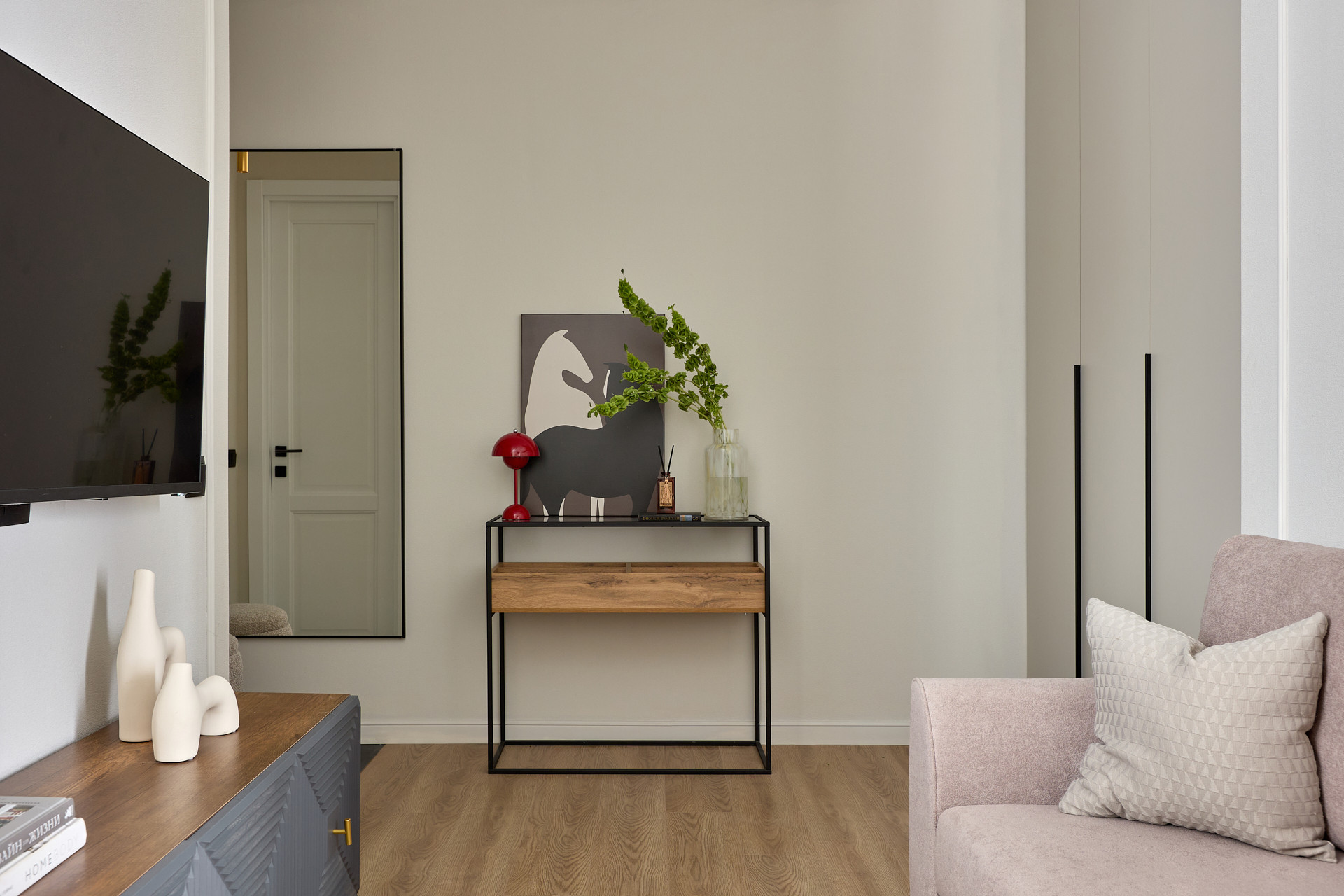 В уютной гостиной расположен раскладной диван и телевизор с подключением к интернету, кондиционер, встроенный шкаф.