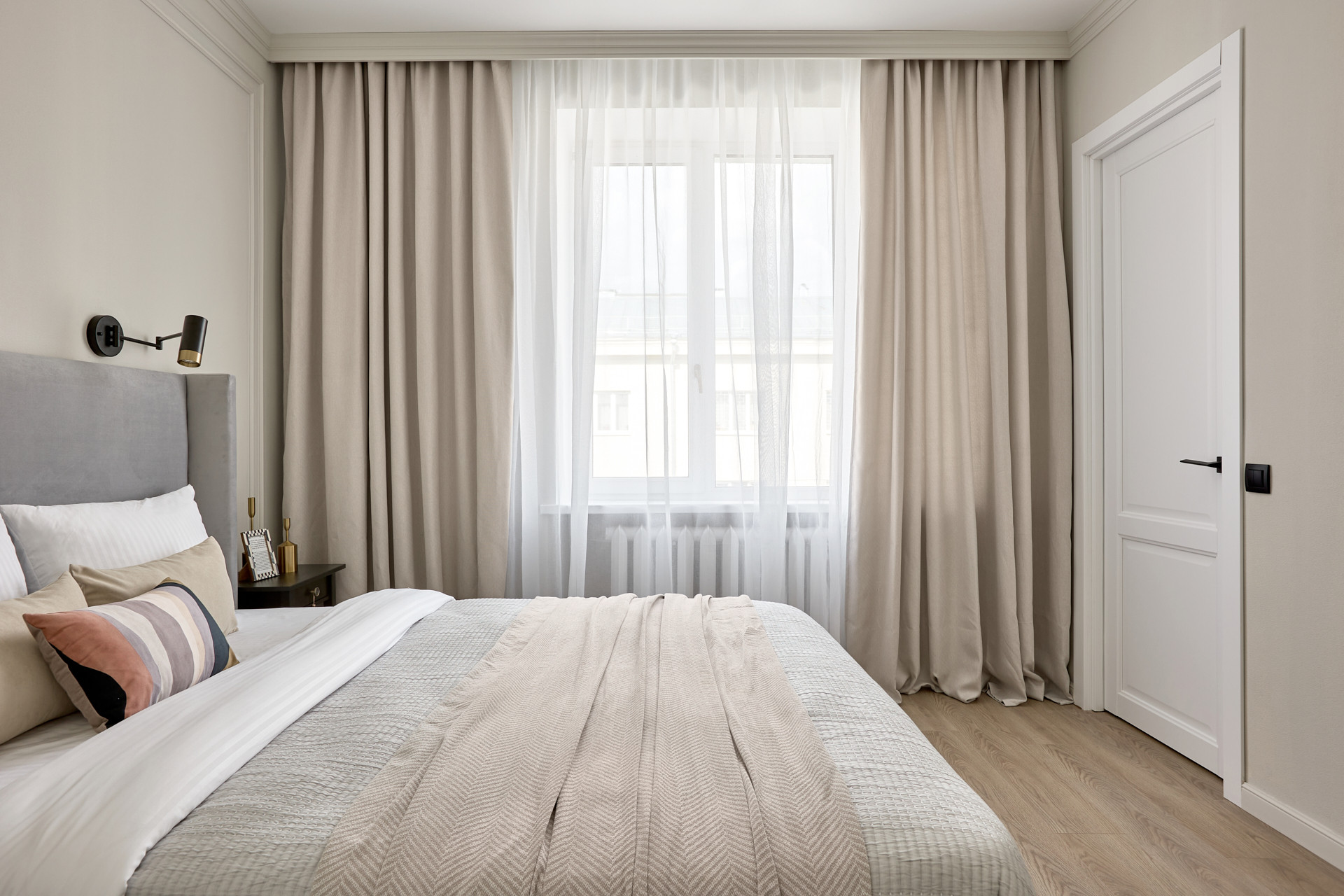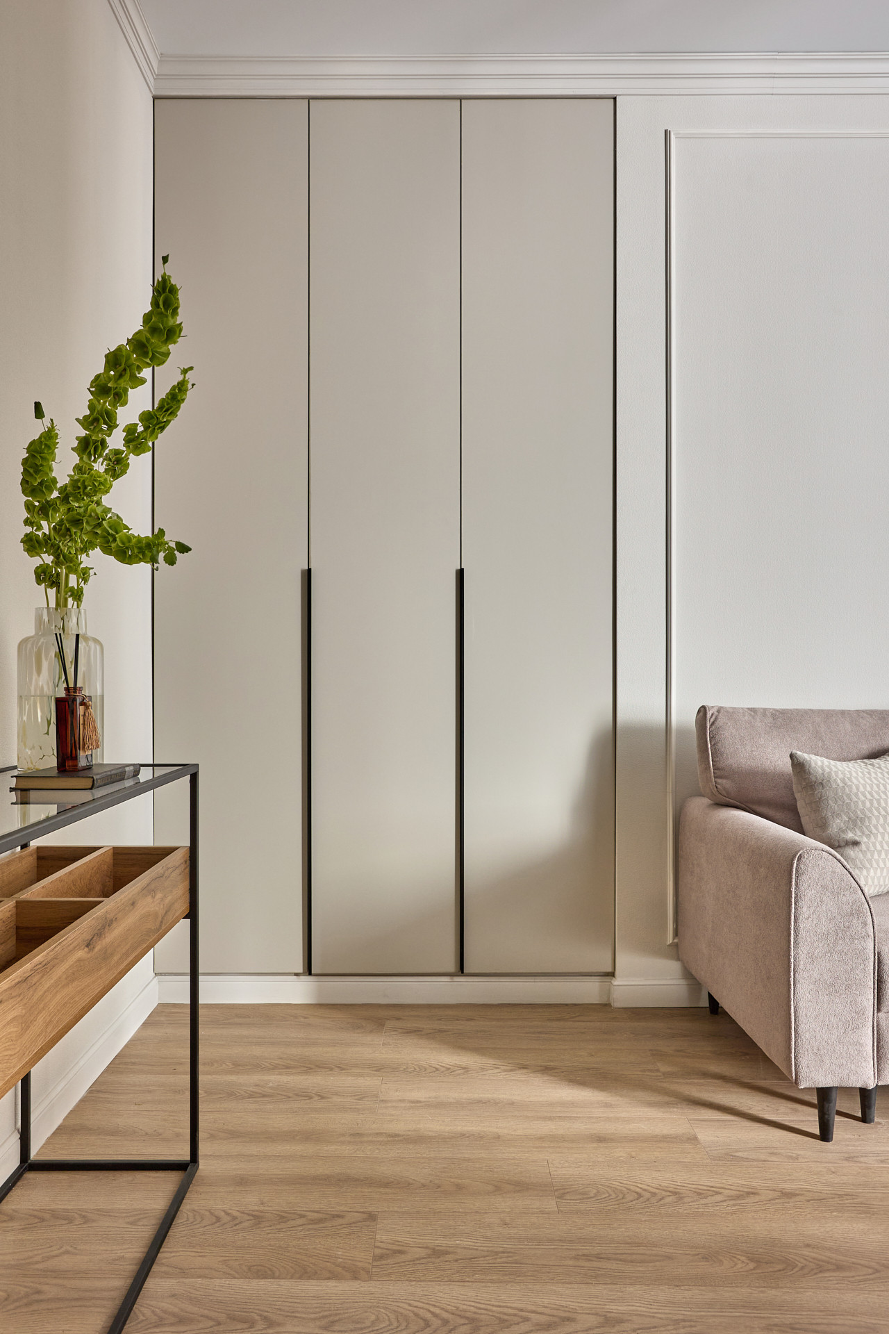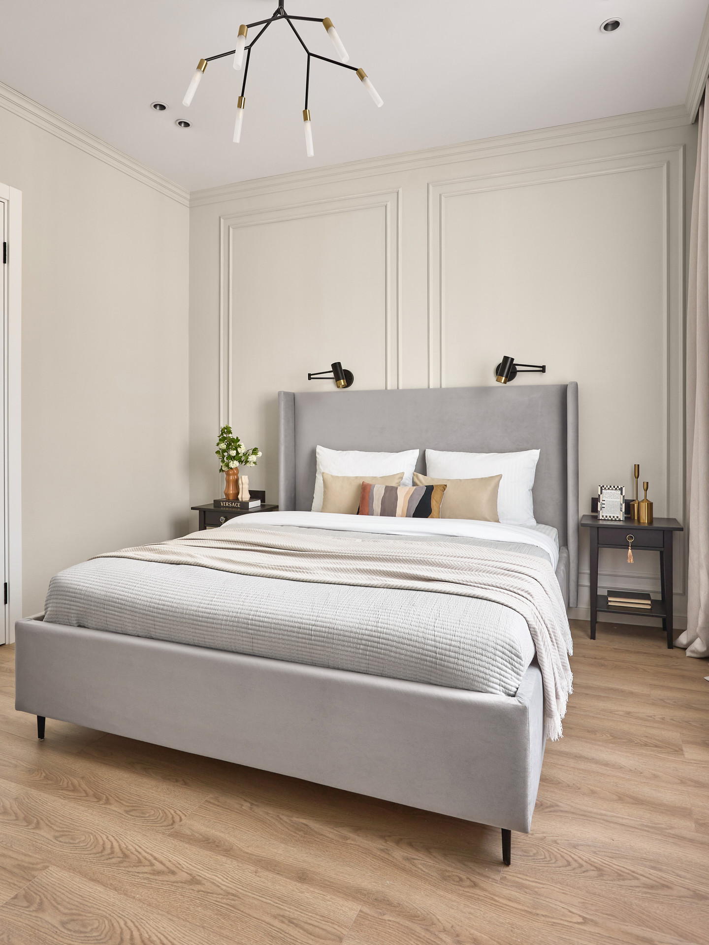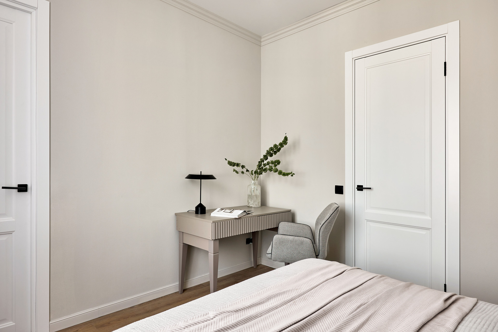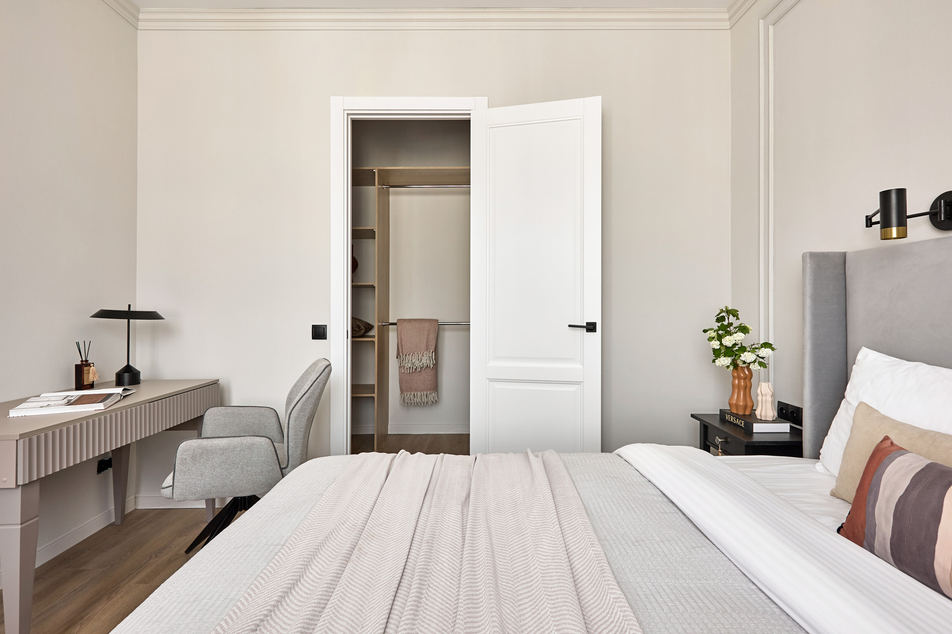 Кровать с высоким мягким изголовьем оборудована подъемным механизмом, позволяющим с удобством использовать место под кроватью в качестве дополнительной зоны хранения. Гардеробная позволит свободно разместить одежду и обувь, а также выделить хозяйственную зону для пылесоса, гладильной доски, чемоданов и других крупногабаритных предметов.