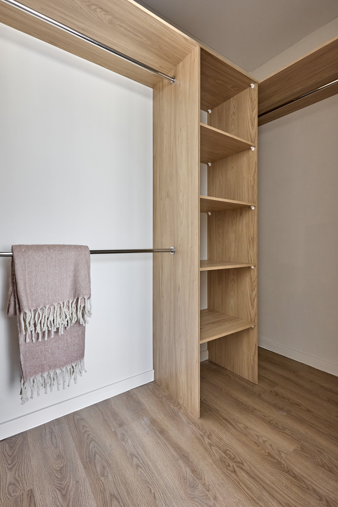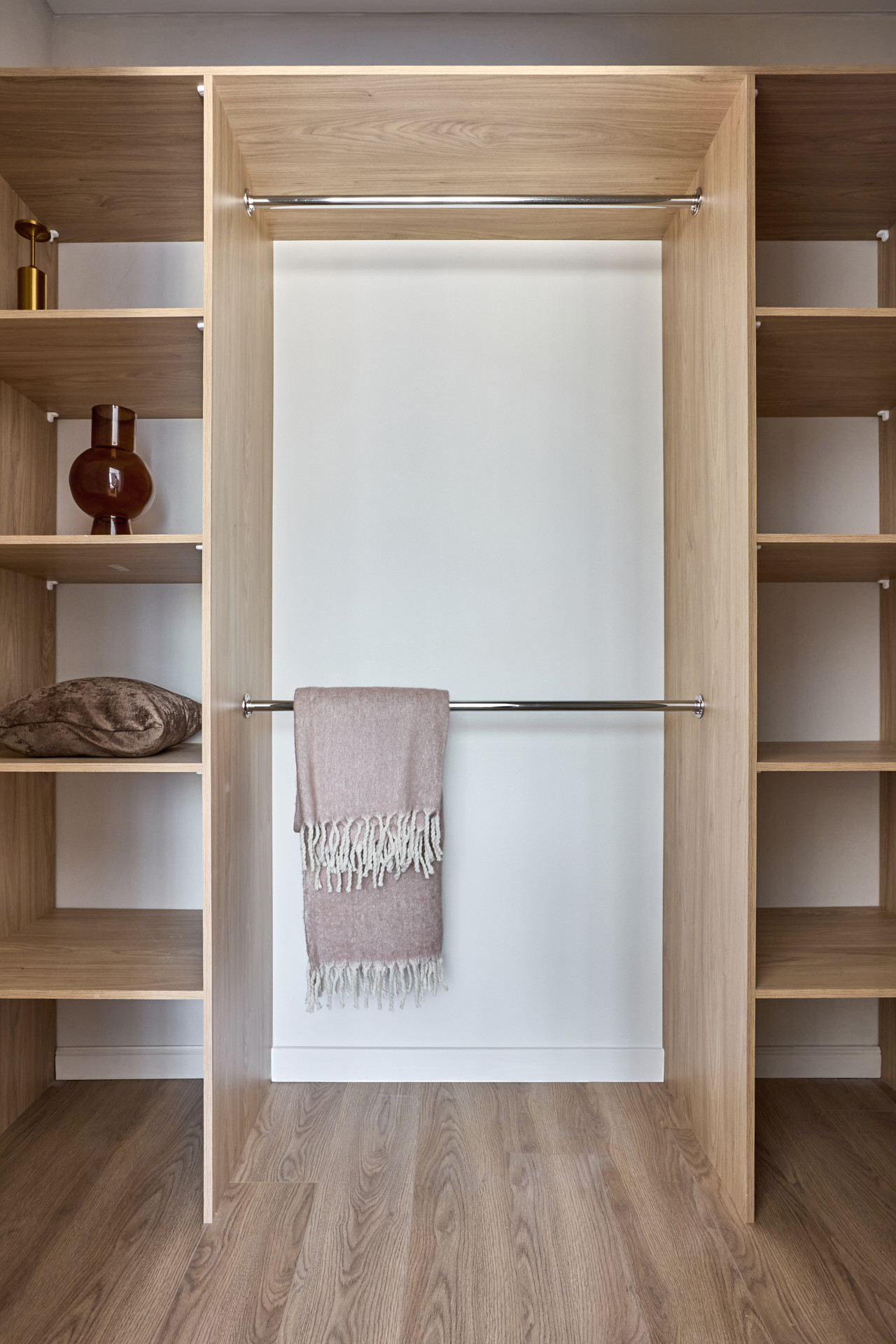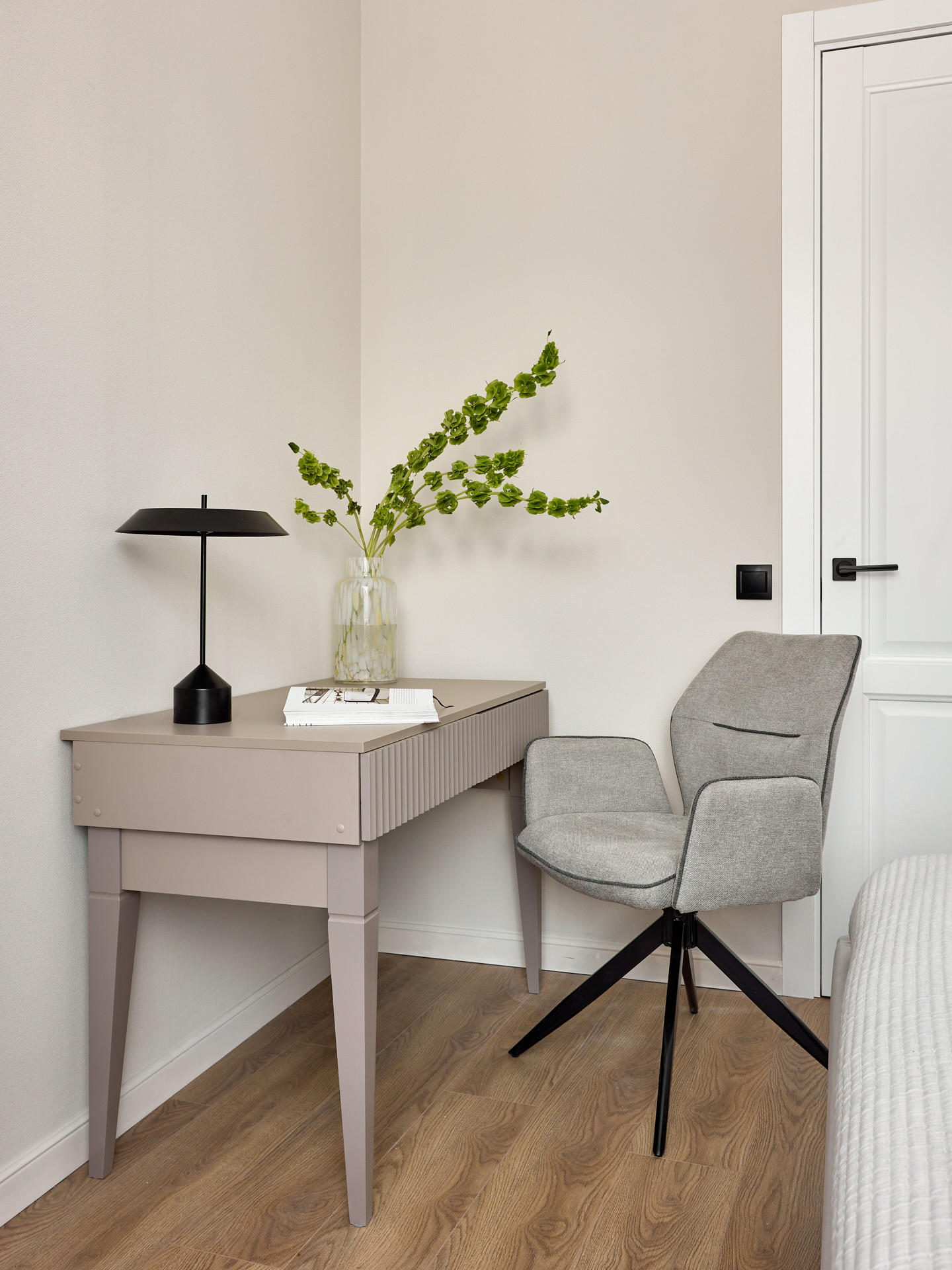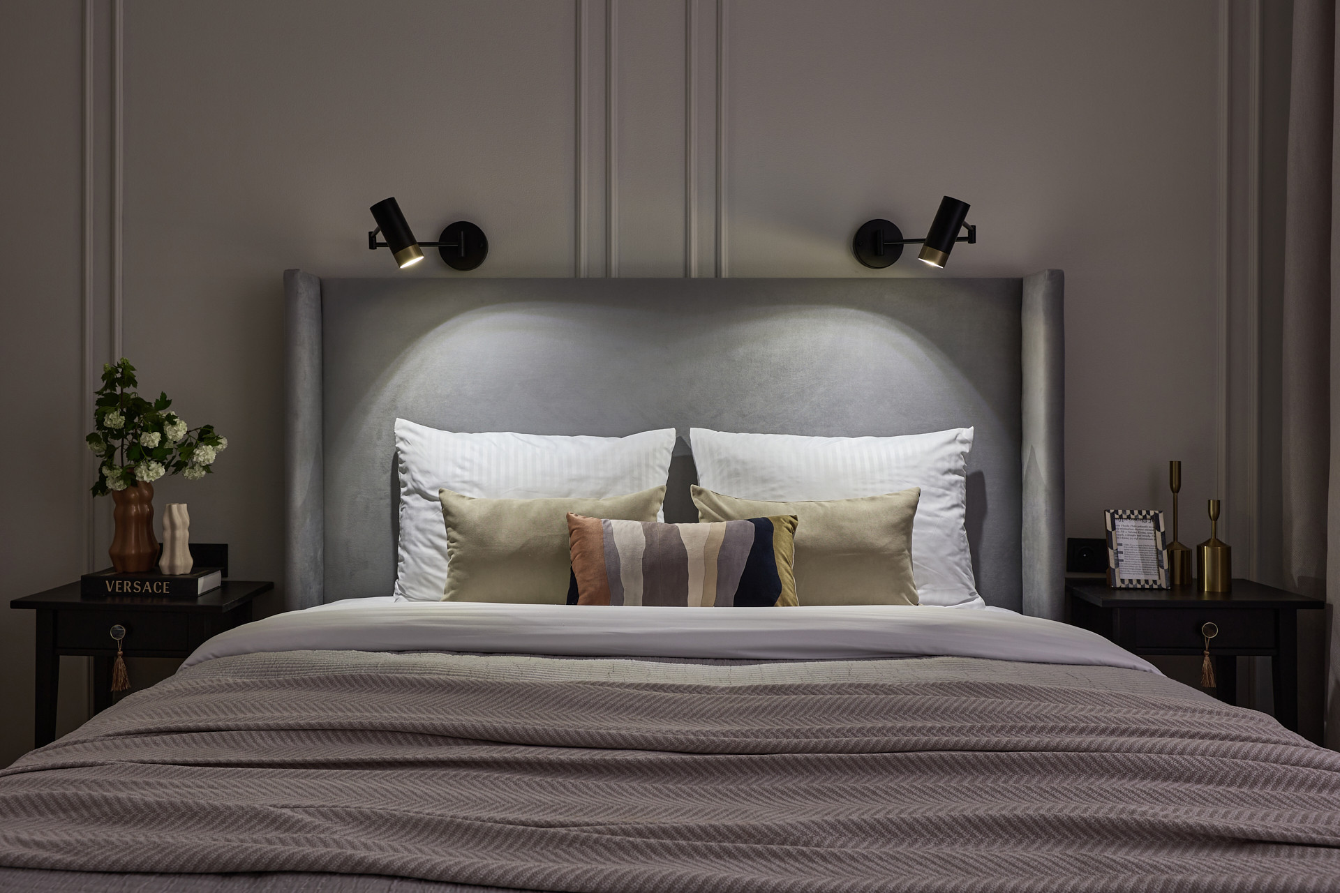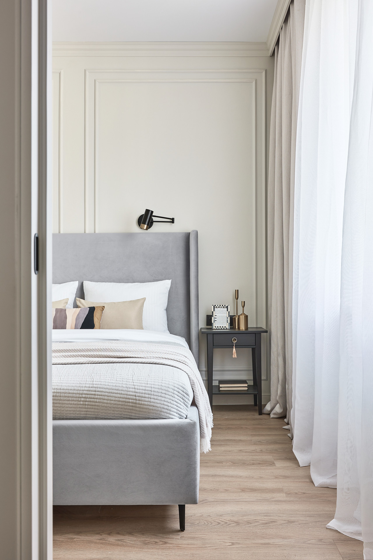 Кровать с высоким мягким изголовьем оборудована подъемным механизмом, позволяющим с удобством использовать место под кроватью в качестве дополнительной зоны хранения. Гардеробная позволит свободно разместить одежду и обувь, а также выделить хозяйственную зону для пылесоса, гладильной доски, чемоданов и других крупногабаритных предметов.